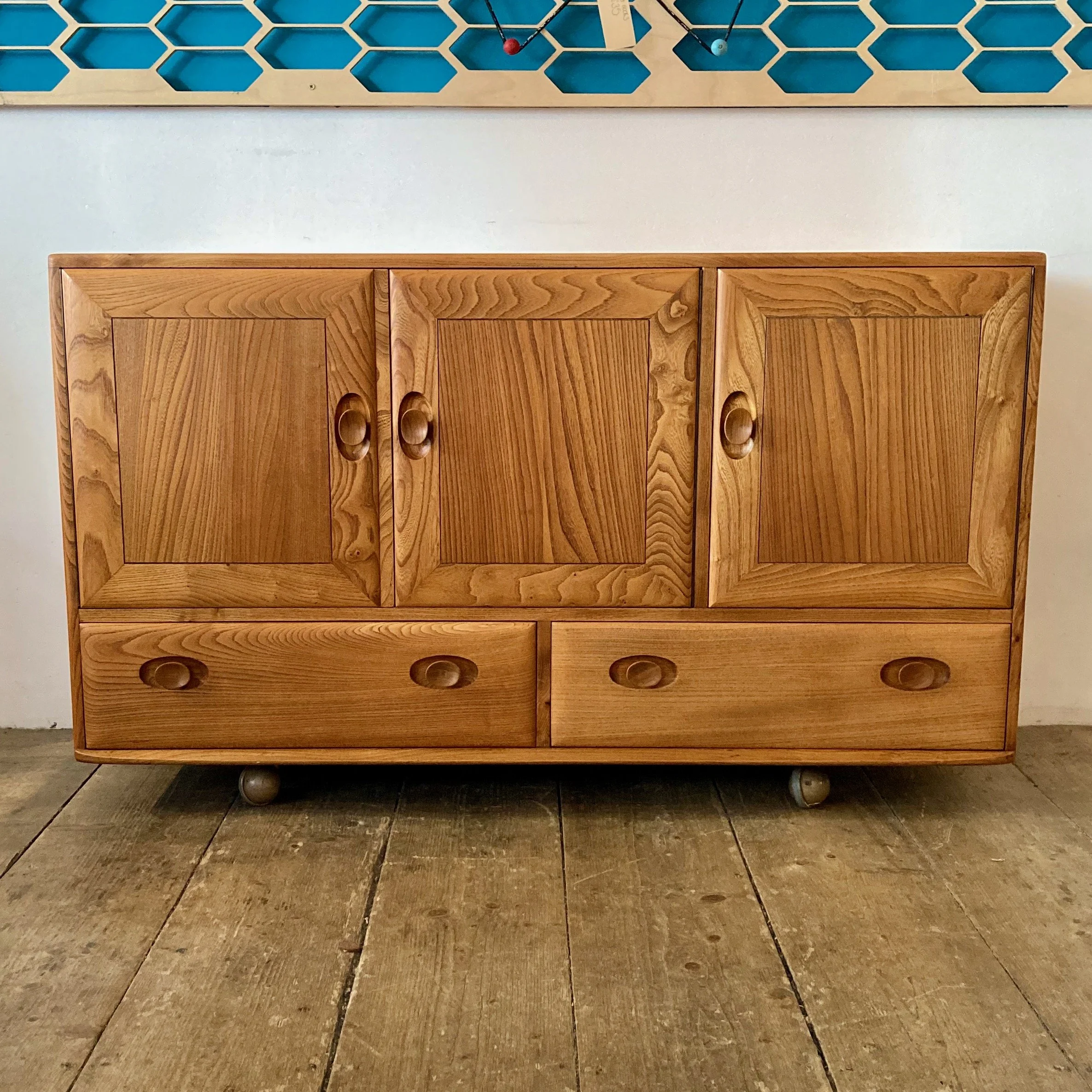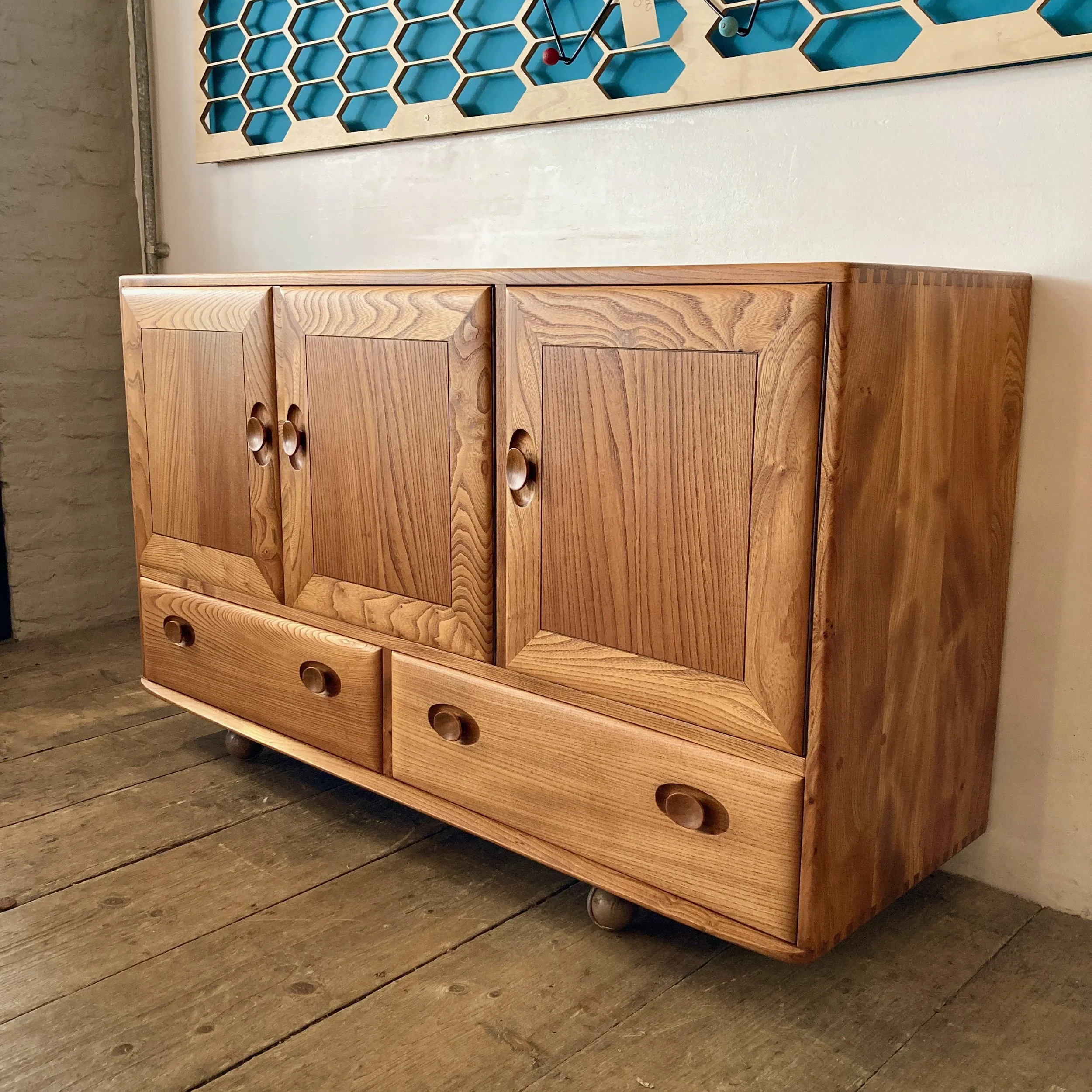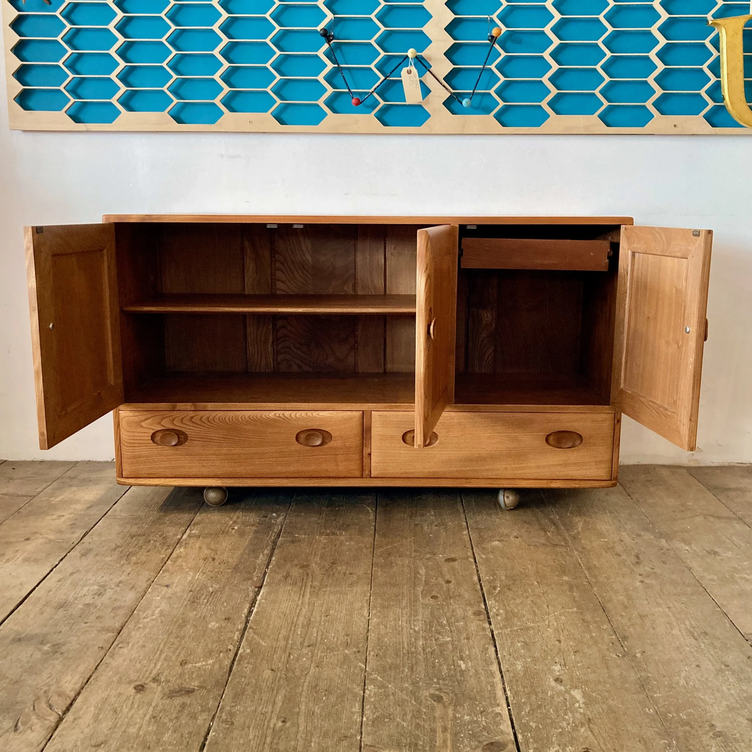A beautifully restored elm model 468 sideboard by Ercol, dating from the 1970s. This timeless piece showcases the brand’s signature craftsmanship, with elegant oval-shaped handles and a warm, rich grain.