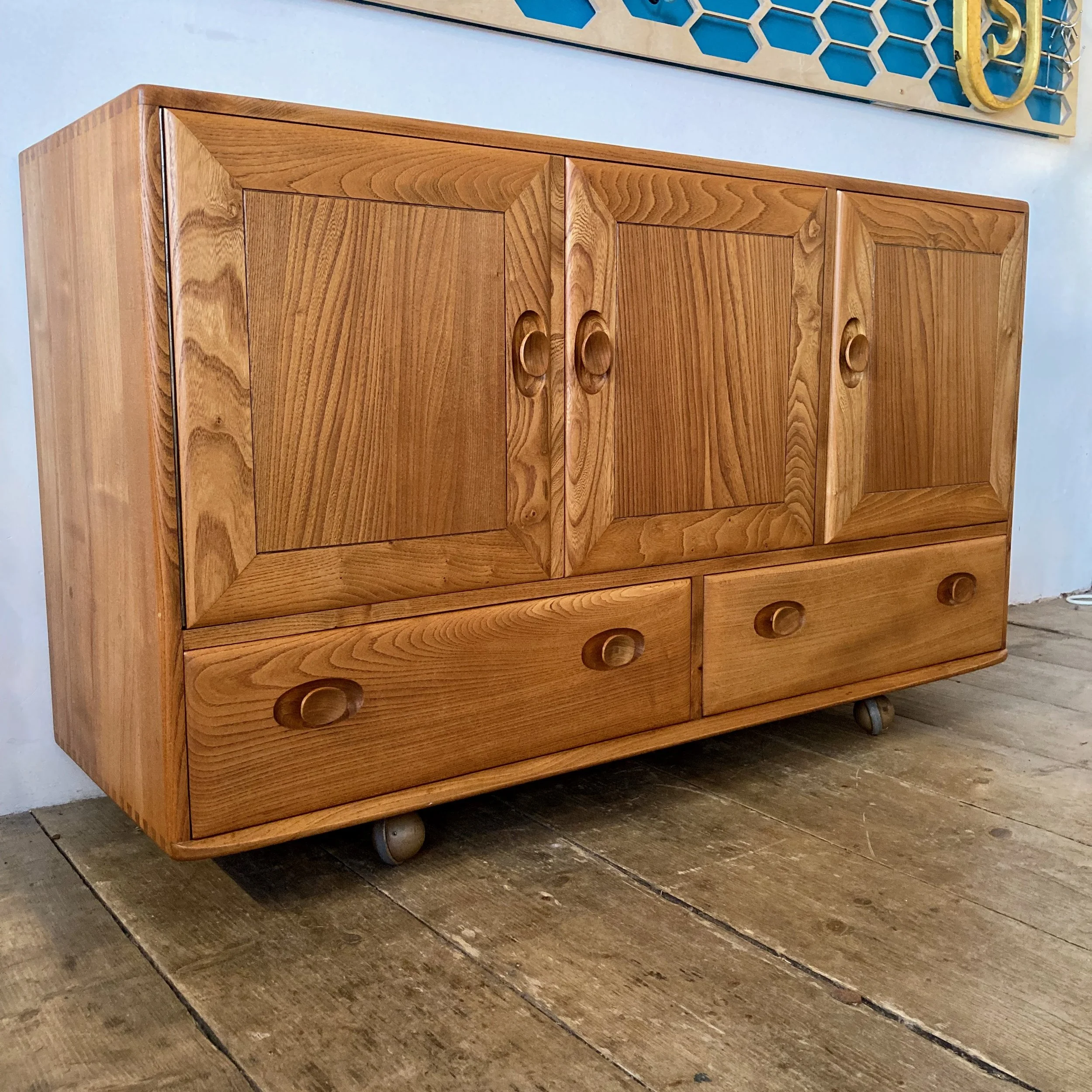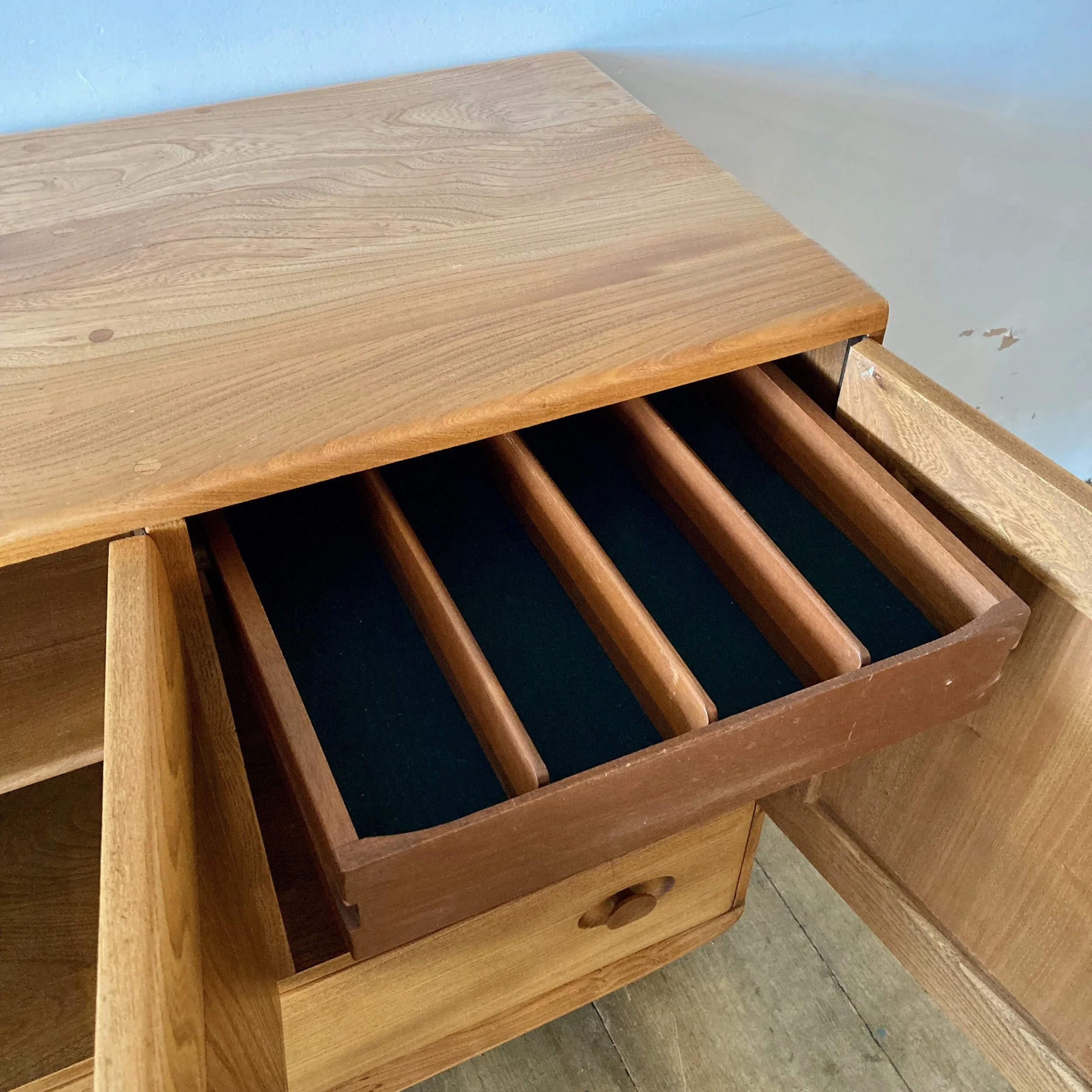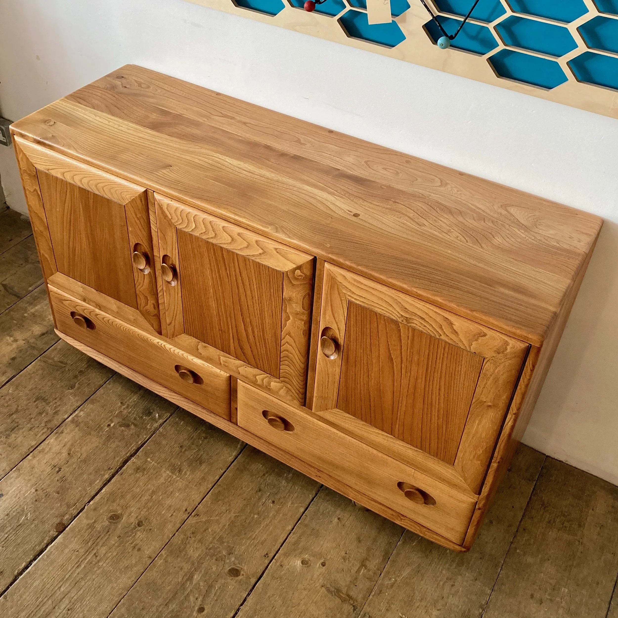 A beautifully restored elm model 468 sideboard by Ercol, dating from the 1970s. This timeless piece showcases the brand’s signature craftsmanship, with elegant oval-shaped handles and a warm, rich grain.
