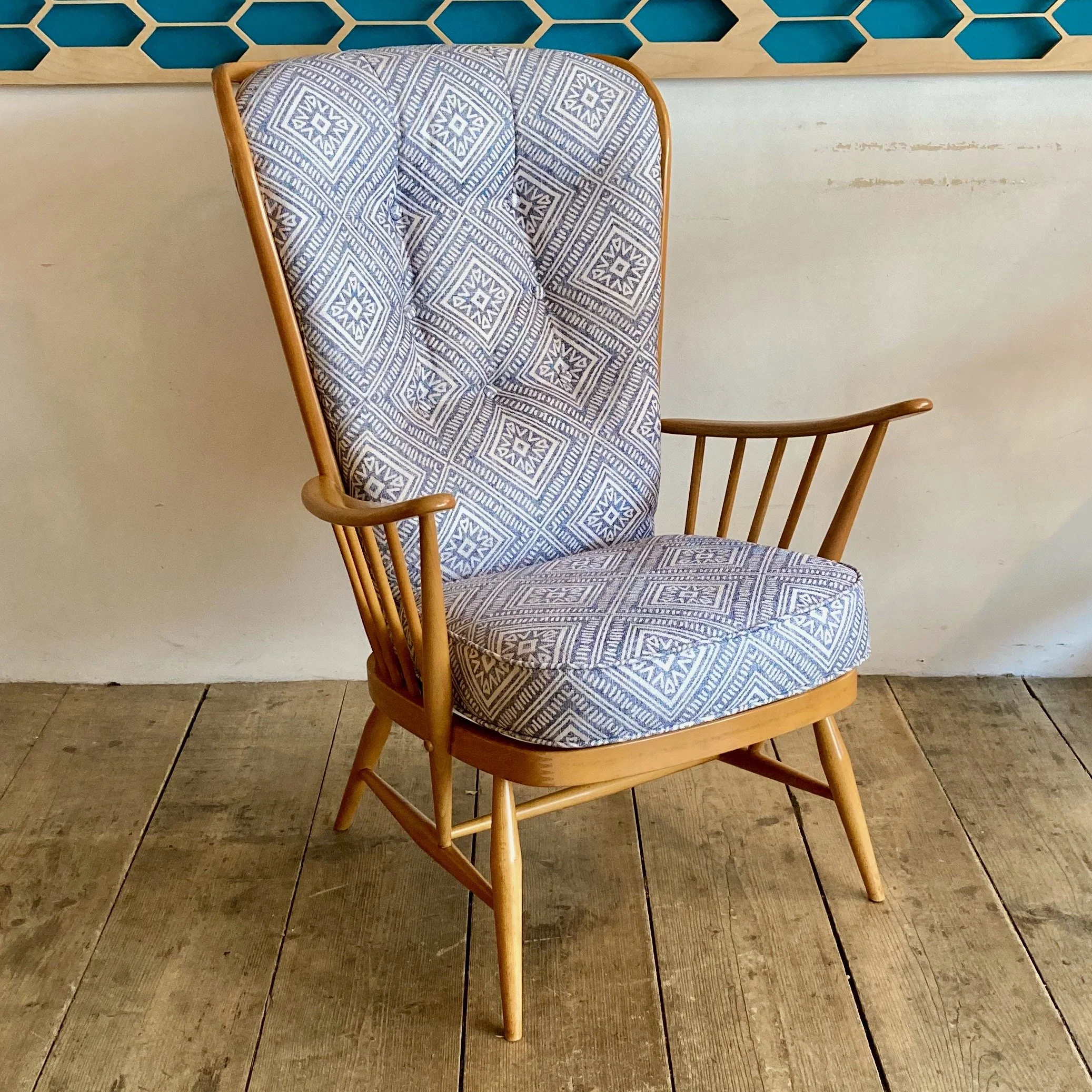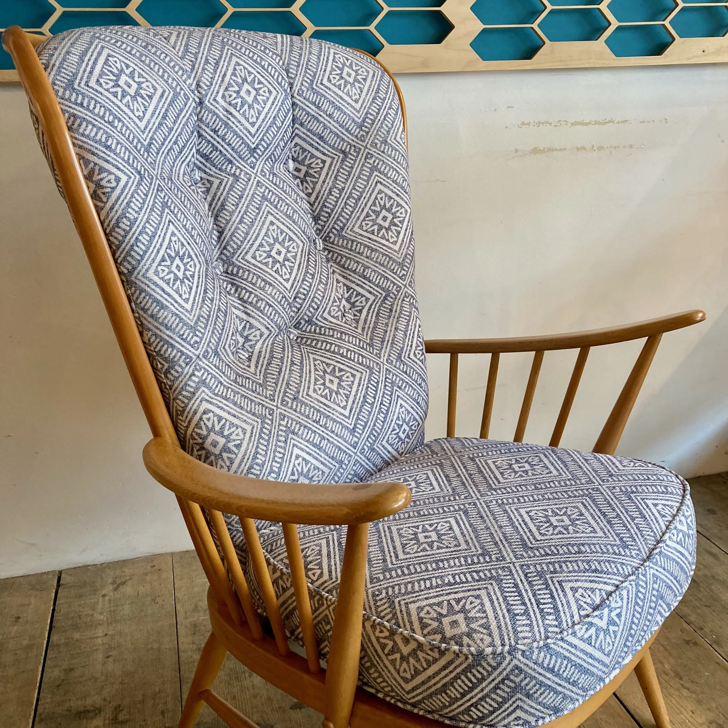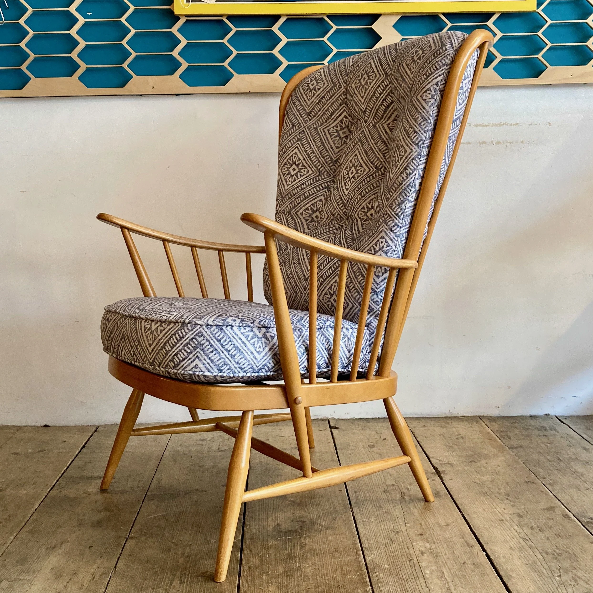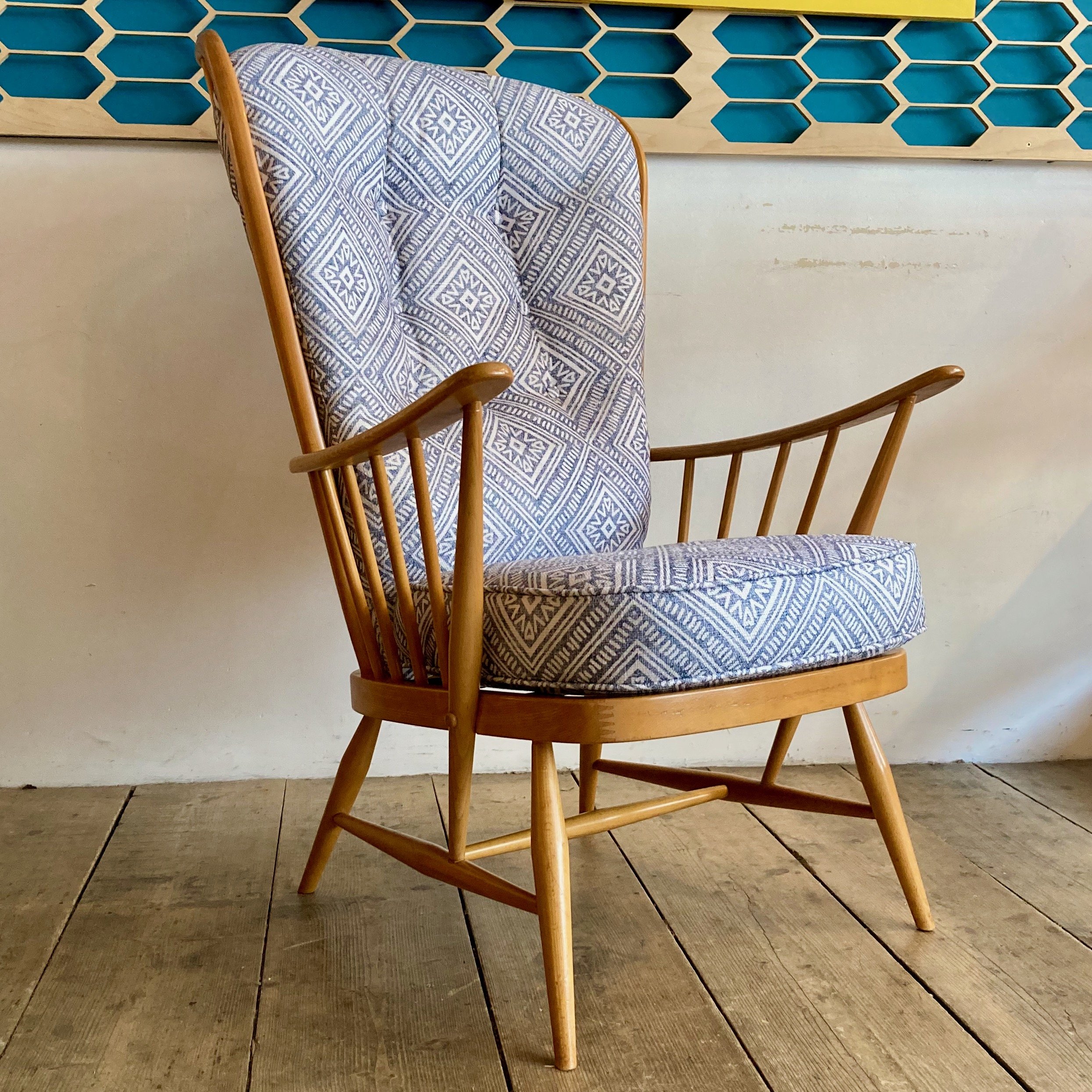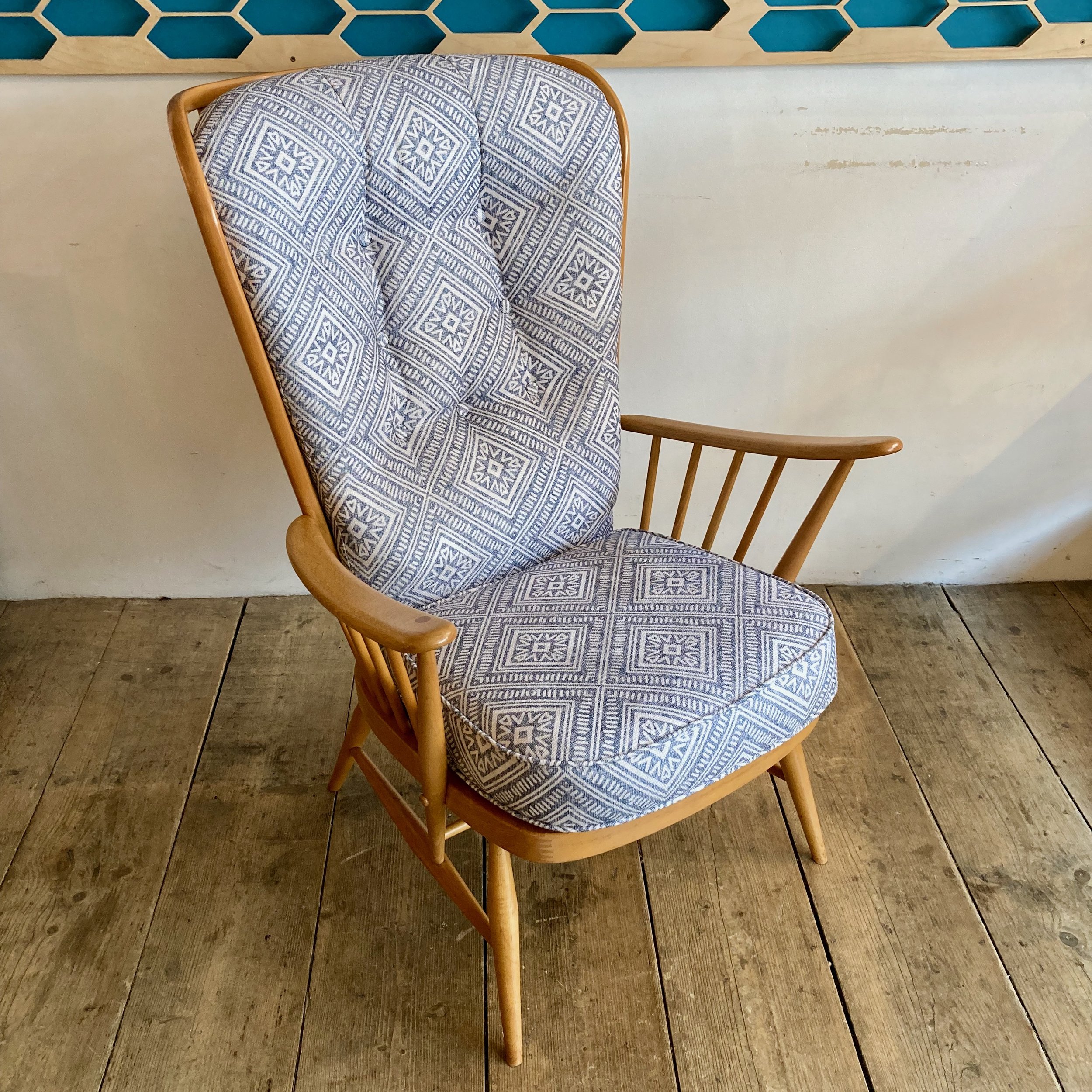A classic 1980s Ercol Windsor “Evergreen” easy chair (Model 835), combining comfort with the brand’s signature craftsmanship. This generously proportioned armchair has been fully refurbished and reupholstered in a soft patterned fabric, giving it a fresh look while retaining its original character.