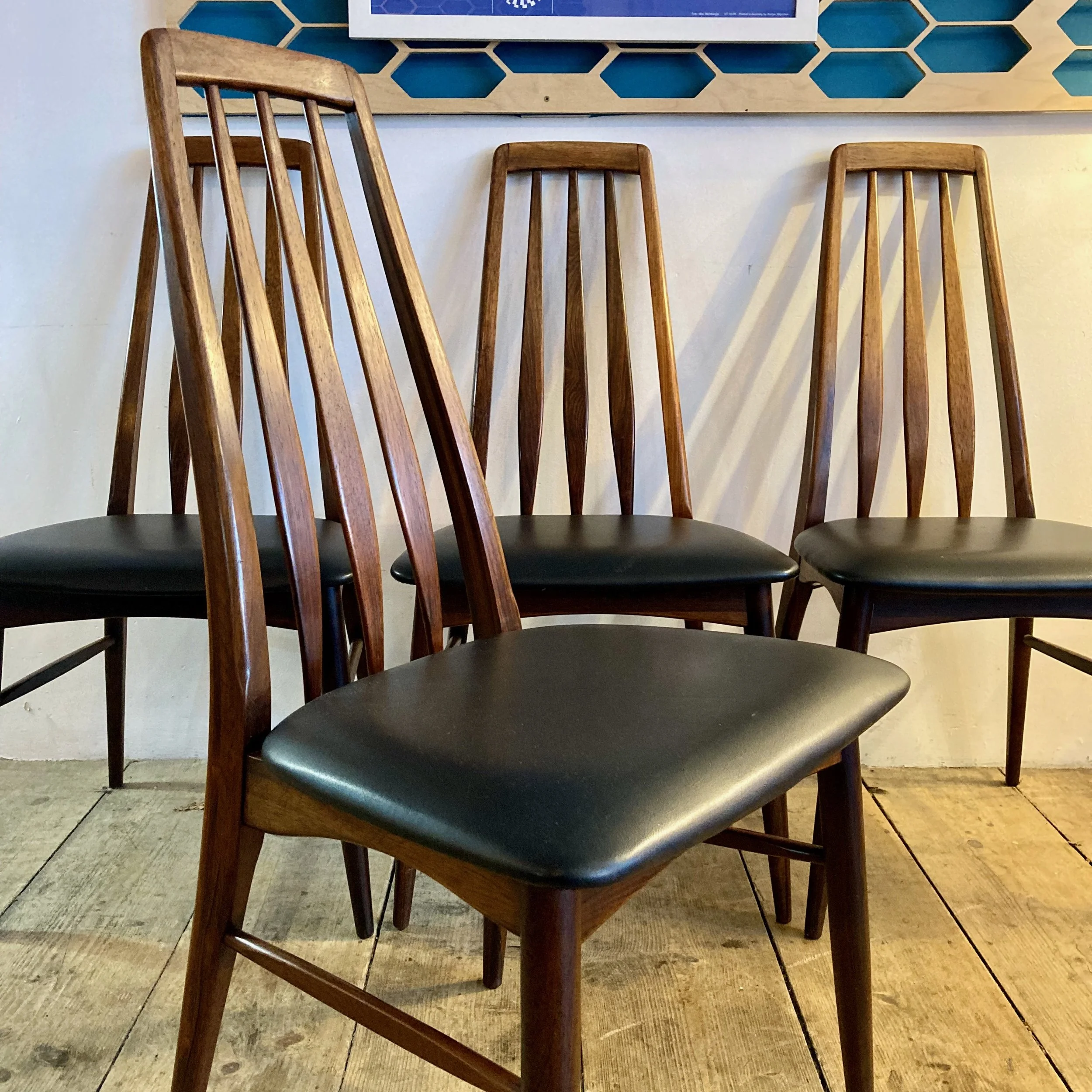 This sleek and elegant set of four dining chairs was designed by renowned Danish furniture designer Niels Koefoed, celebrated for his refined Scandinavian craftsmanship. Made from richly toned rosewood, these chairs retain their original black vinyl seats and remain in excellent original condition — a rare and highly desirable find for collectors of authentic mid-century Danish design. Perfect for adding sophistication to any dining space.