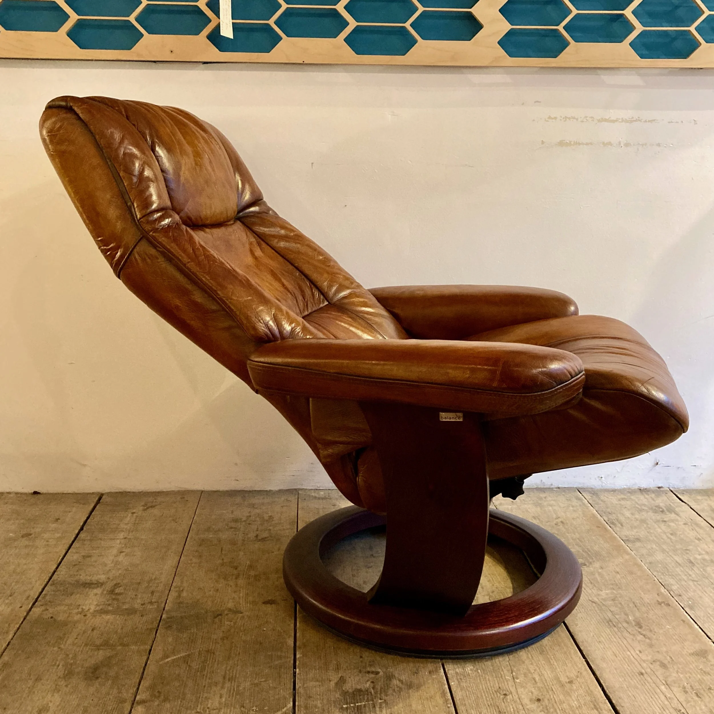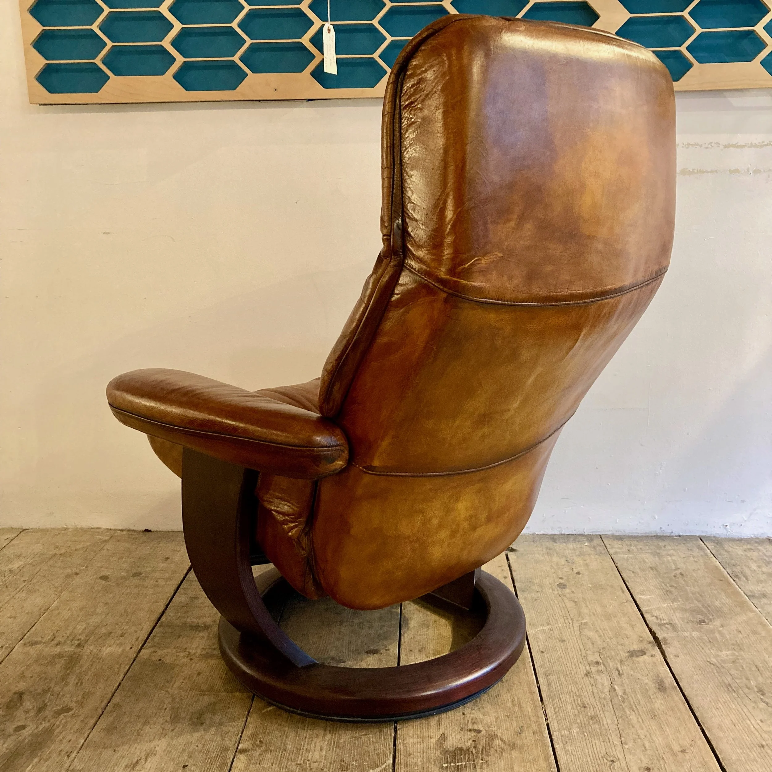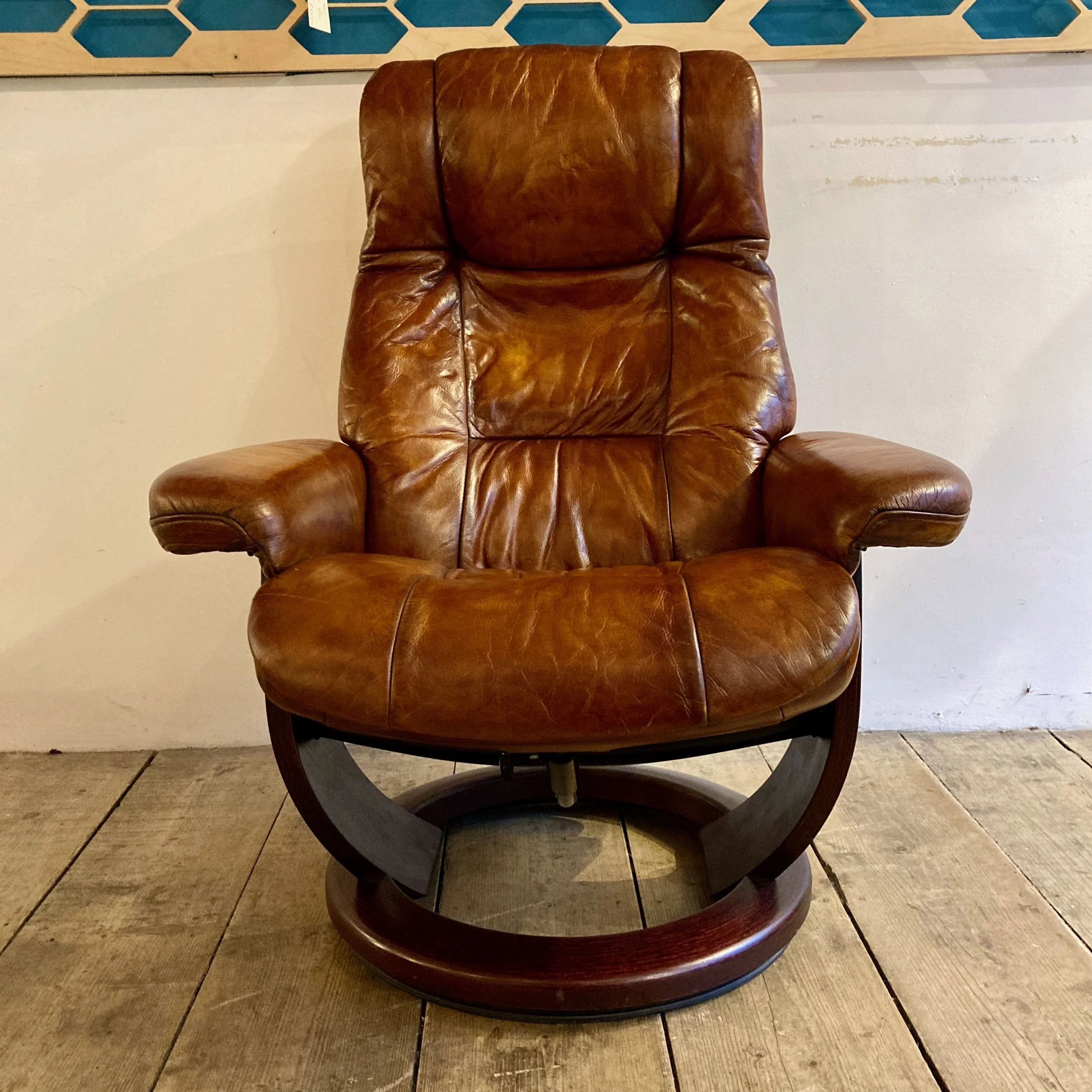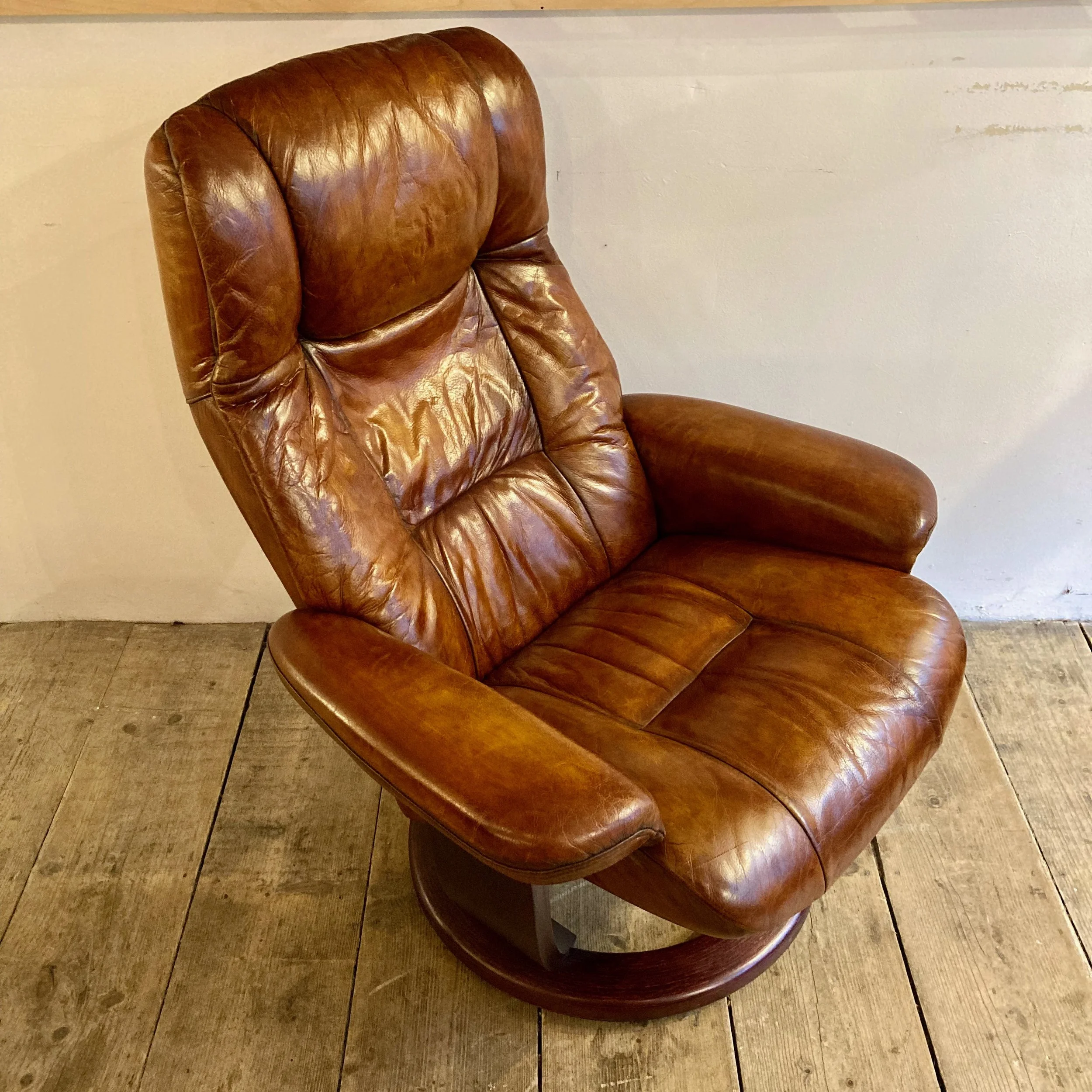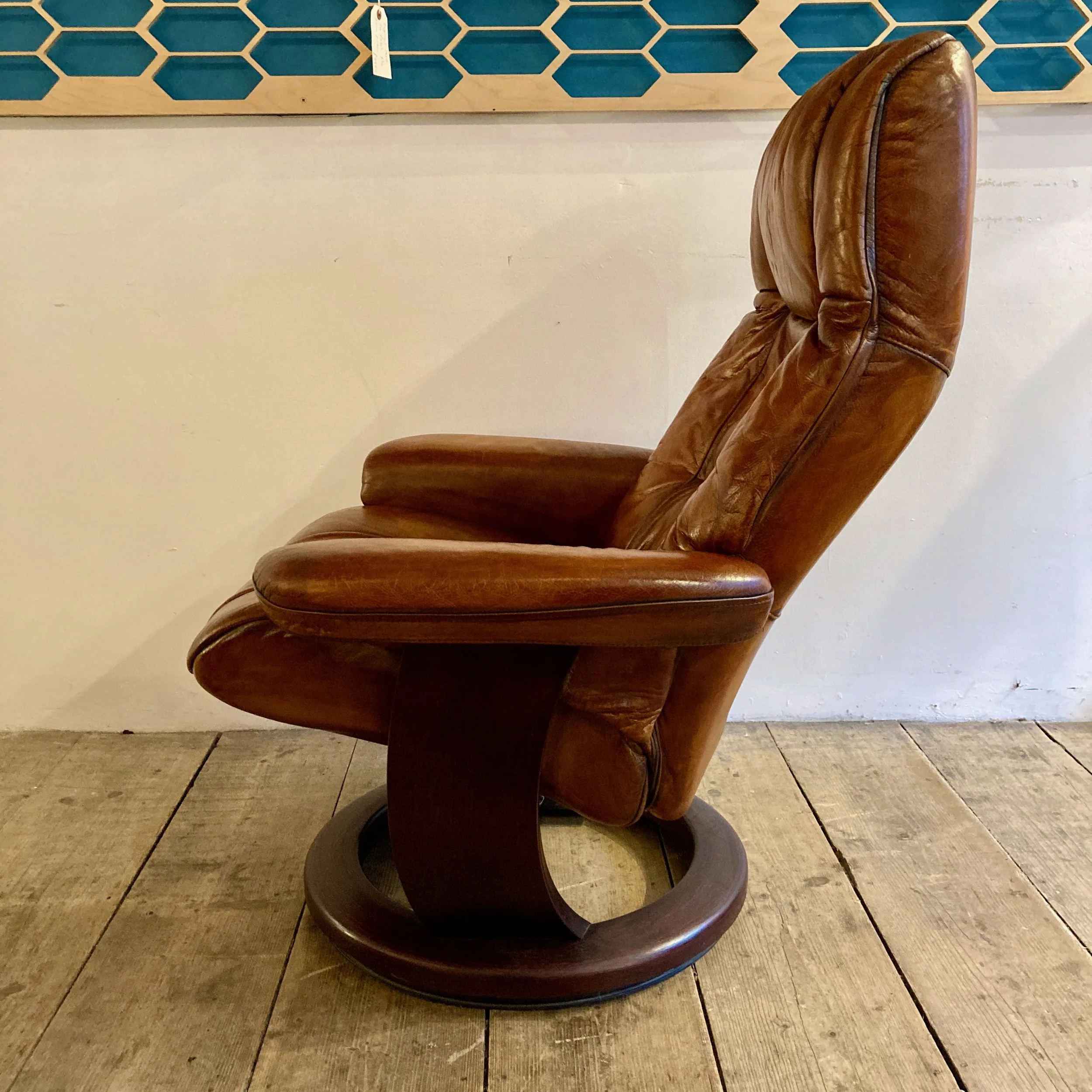 A beautifully restored 1970s Ekornes reclining armchair in rich cognac leather, offering exceptional comfort and timeless Scandinavian design.