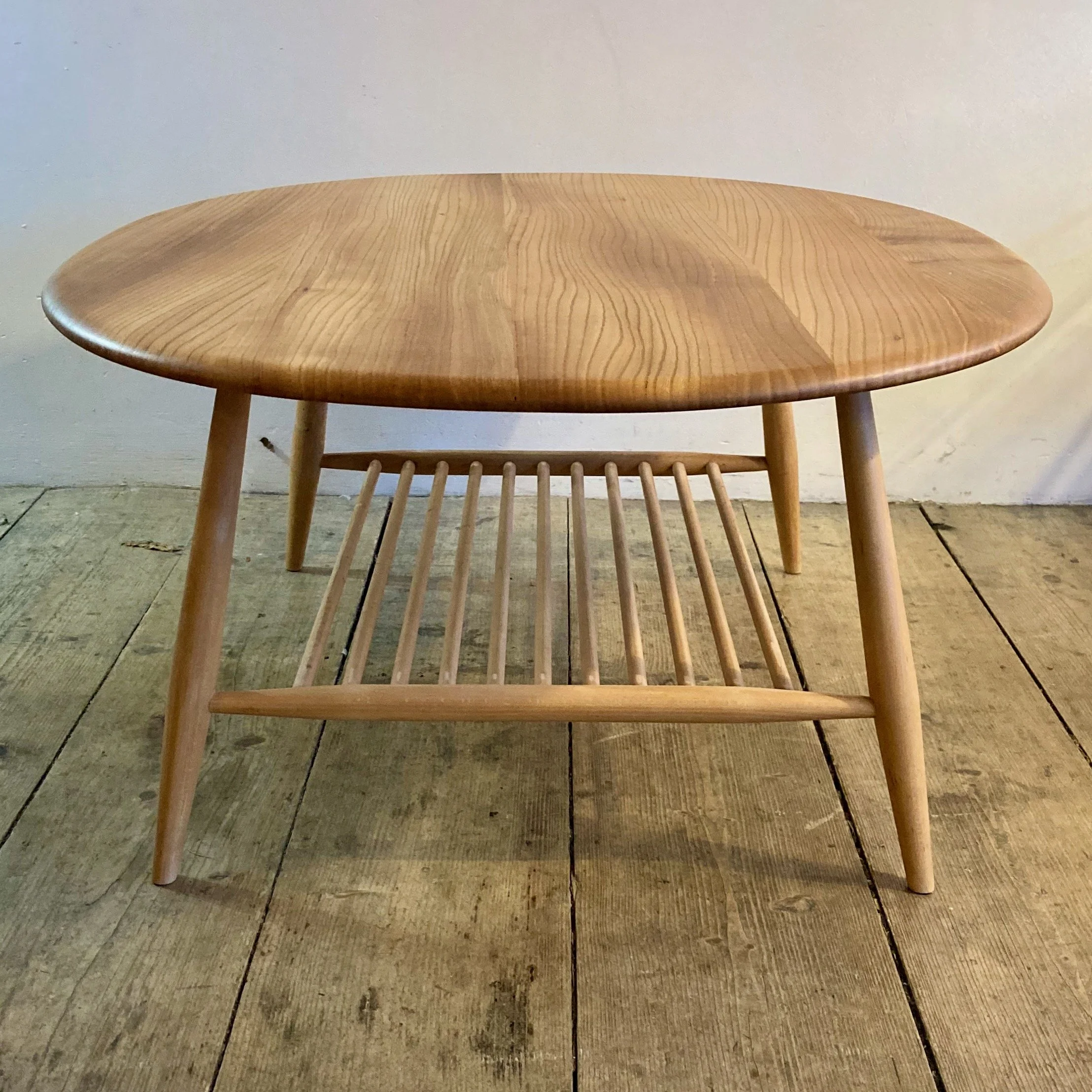 A 1970s oval Ercol coffee table, beautifully restored and showcasing the classic craftsmanship that defines Ercol’s mid-century designs. The table features a solid elm top with its distinctive grain, supported by a sturdy beech frame. Beneath, an integrated magazine rack adds practical storage without compromising the table’s light, elegant silhouette.