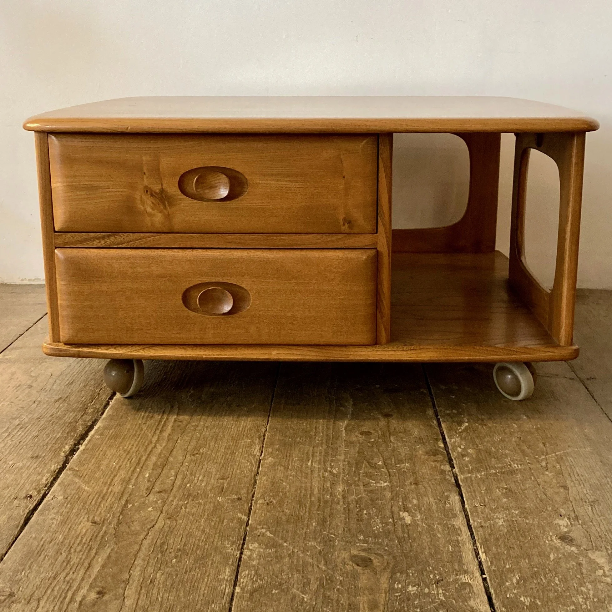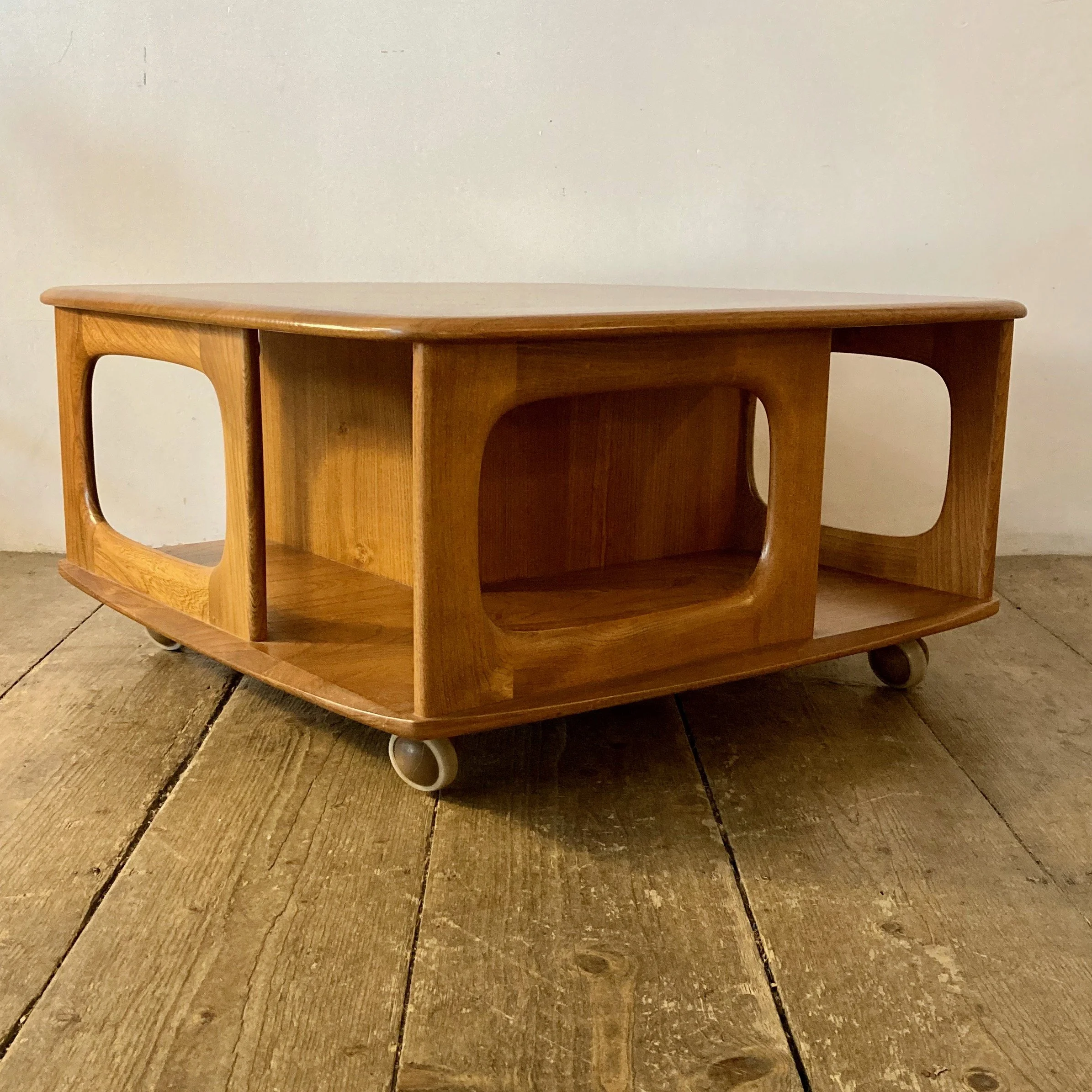 A sought-after 1970s Ercol ‘Pandora’s Box’ coffee table (Model 735), crafted in solid elm and presented in excellent original condition. This iconic mid-century design is known for its clean lines, practical storage, and beautifully grained timber.