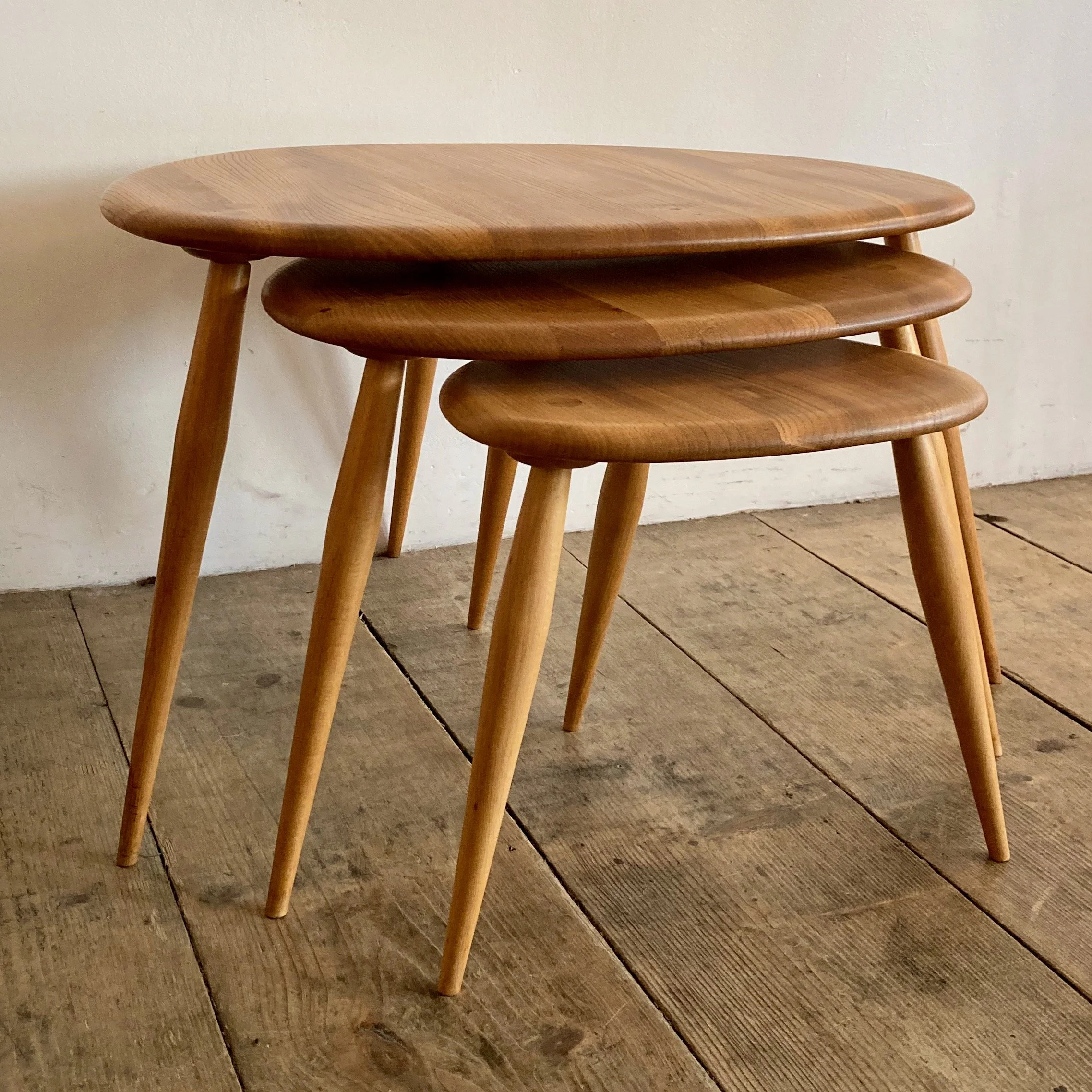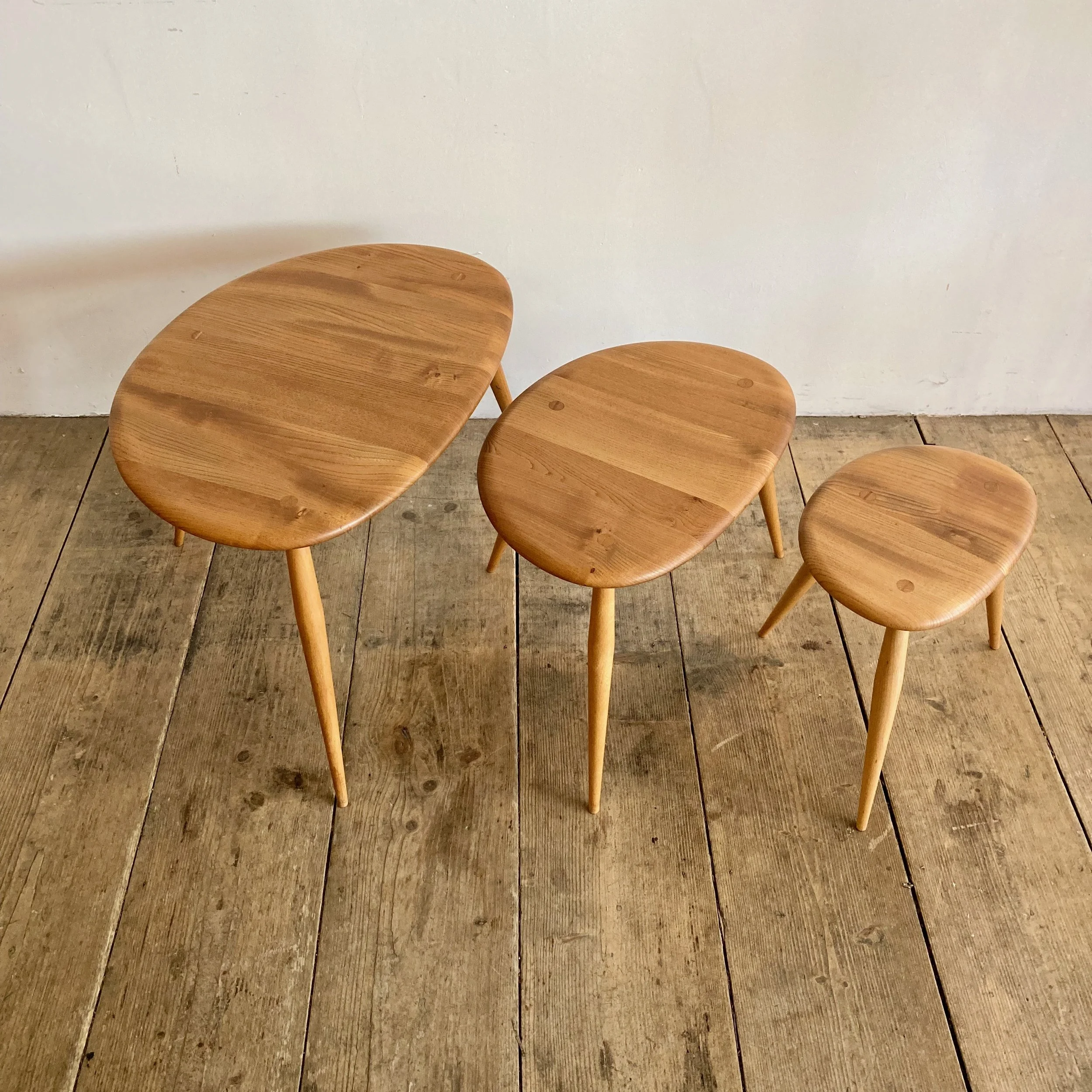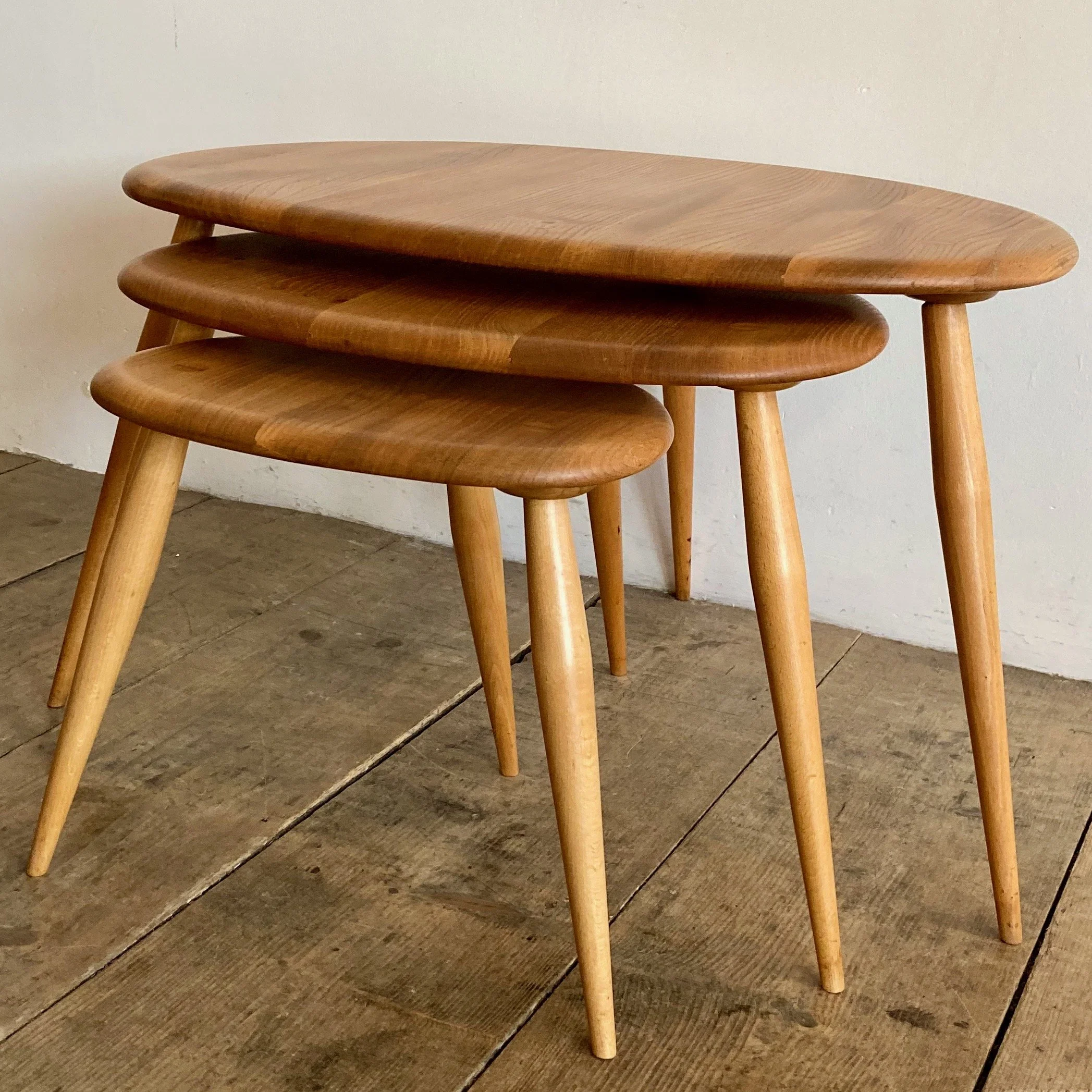A restored set of 1970s Ercol pebble nest tables, featuring elegant sculpted elm tops and solid beech legs. This iconic mid-century design is a true Ercol classic, perfect for adding warmth, character and practicality to any living space.