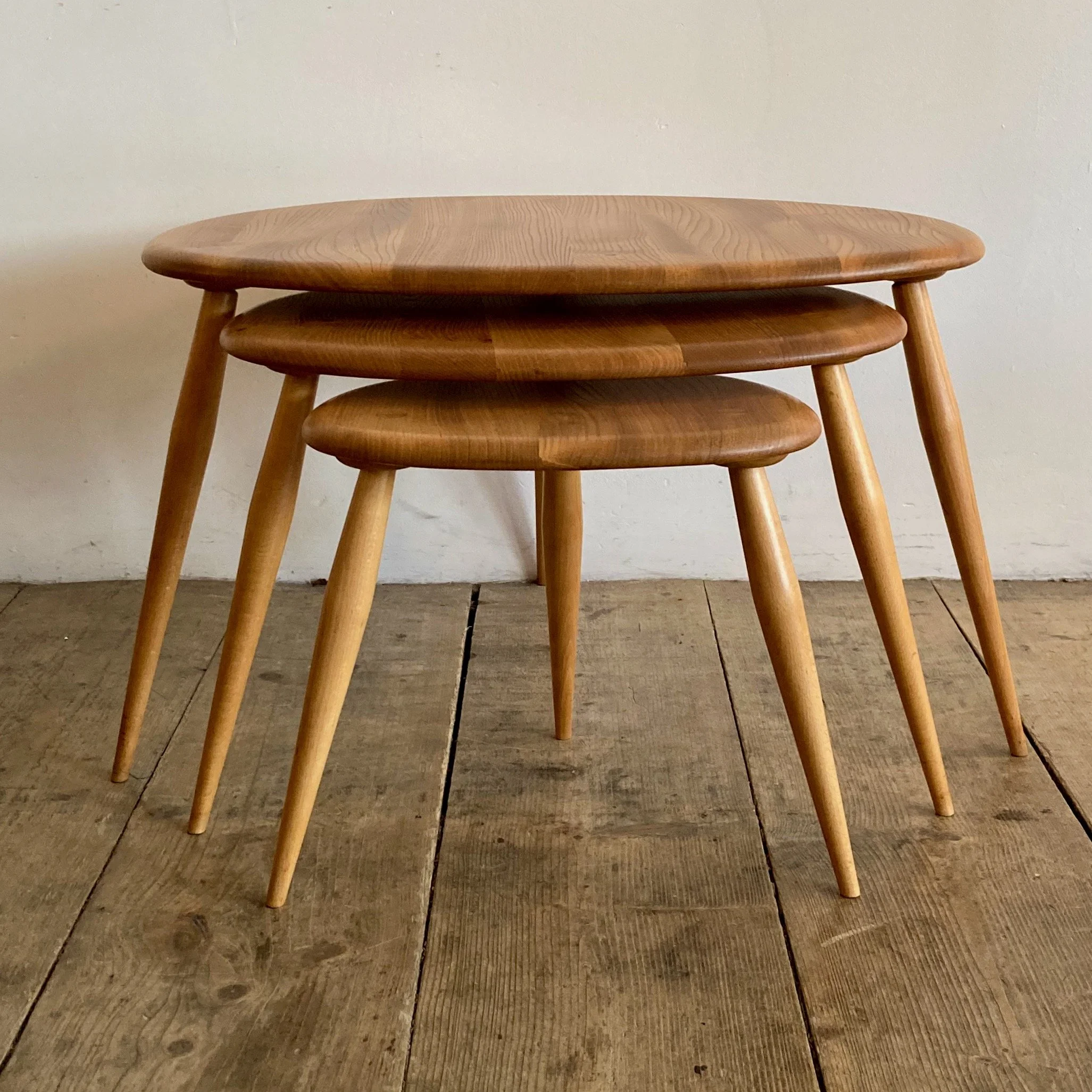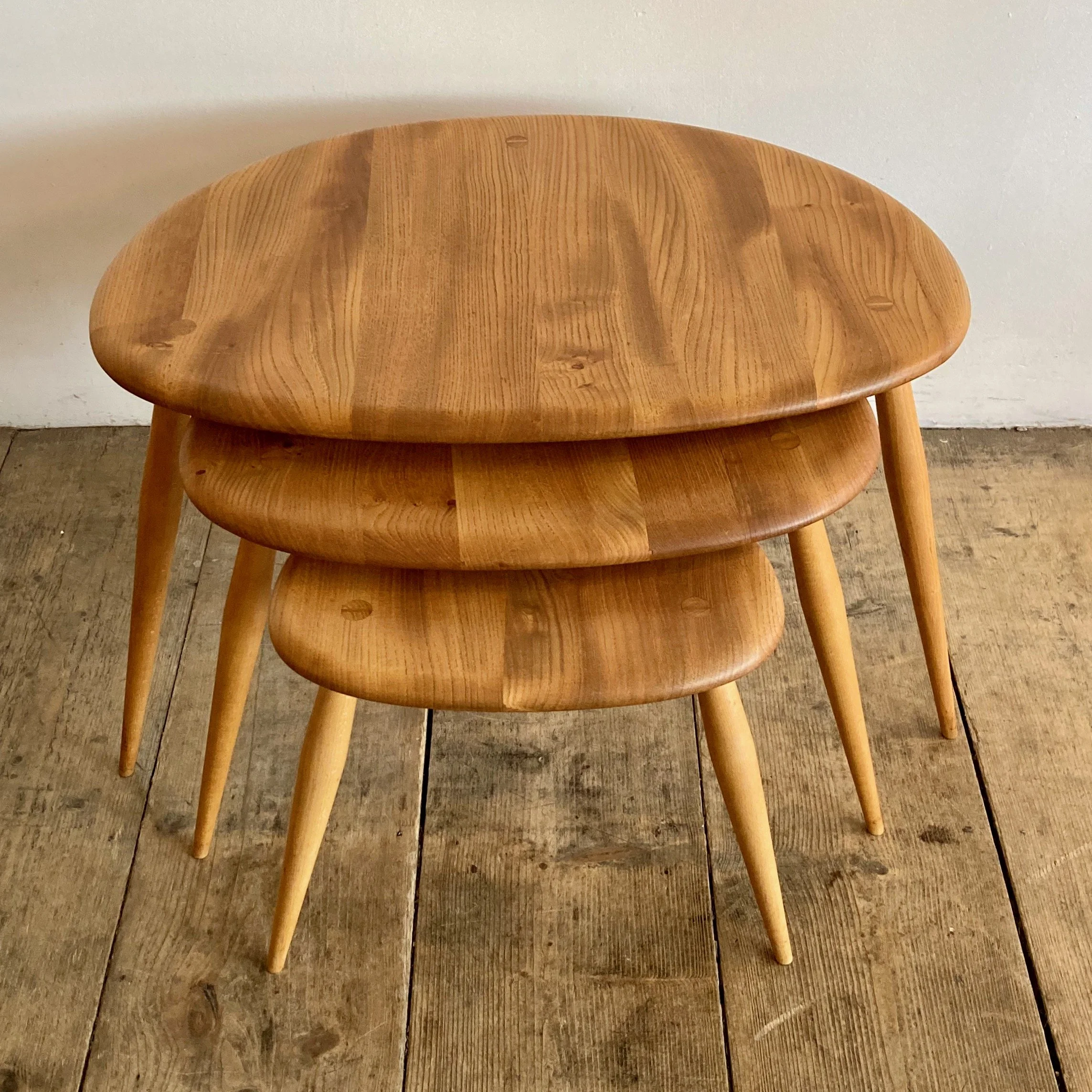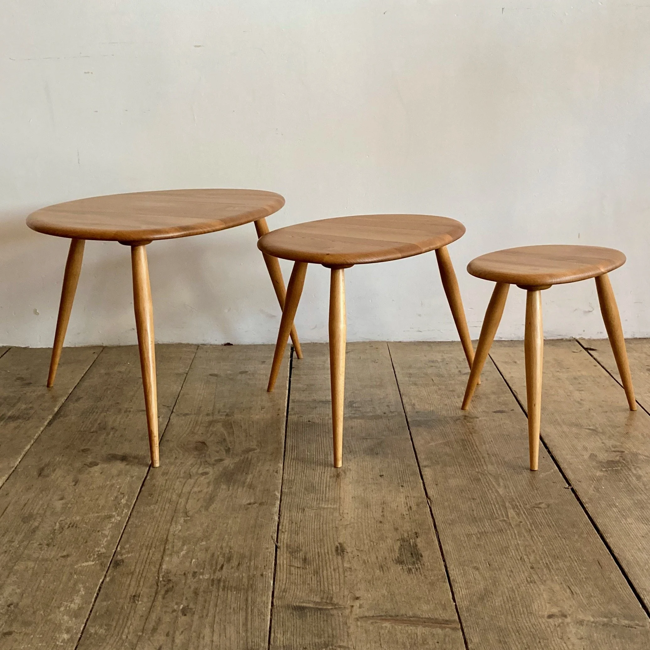 A restored set of 1970s Ercol pebble nest tables, featuring elegant sculpted elm tops and solid beech legs. This iconic mid-century design is a true Ercol classic, perfect for adding warmth, character and practicality to any living space.