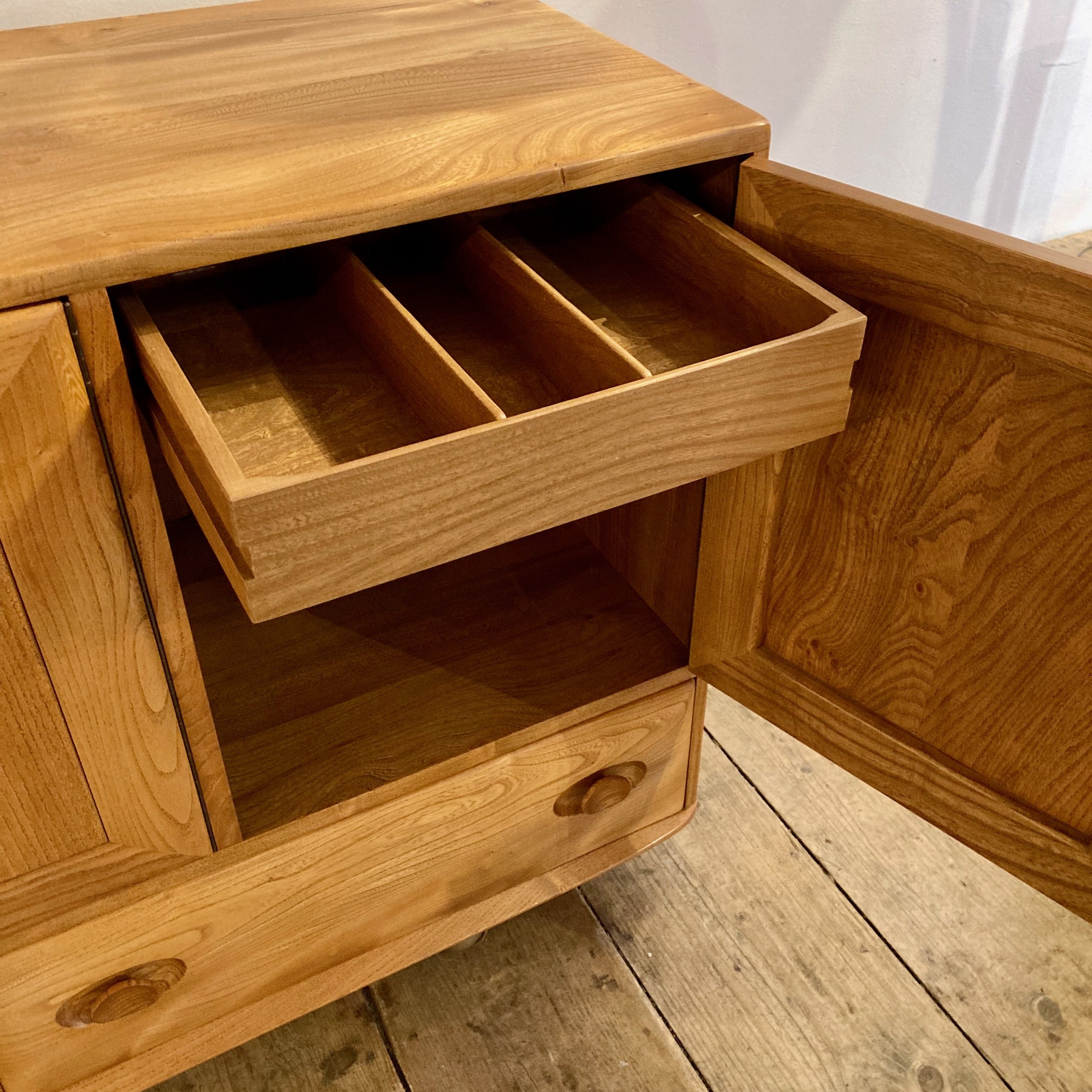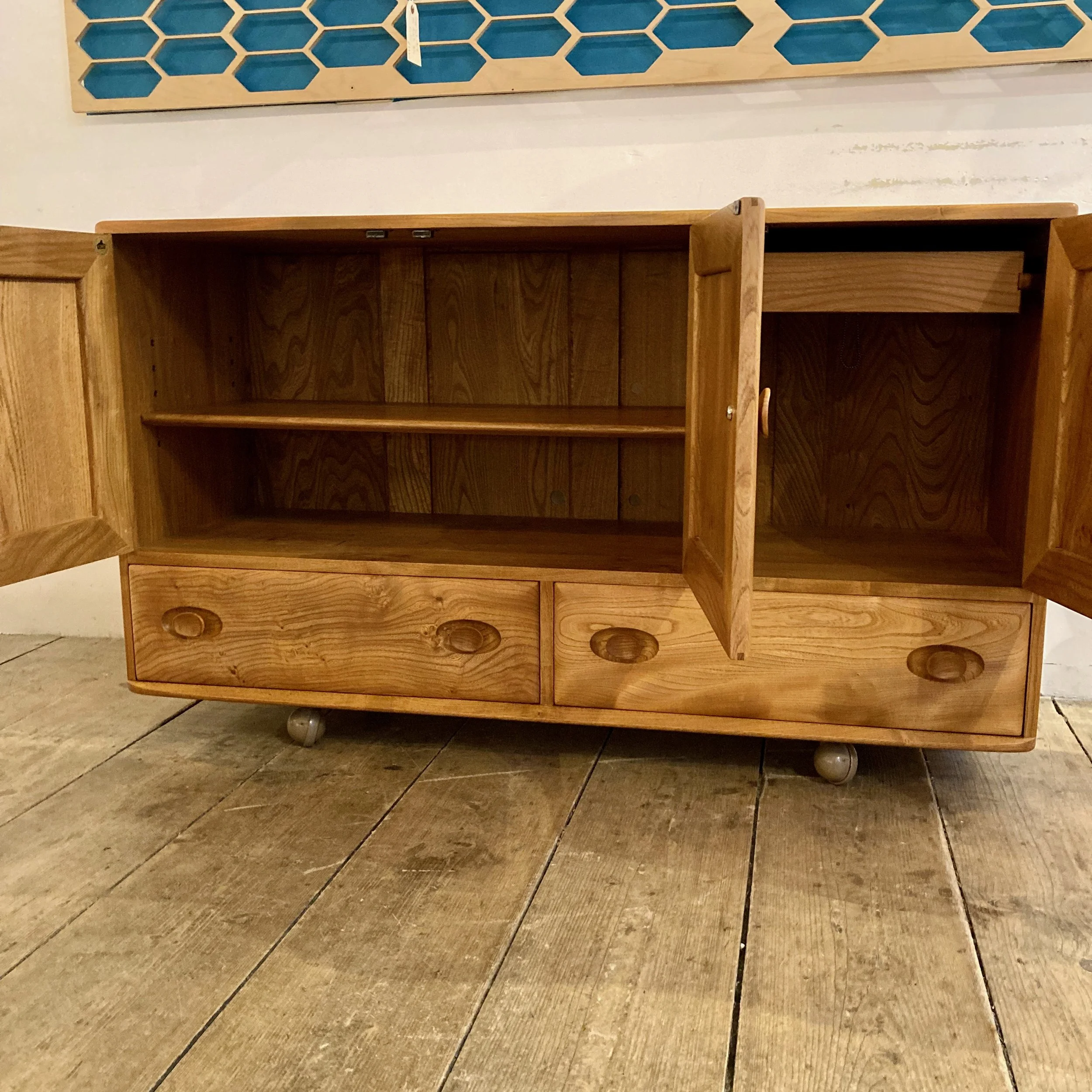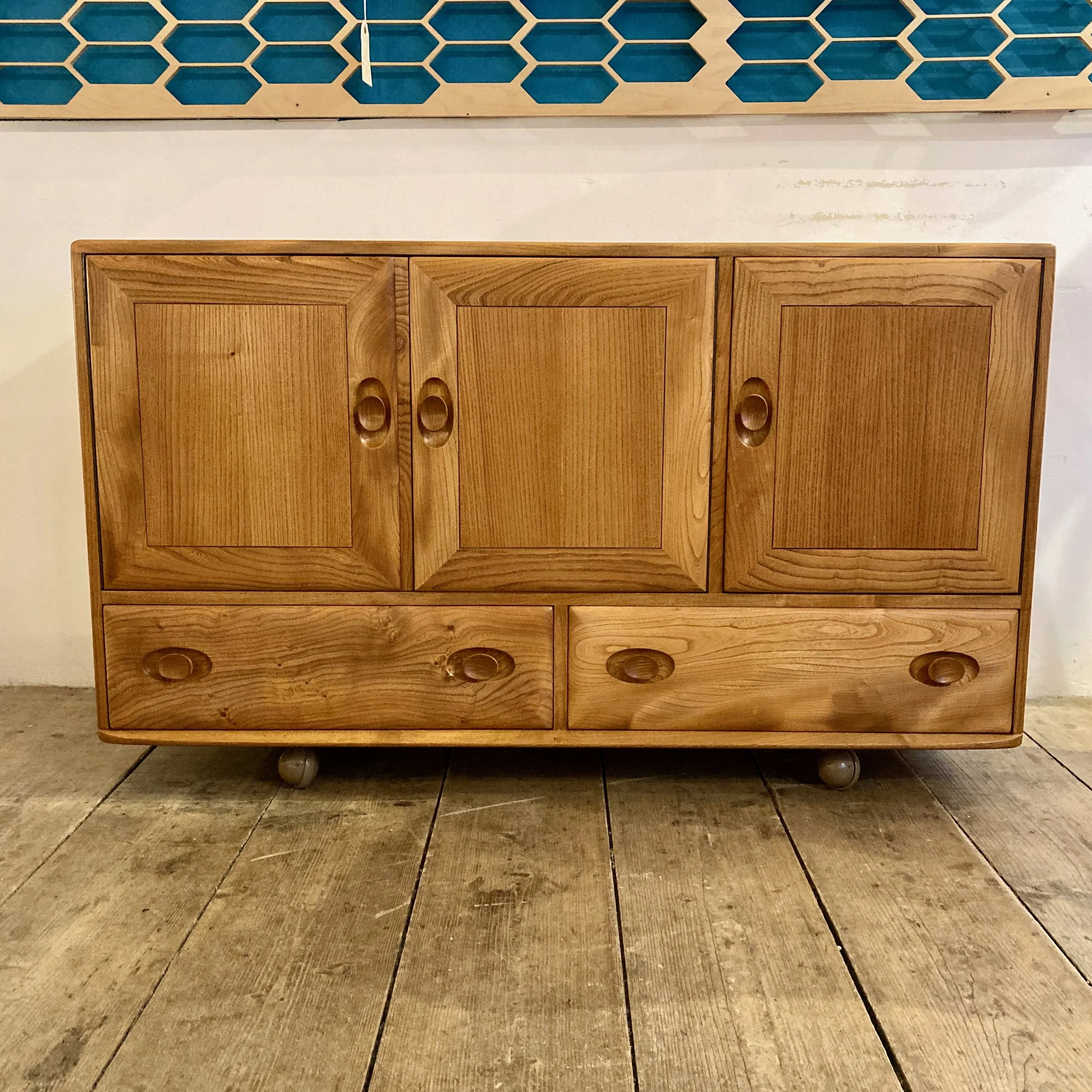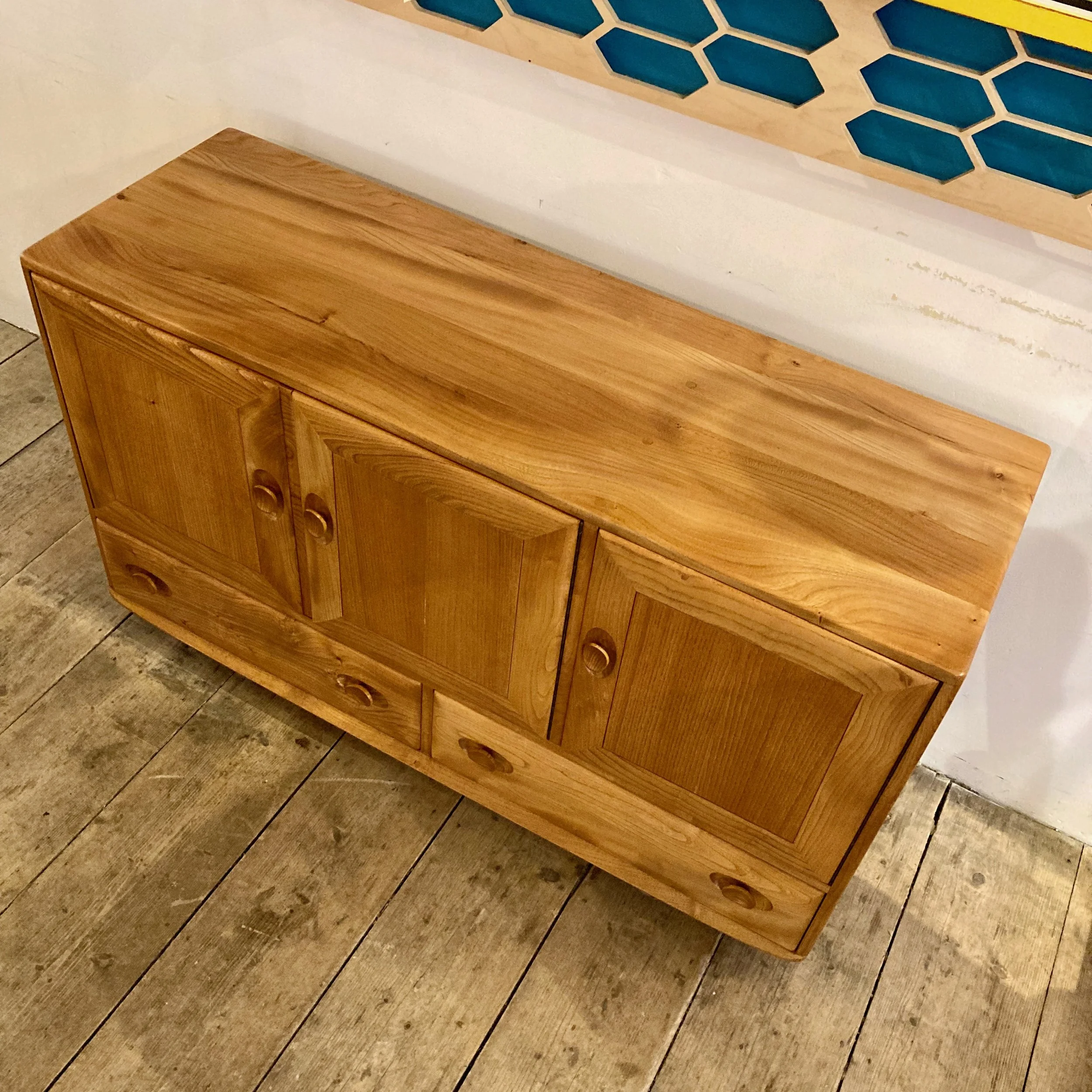A beautifully restored elm model 468 sideboard by Ercol, dating from the 1970s. This timeless piece showcases the brand’s signature craftsmanship, with elegant oval-shaped handles and a warm, rich grain.
