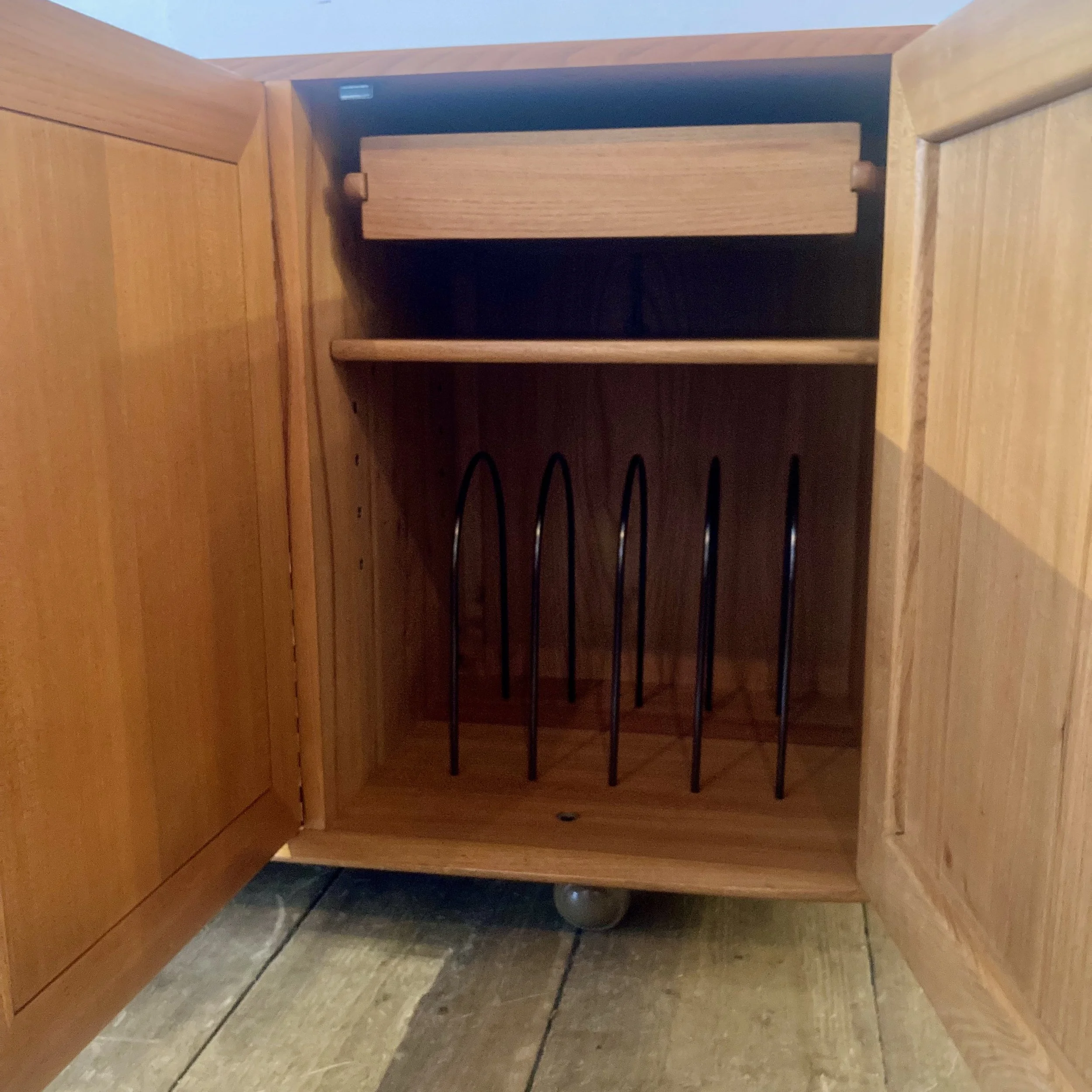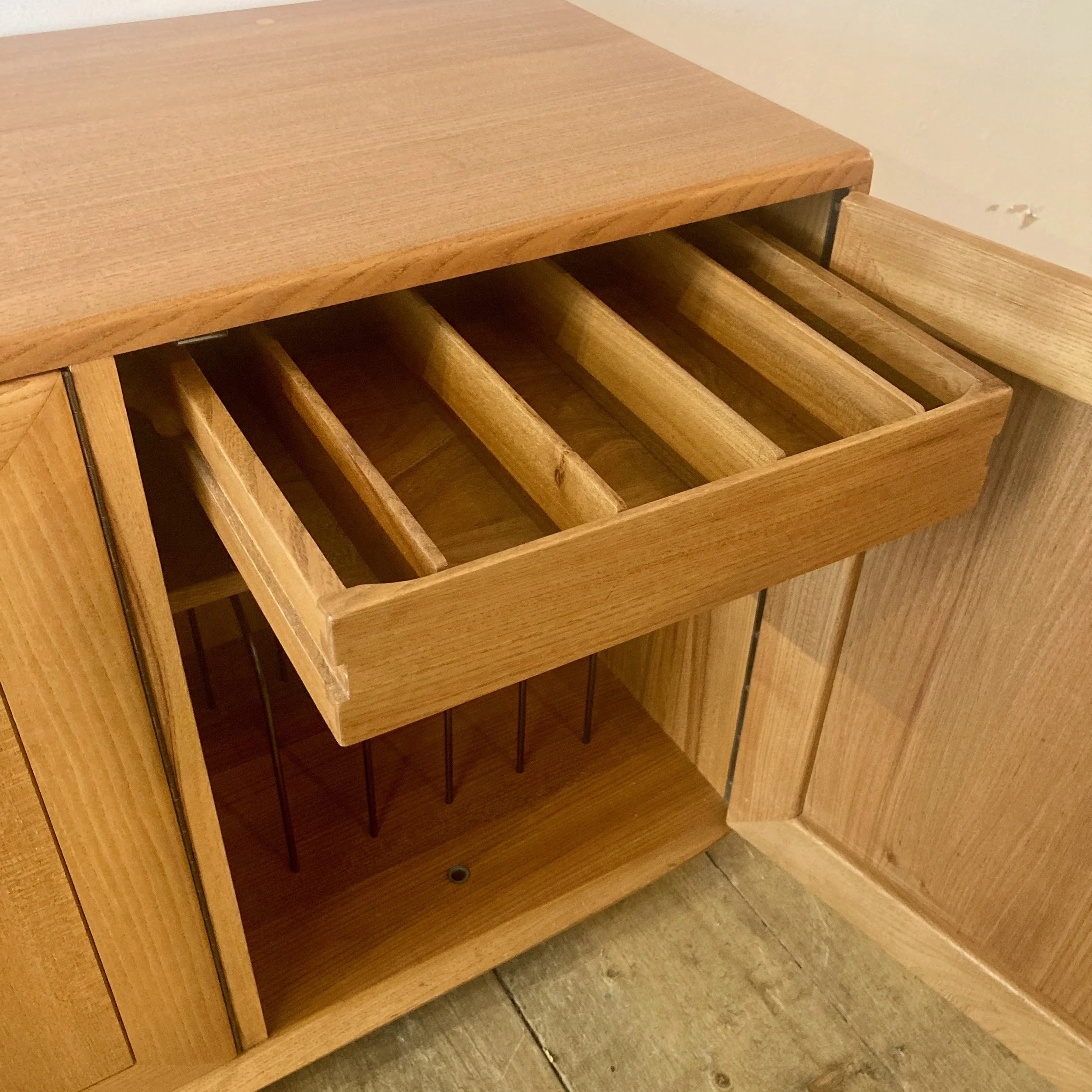 The sideboard offers excellent storage, with three spacious cupboards fitted with adjustable shelving.. A dedicated section provides practical LP storage, perfect for vinyl collectors, while the original cutlery tray remains intact—a charming and functional detail true to its mid-century heritage.