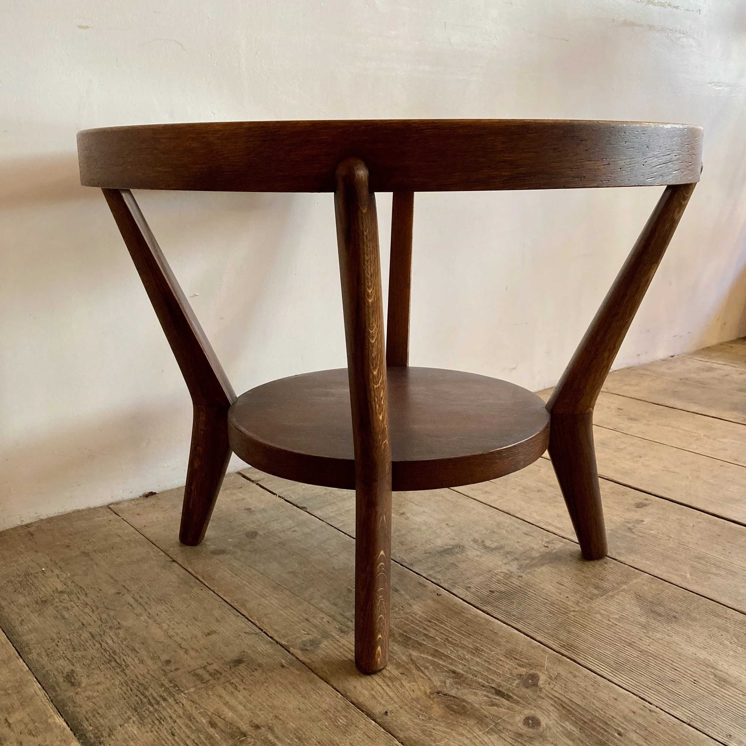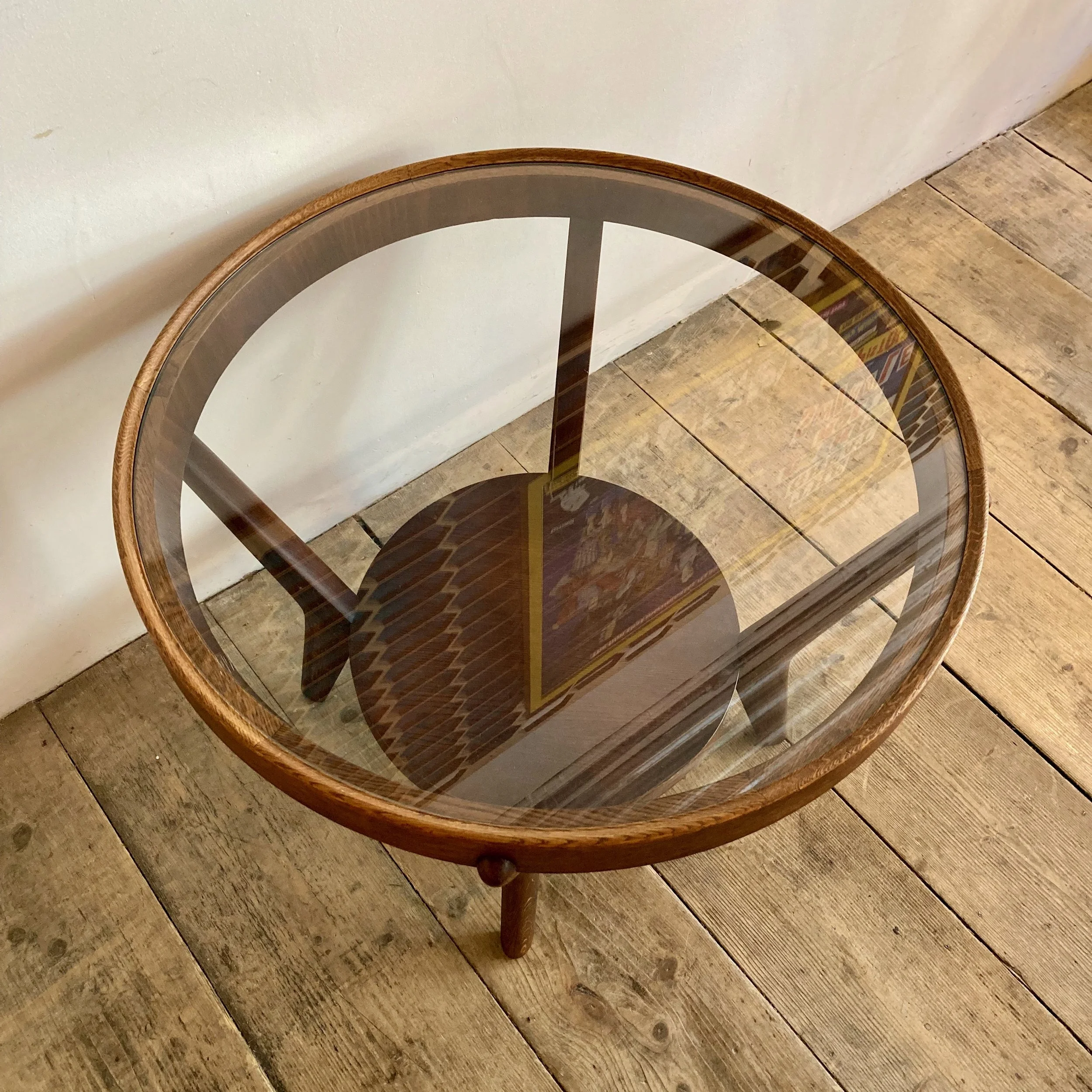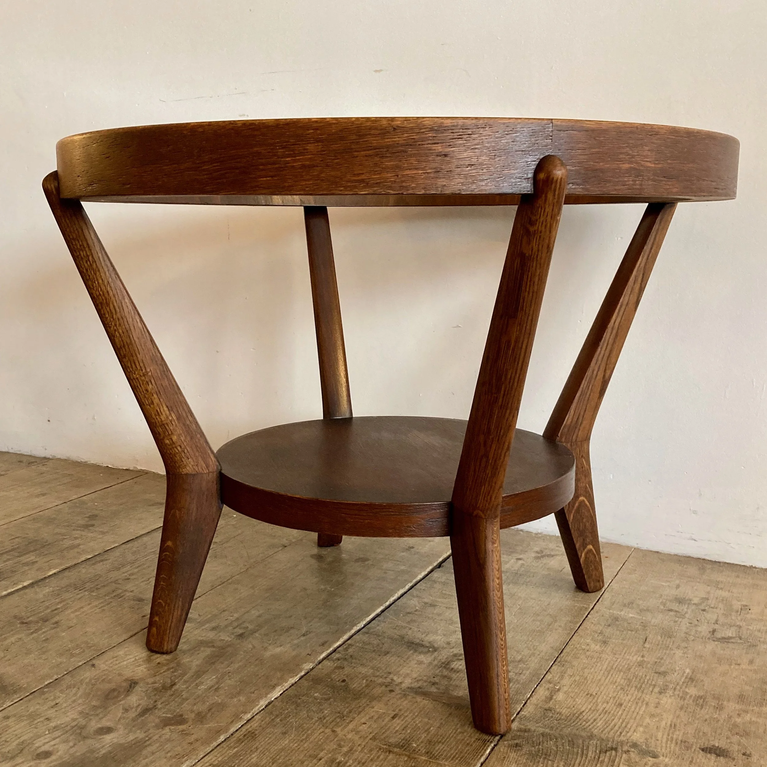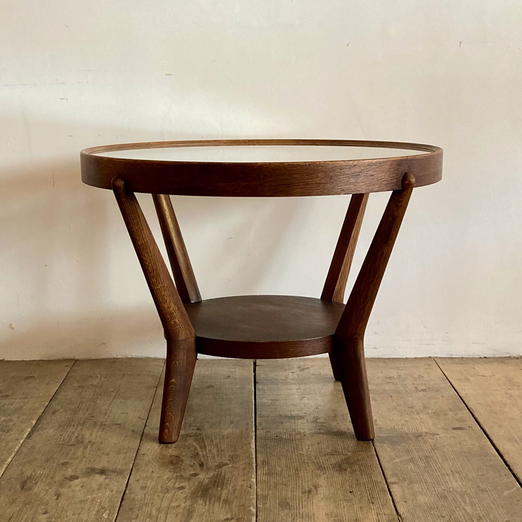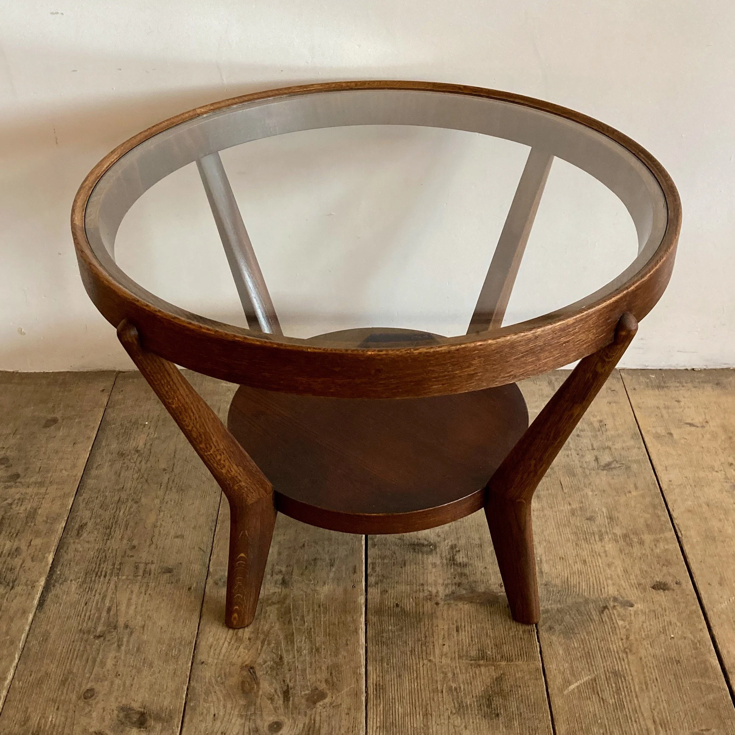 A stylish Art Deco coffee/side table, beautifully restored and full of period charm. With its elegant round form, it features a glass top surface paired with a երկրորդ lower wooden tier—perfect for additional storage or display.