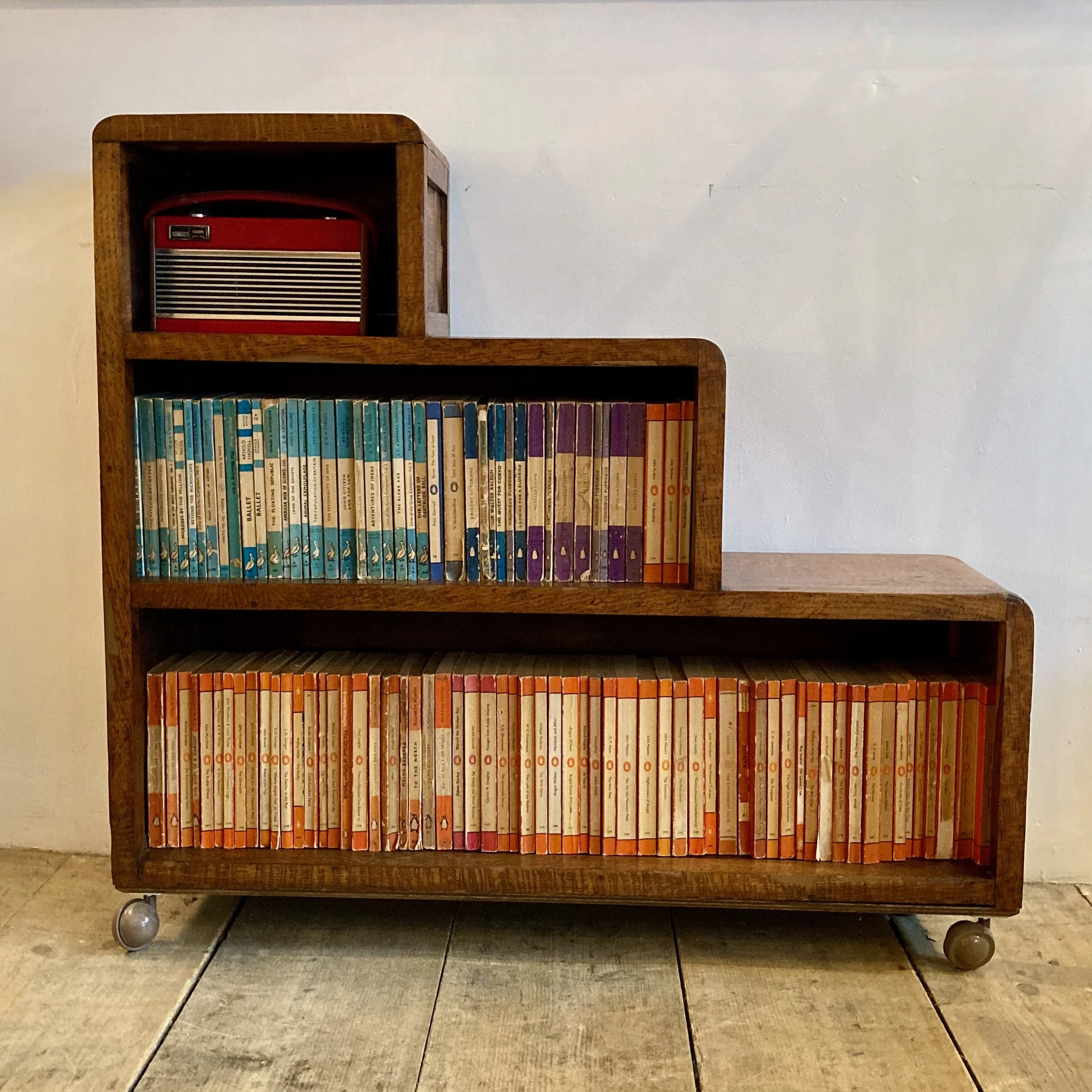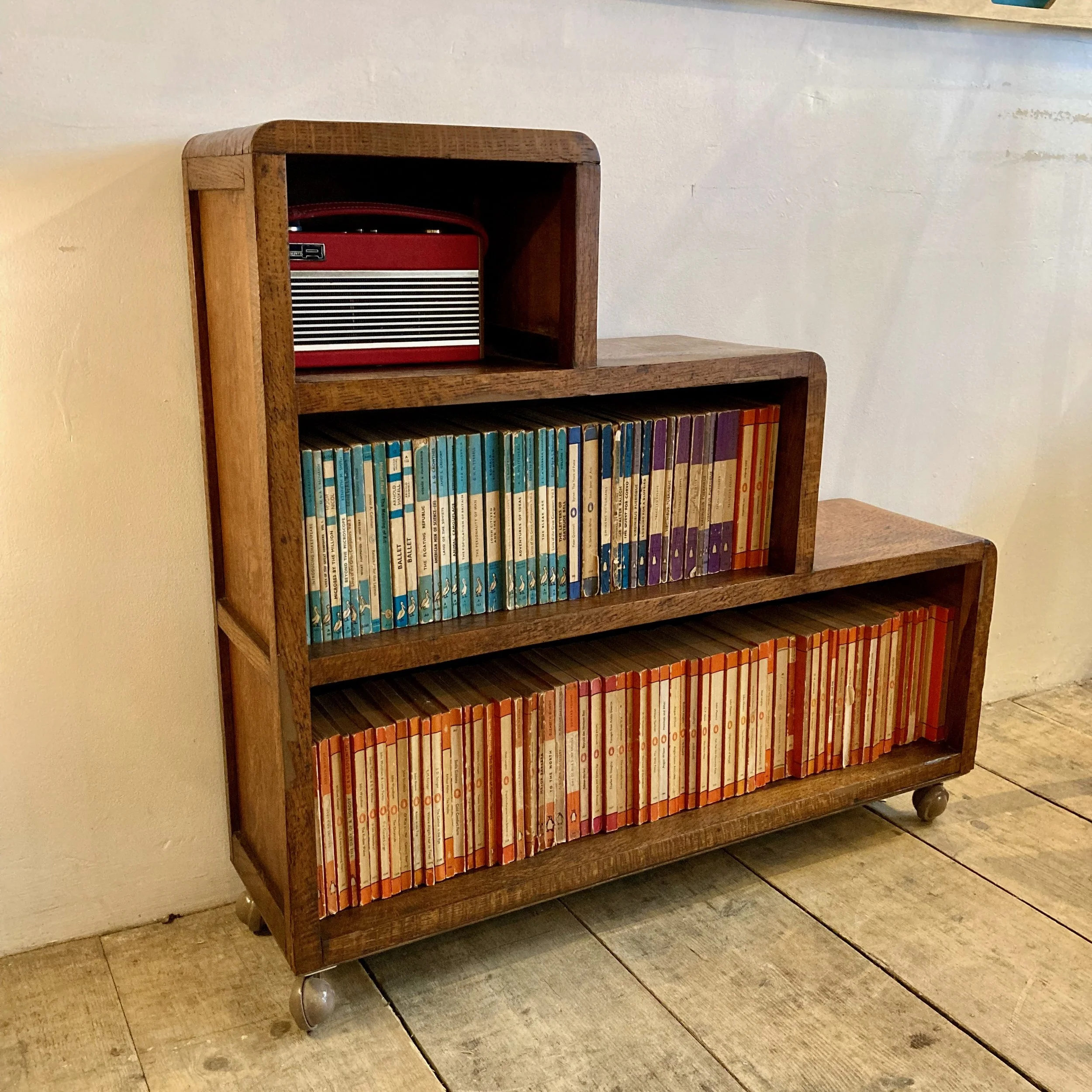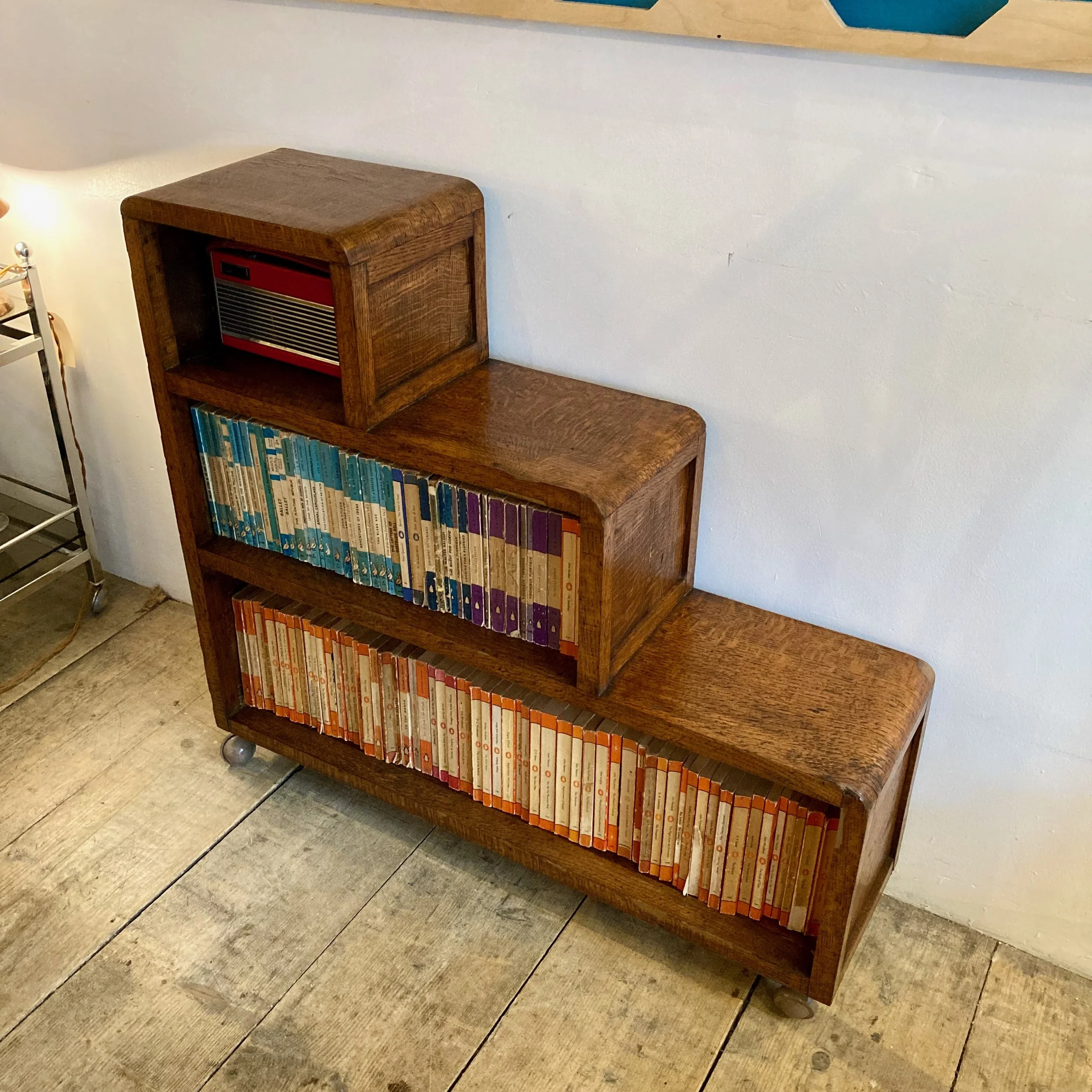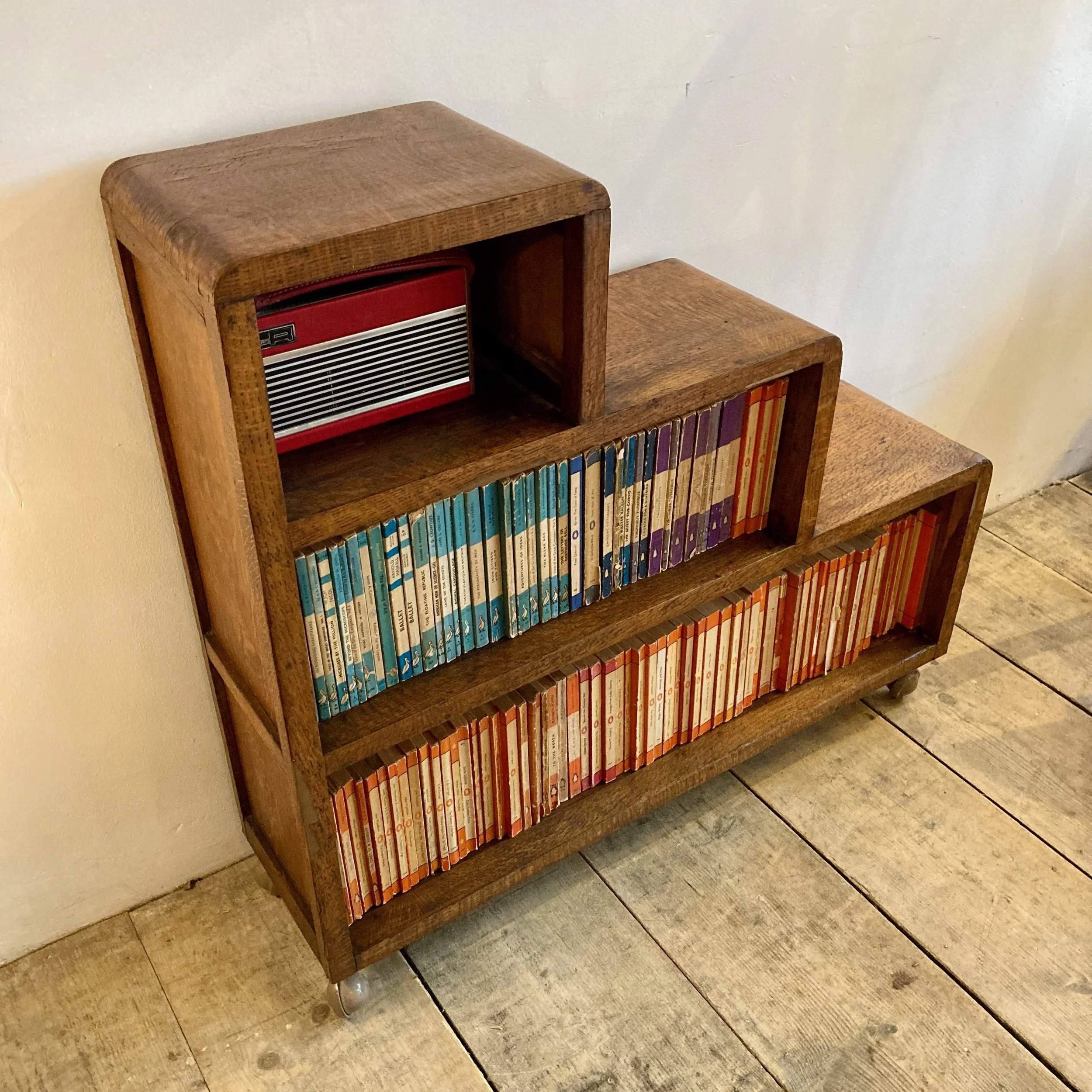 Restored Art Deco stepped bookcase on casters, combining classic 1930s design with practical mobility. Ideal as a vintage bookcase, display shelf, or stylish storage piece for living rooms, bedrooms, or offices.