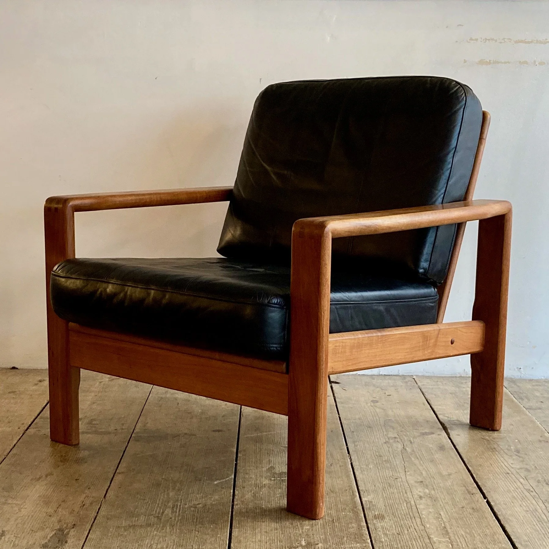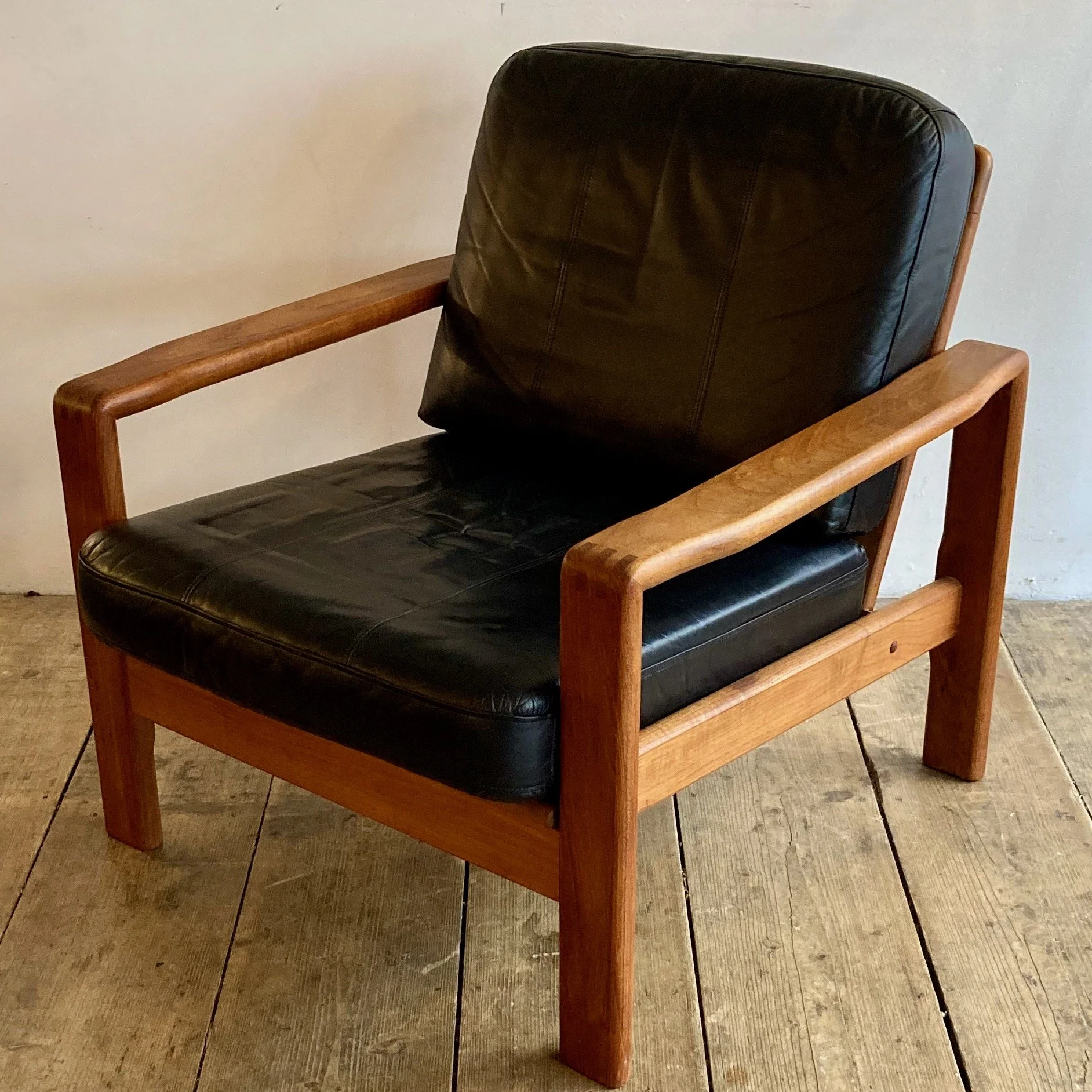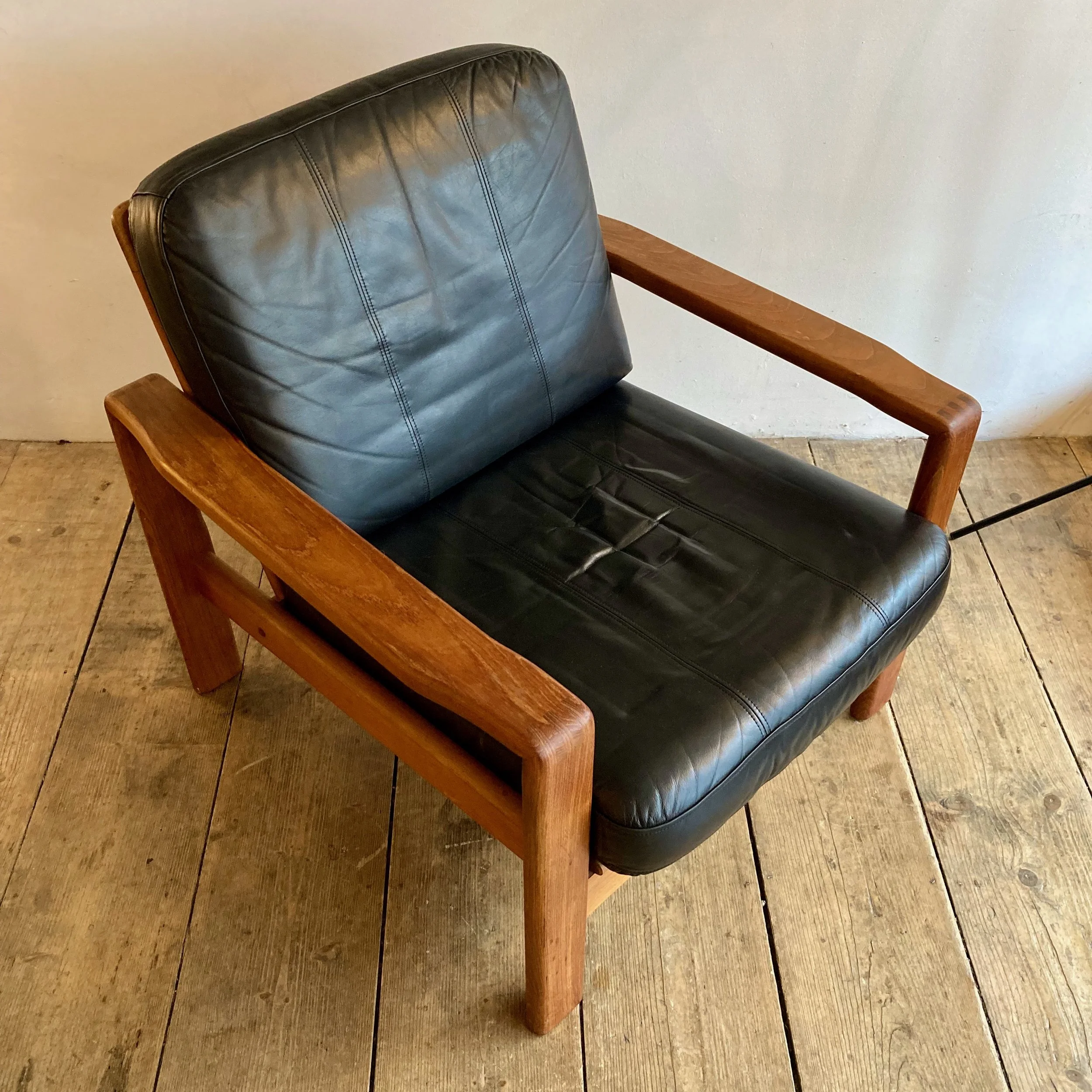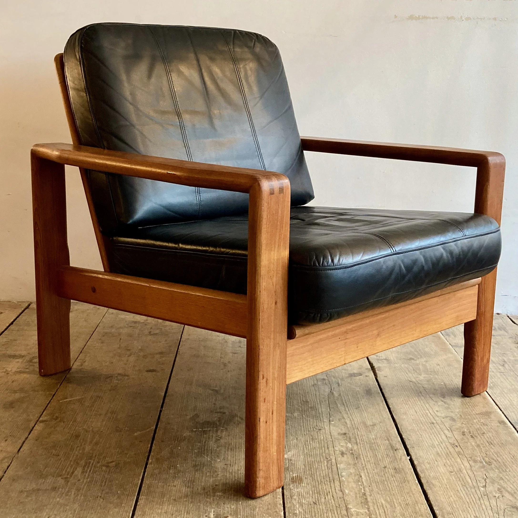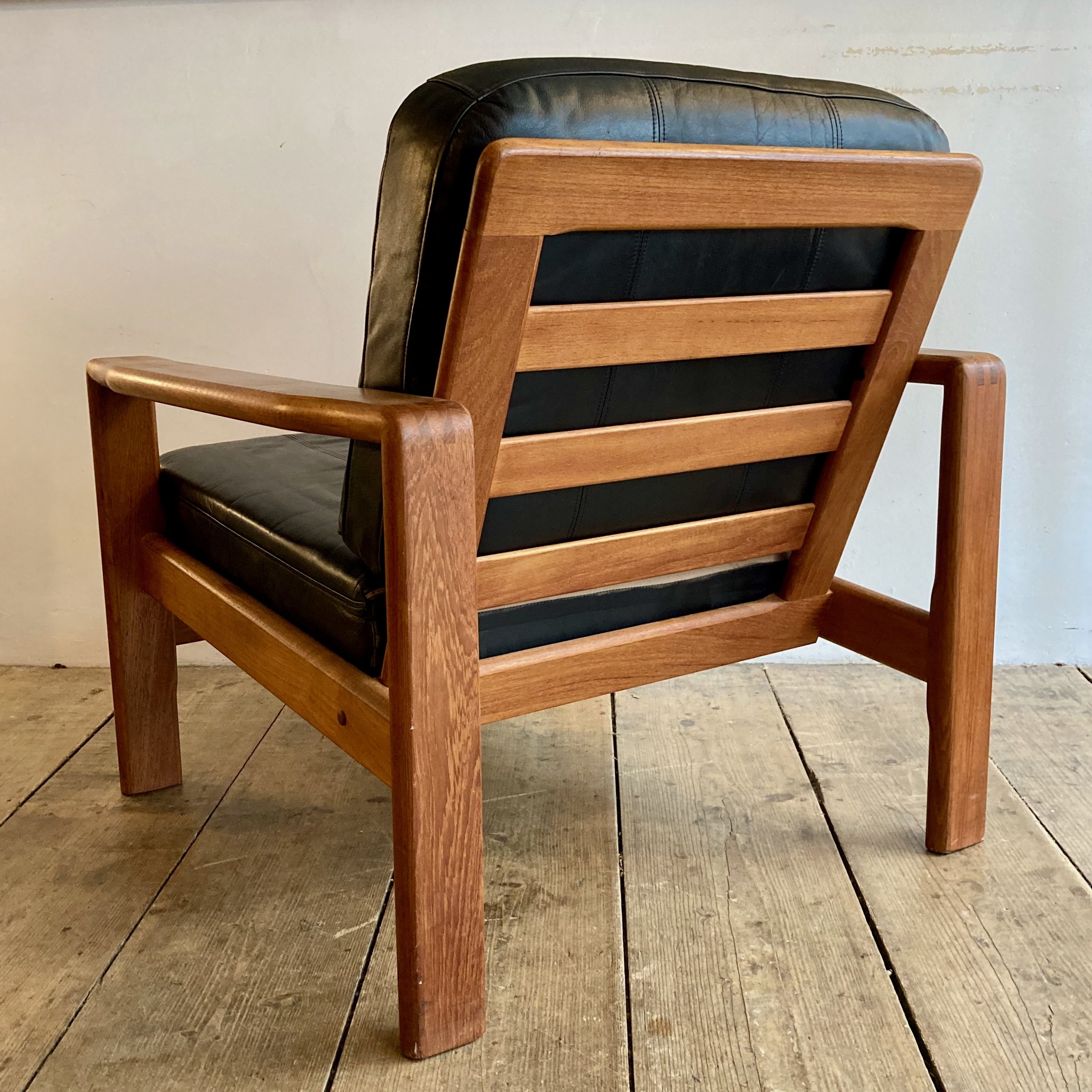 1970s Danish leather and teak armchair by S. Burchardt-Nielsen for Møbel Fabrik. Crafted in rich teak with supple leather upholstery, this vintage Scandinavian lounge chair combines exceptional comfort with clean mid-century modern lines.