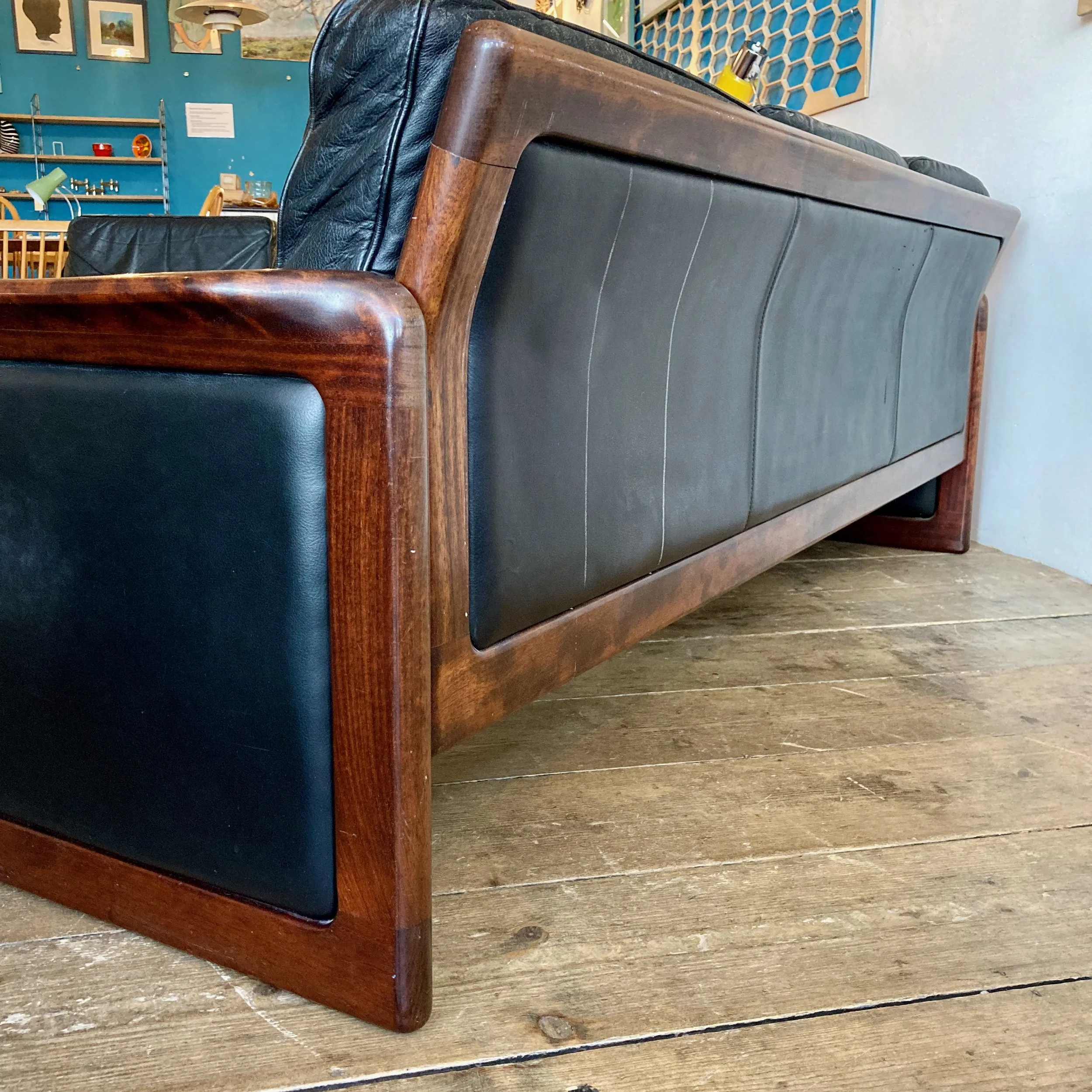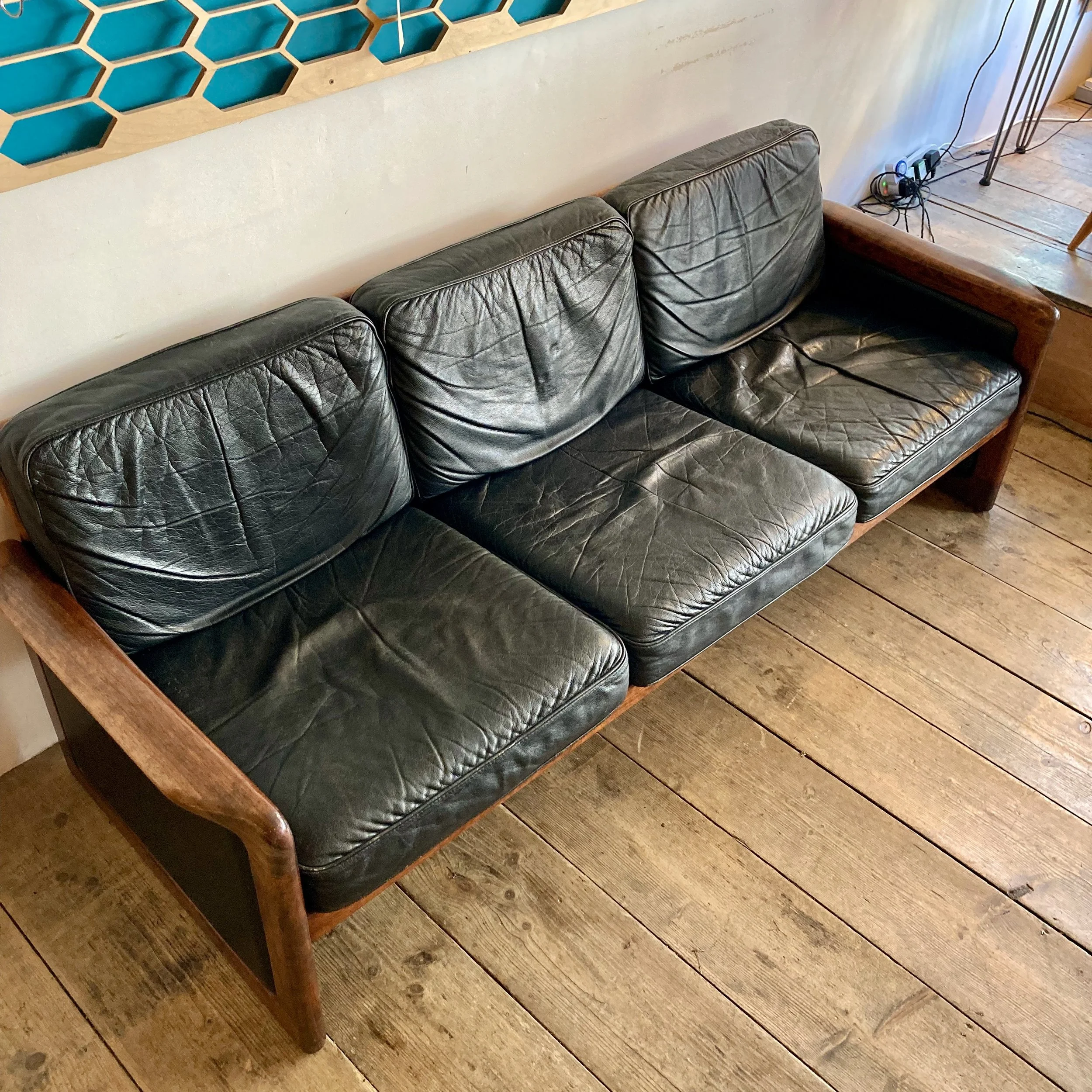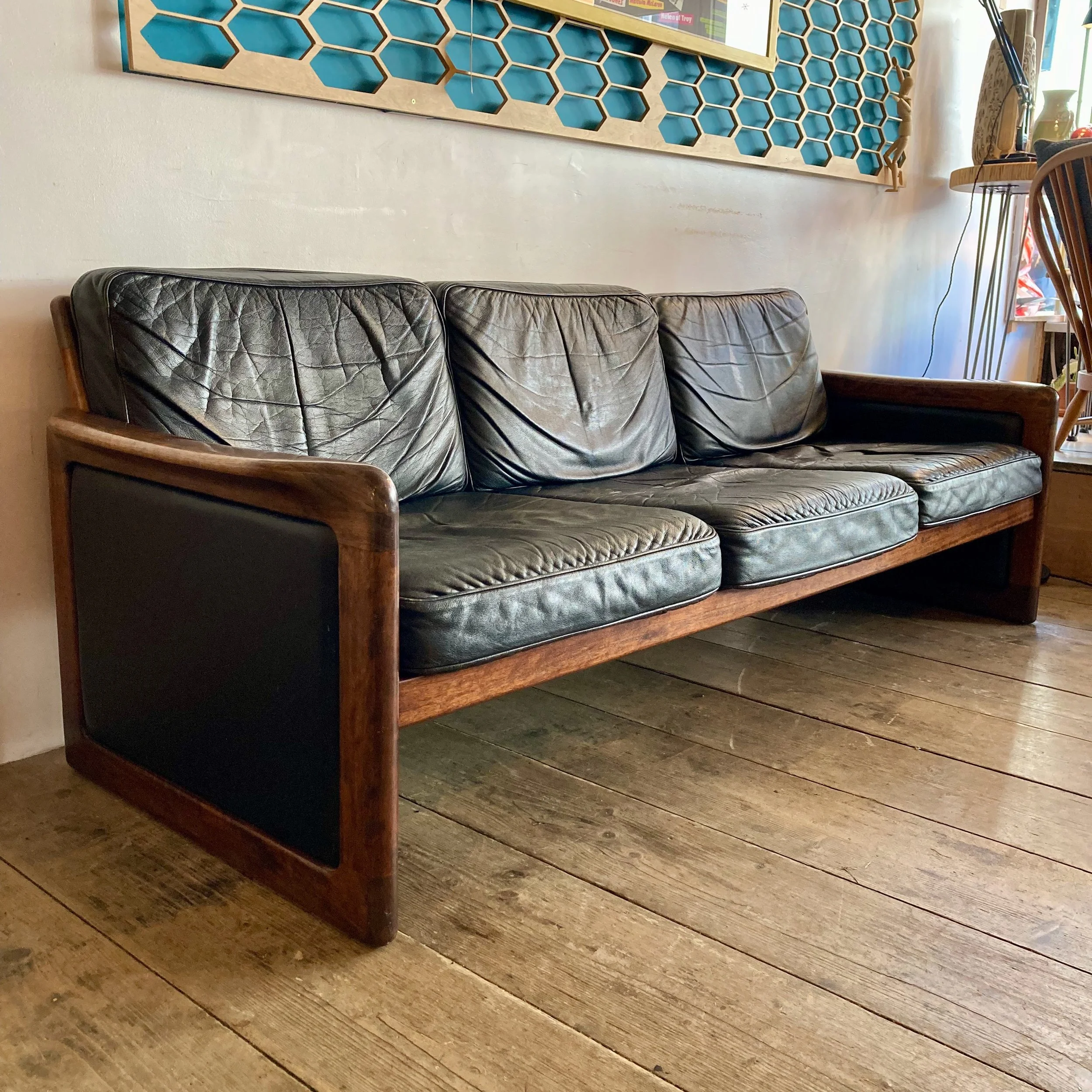 A striking example of Scandinavian craftsmanship, this 1980s Danish three-seater sofa by Dyrlund combines timeless design with exceptional materials. Expertly constructed, it features a beautifully grained solid rosewood frame paired with supple black leather upholstery, creating a refined and sophisticated look that complements both modern and classic interiors.