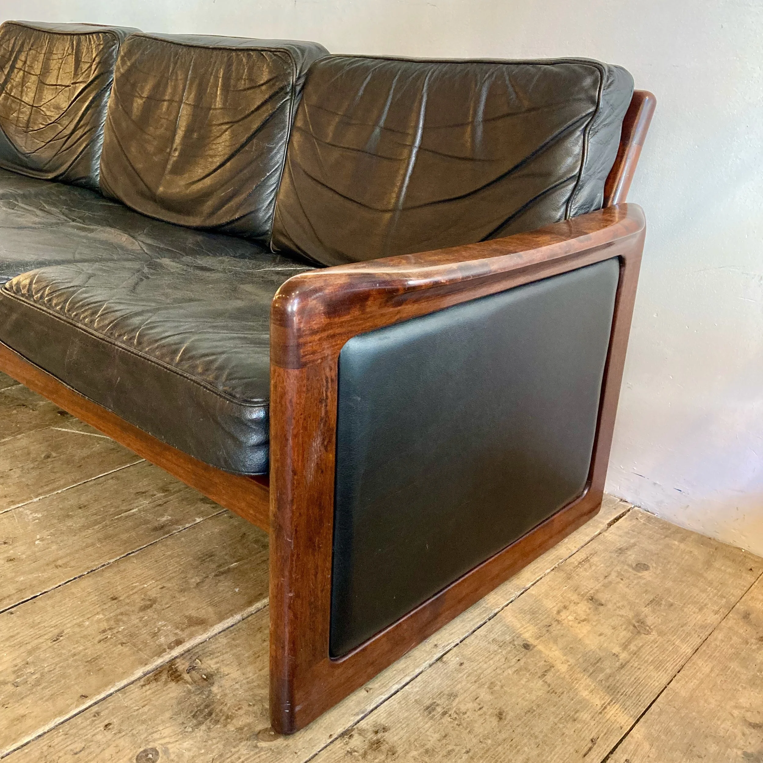 The clean, low-profile silhouette is characteristic of Danish mid-century design, offering generous seating while maintaining an elegant, uncluttered aesthetic. The leather cushions remain in excellent original condition, with a rich tone and minimal signs of wear, while the rosewood frame retains its depth of colour and natural lustre.