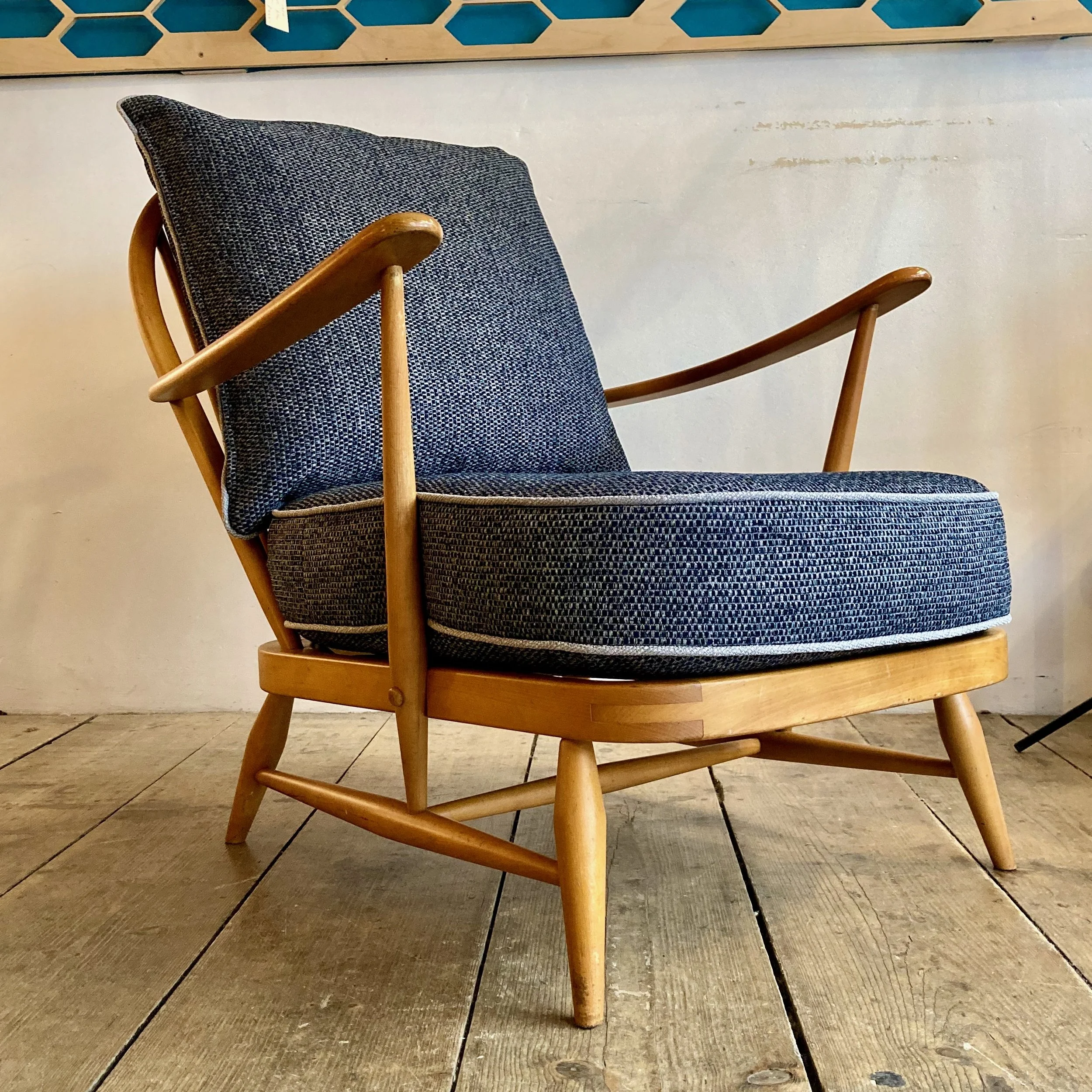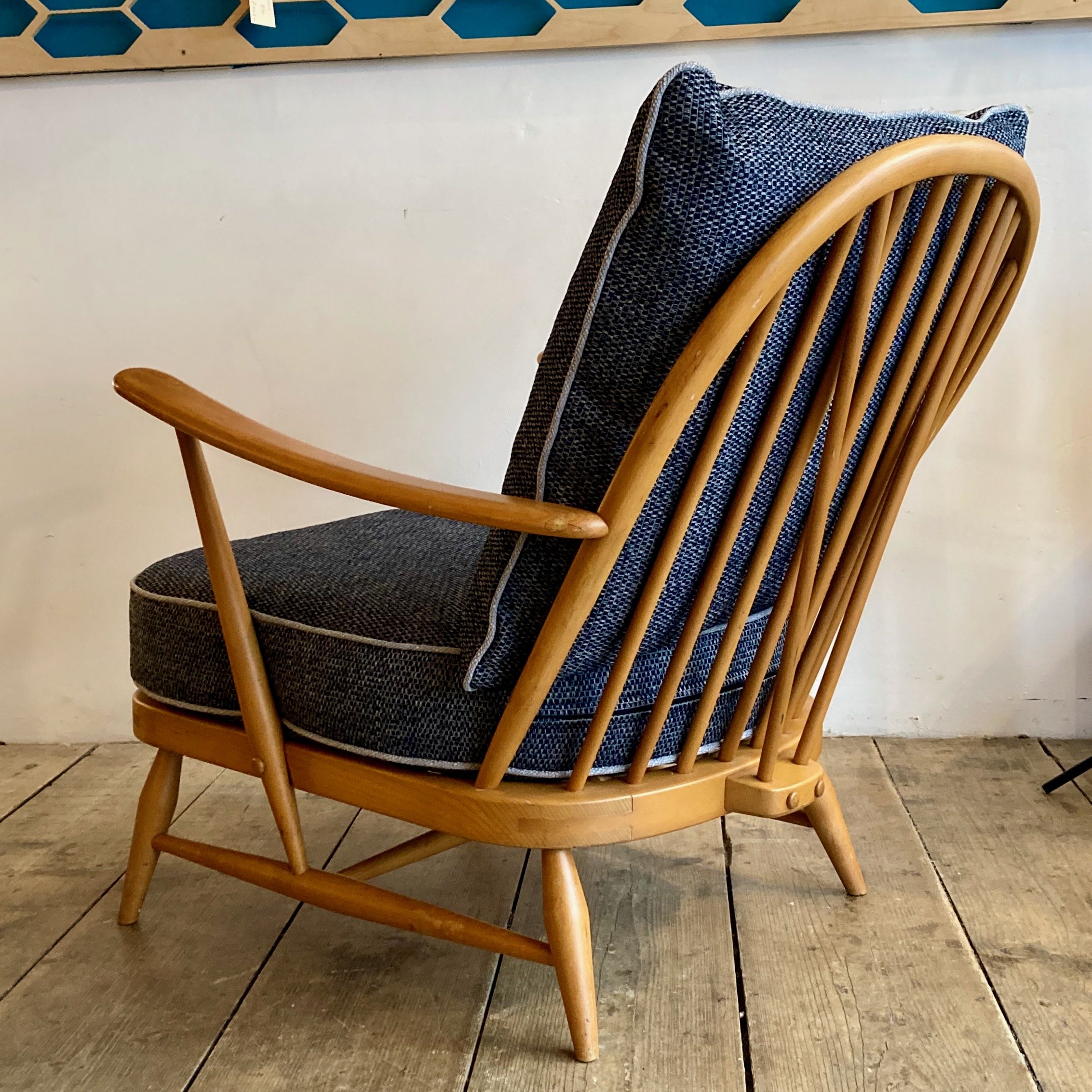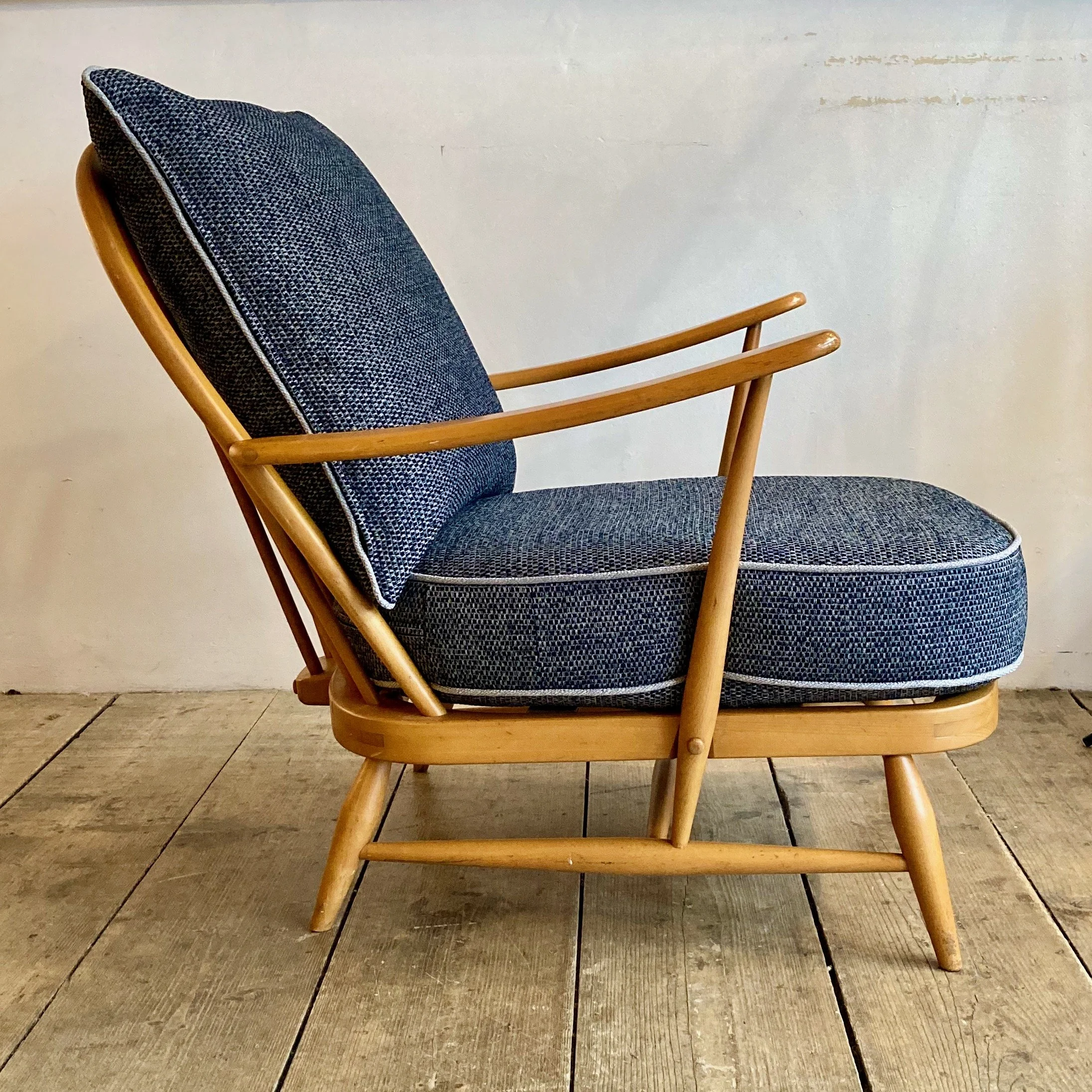 1980s Ercol Windsor armchair featuring a solid beech frame in excellent original condition. Newly made seat and back cushions have been professionally upholstered in a soft blue and grey fleck fabric, offering both comfort and a fresh contemporary feel while complementing the classic mid-century design.