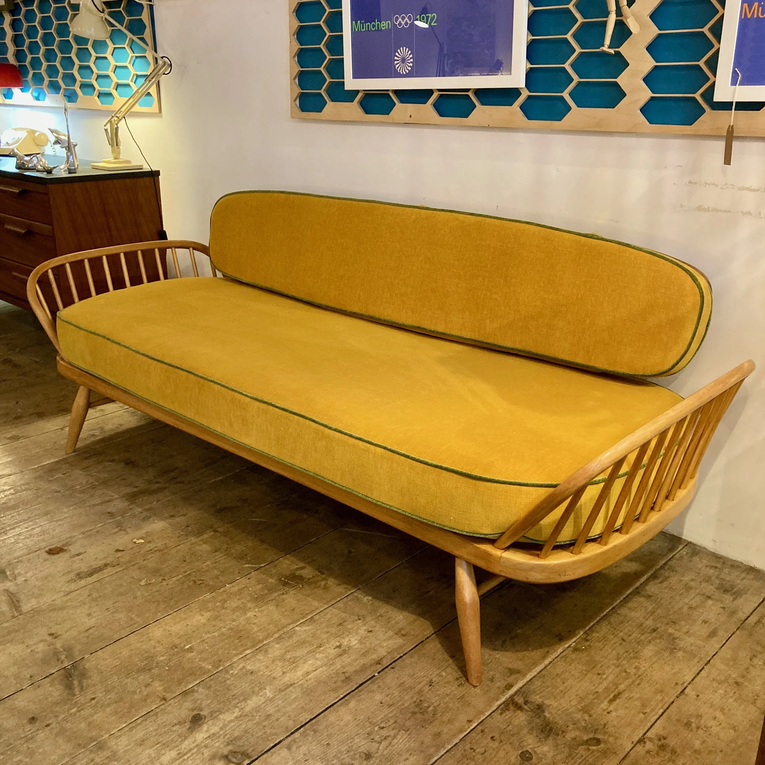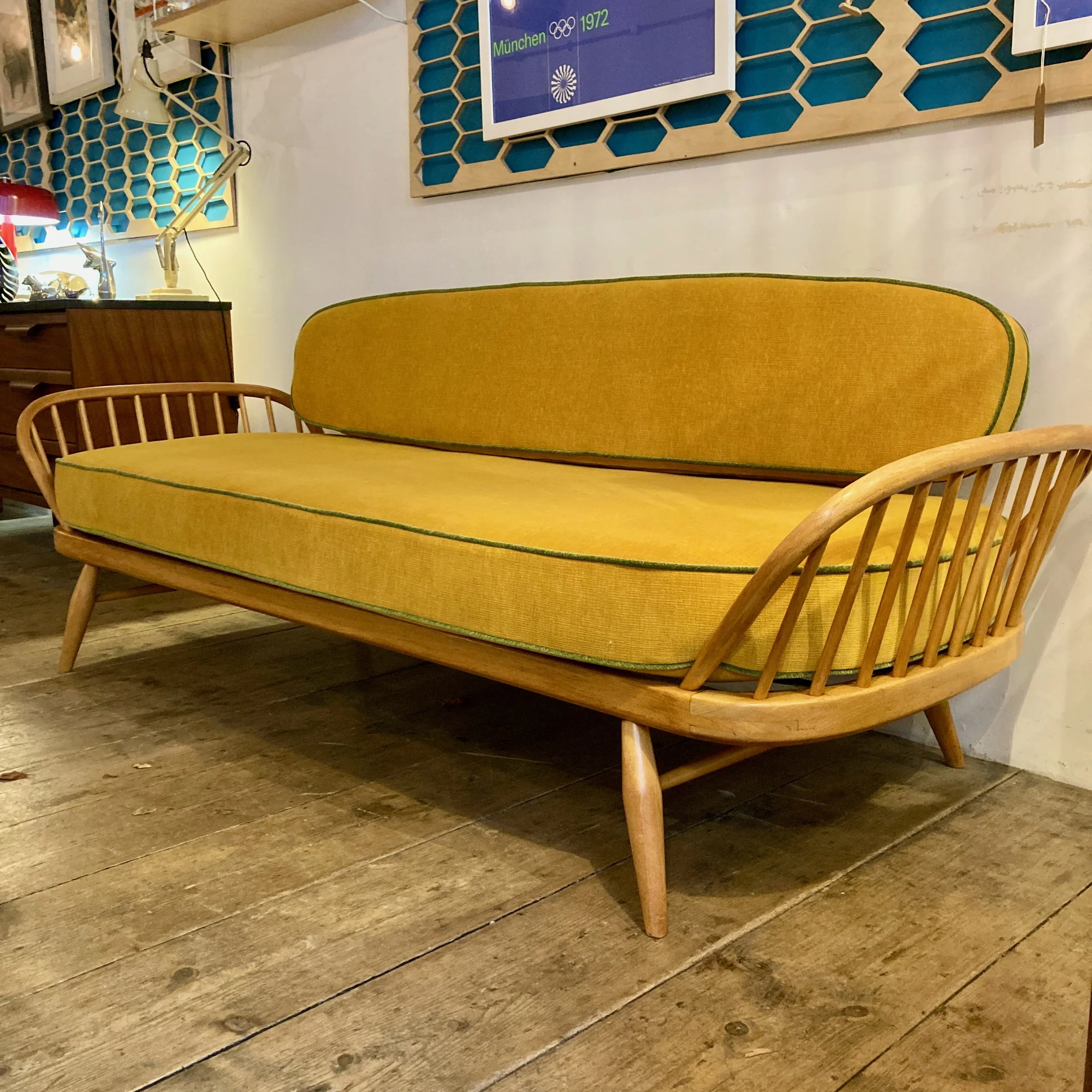 A 1970s Ercol daybed, fully refurbished and newly reupholstered in a soft butterscotch fabric, finished with contrasting green piping for a subtle, tailored detail. This classic Ercol design showcases the brand’s signature craftsmanship, with its elegant beech frame and light, spacious silhouette.