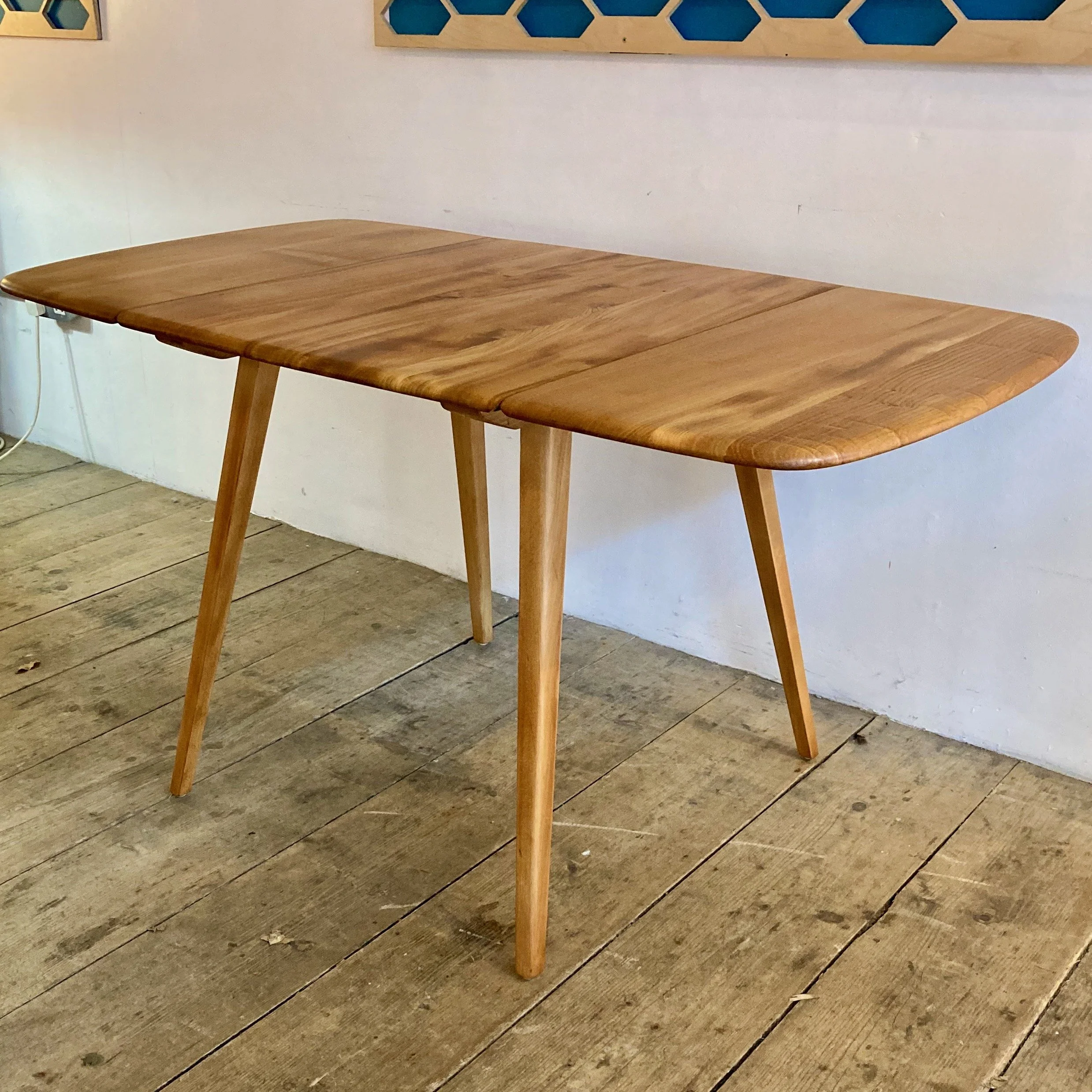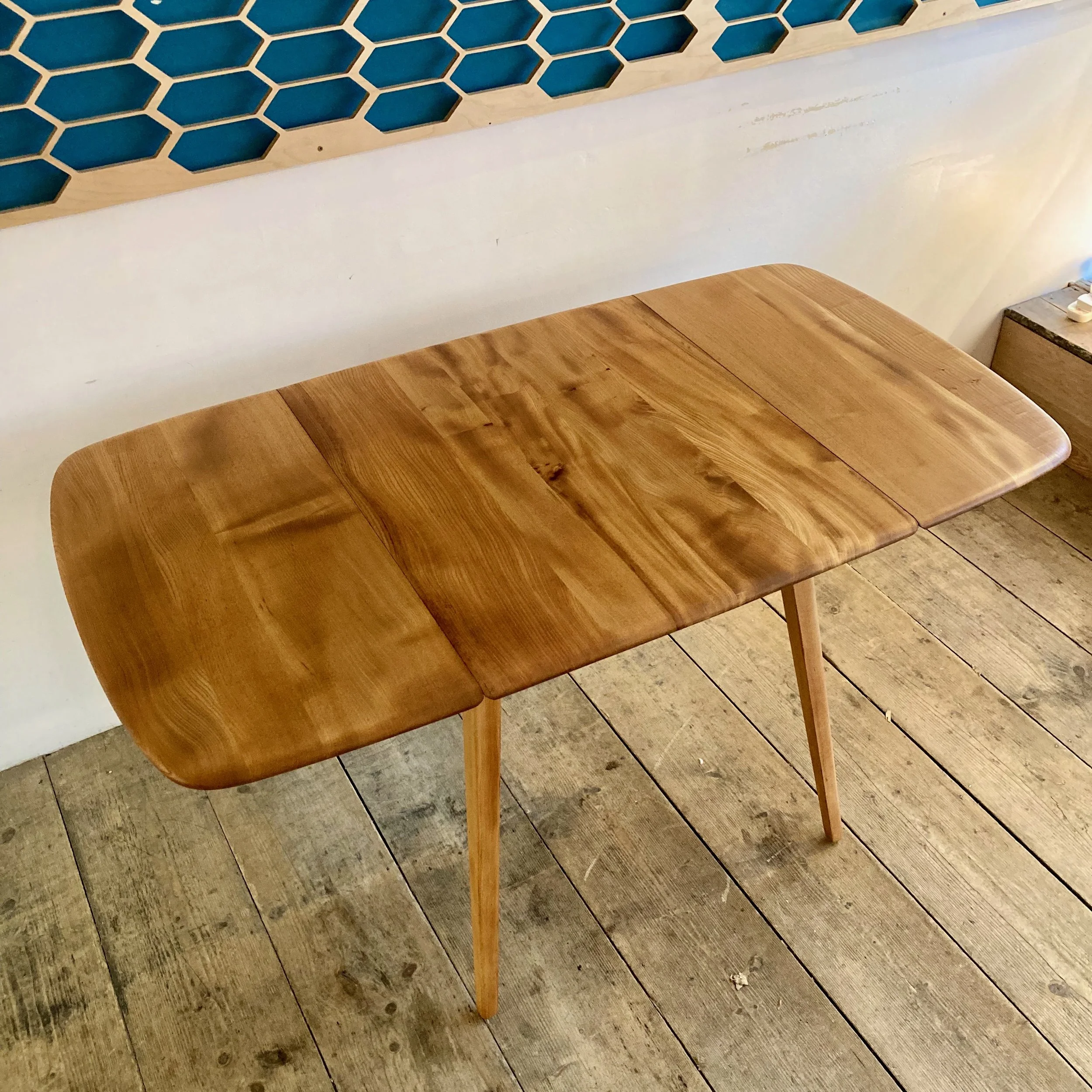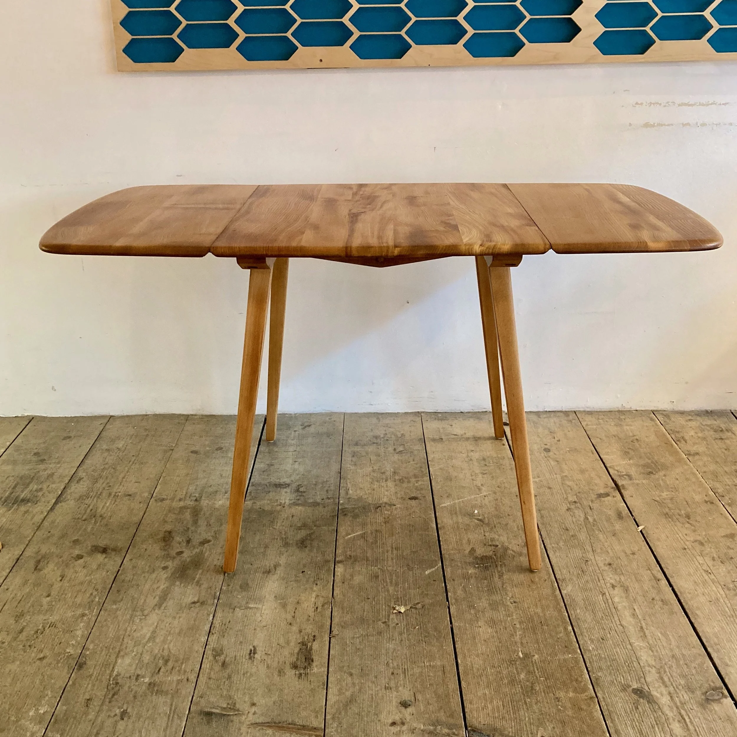 A beautifully restored 1960s Ercol Windsor drop-leaf dining table, showcasing the timeless quality and craftsmanship that make Ercol pieces so sought after. The table features elegant beech underframes paired with a stunning elm top, highlighting the brand’s signature combination of durability and natural beauty.