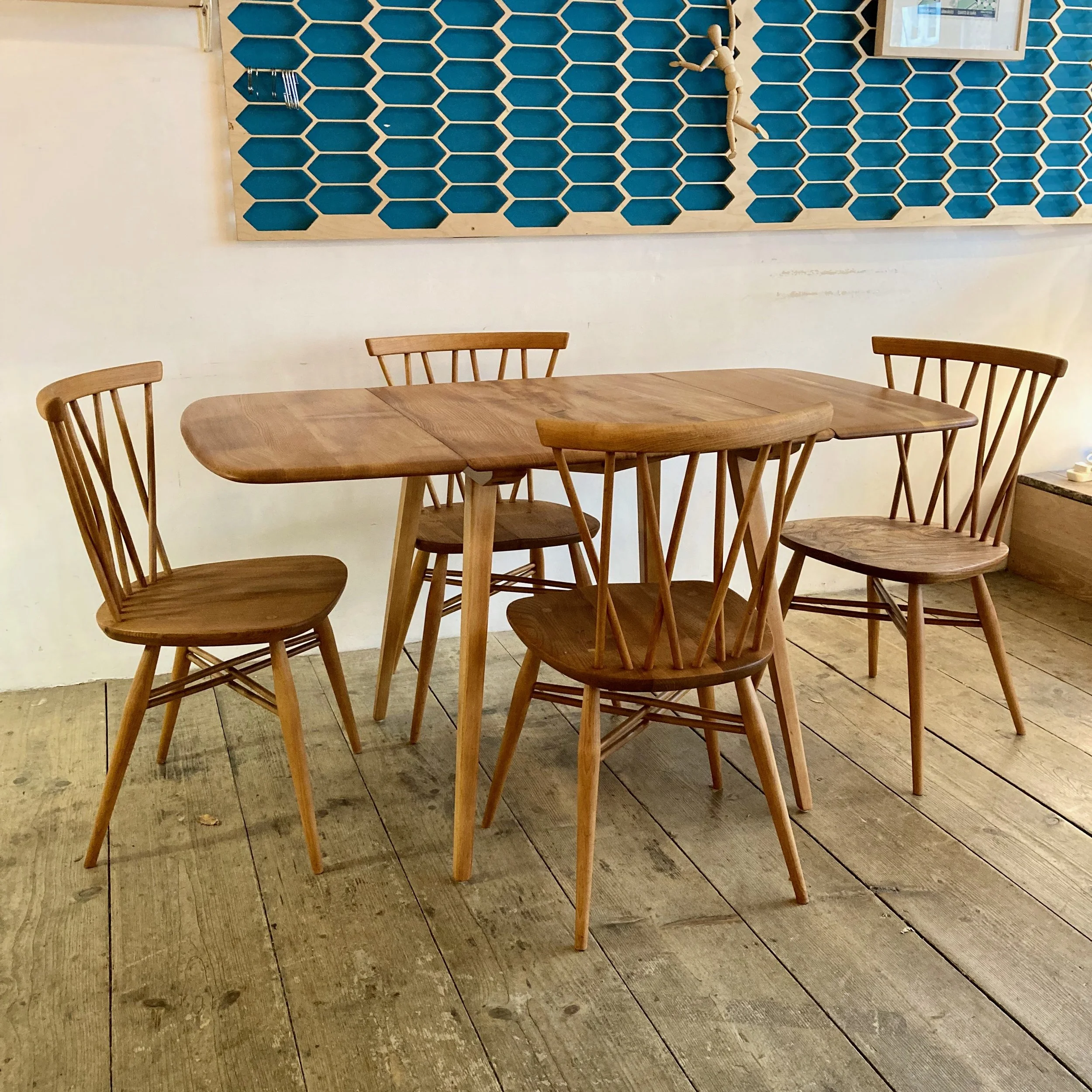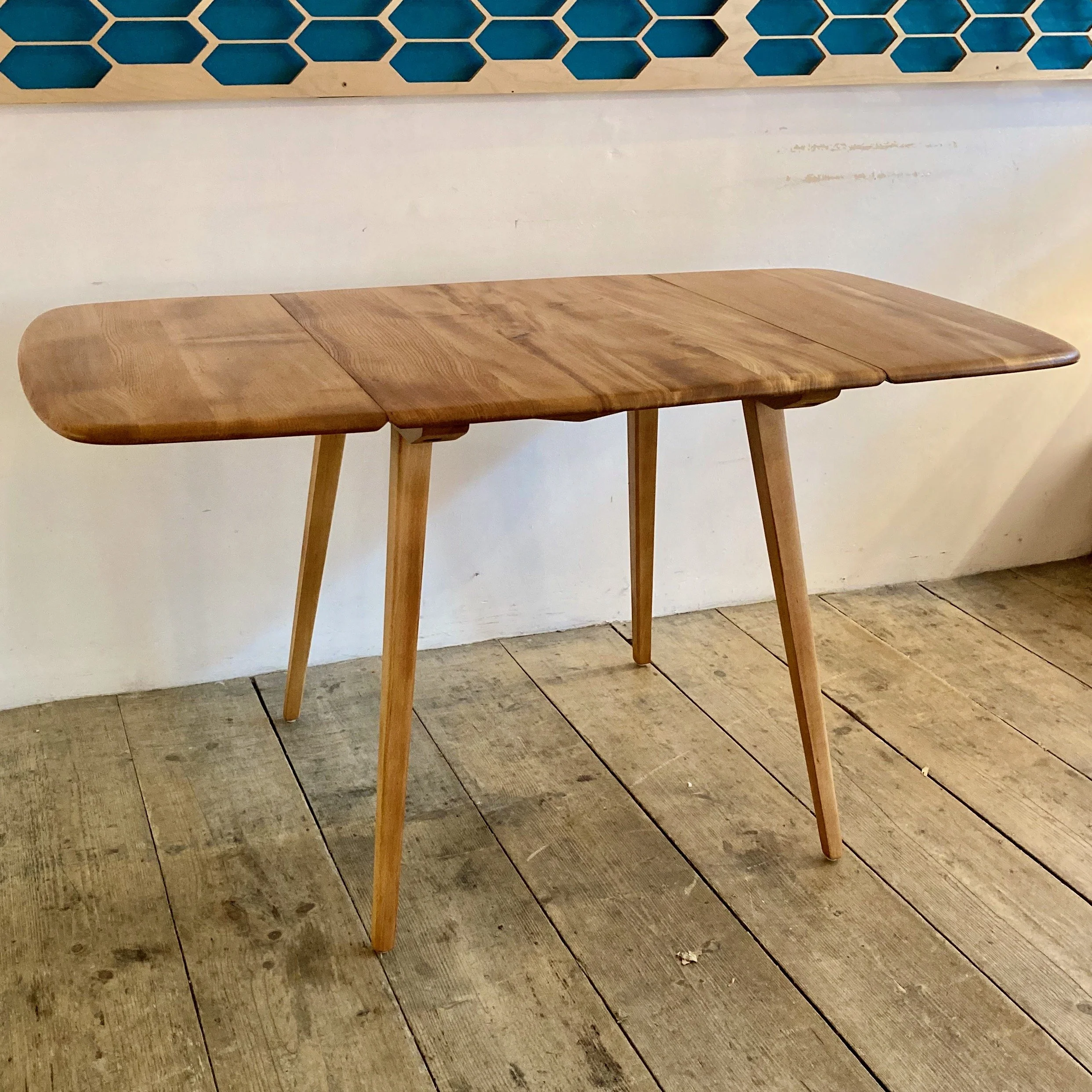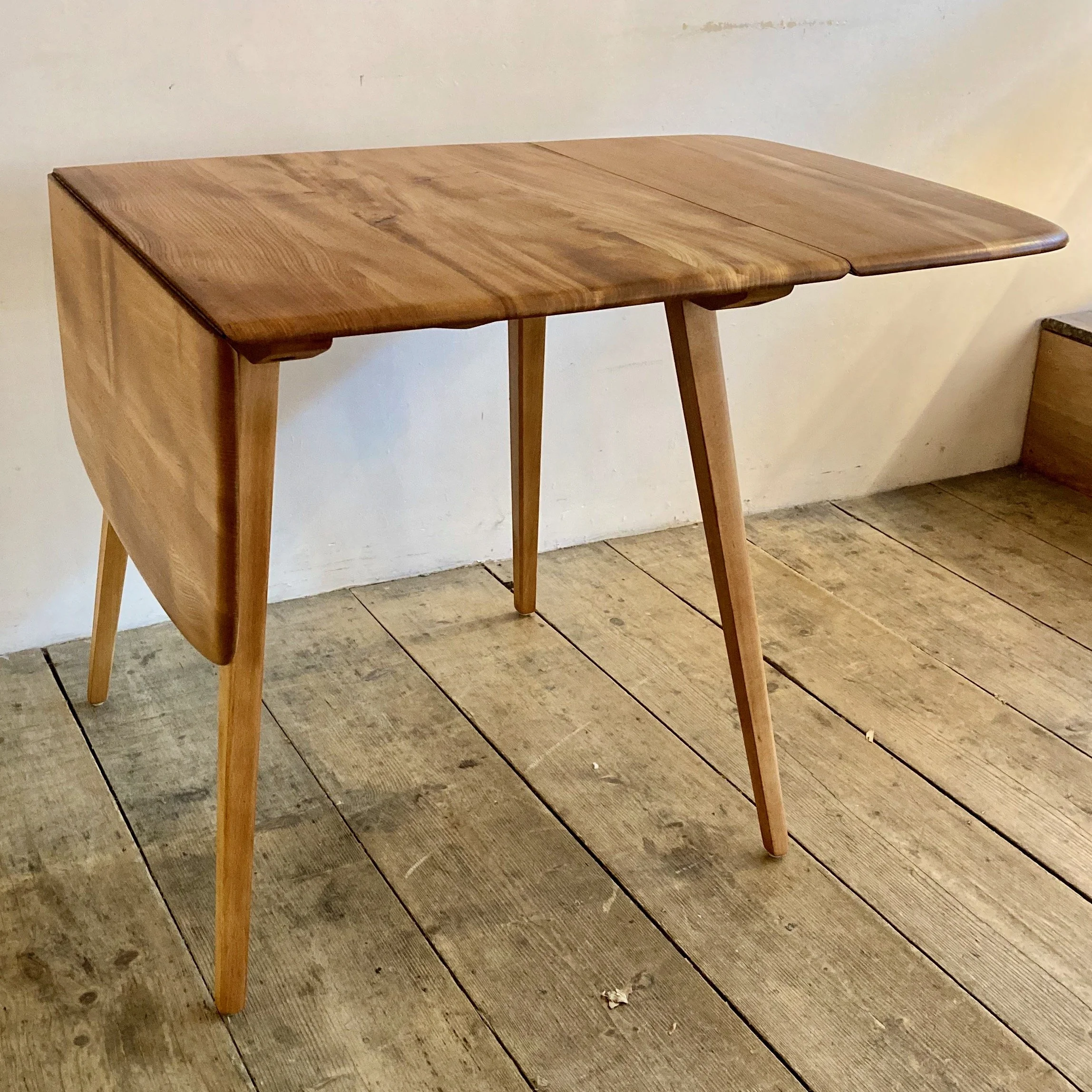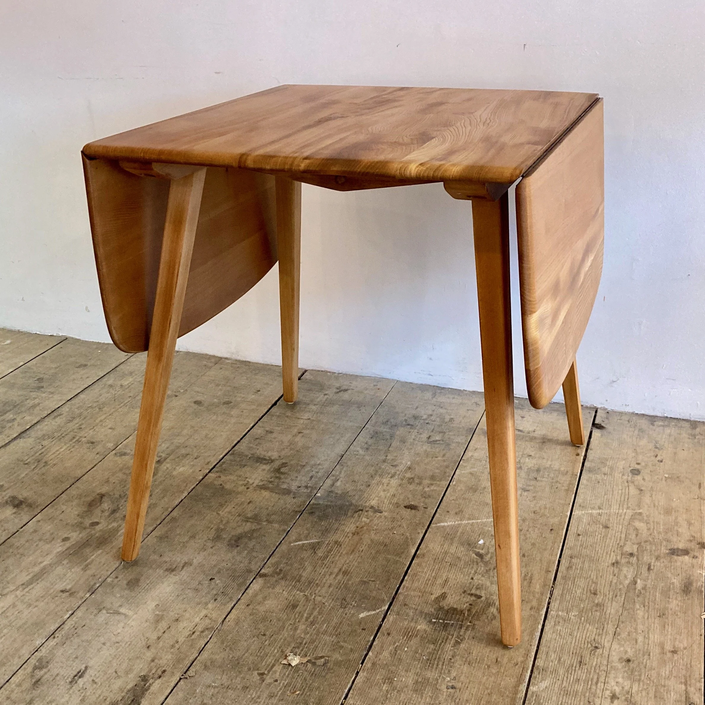 A beautifully restored 1960s Ercol Windsor drop-leaf dining table, showcasing the timeless quality and craftsmanship that make Ercol pieces so sought after. The table features elegant beech underframes paired with a stunning elm top, highlighting the brand’s signature combination of durability and natural beauty.