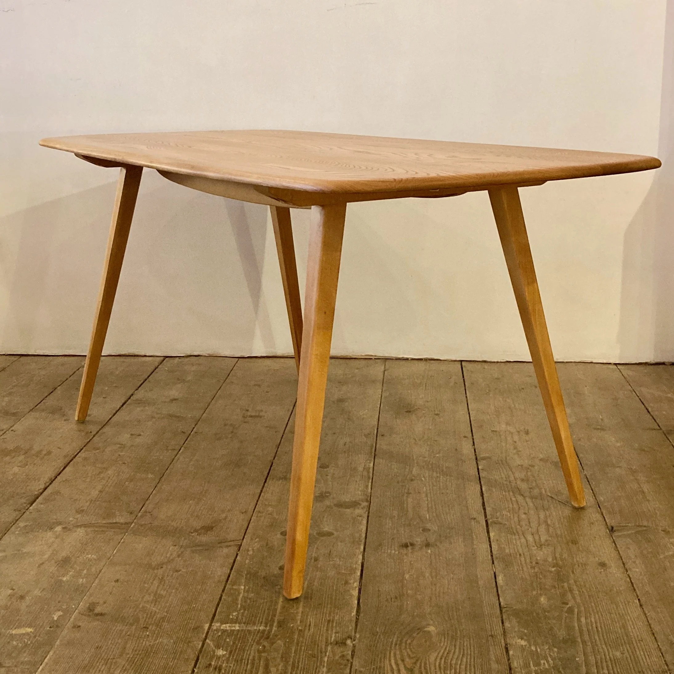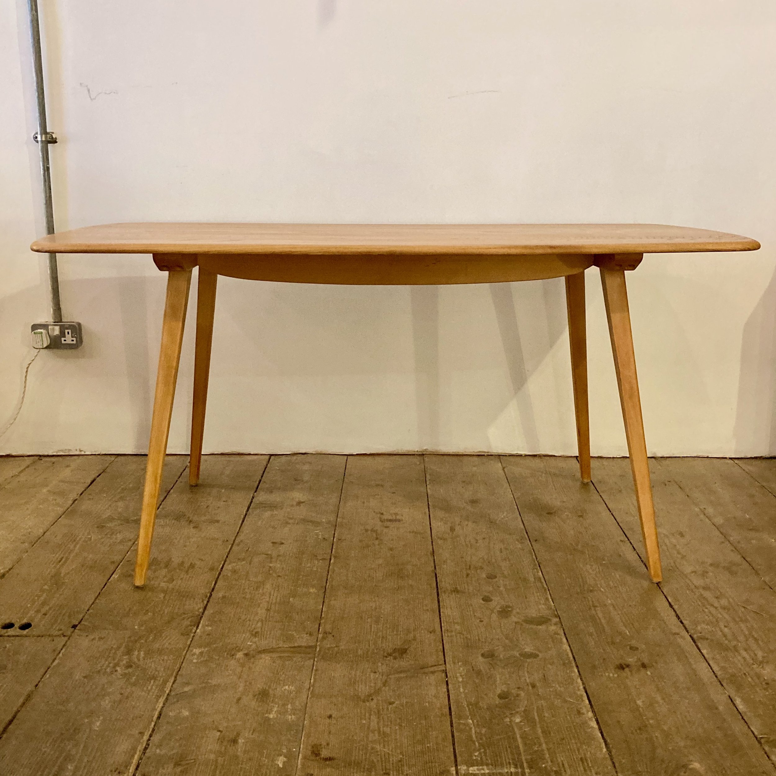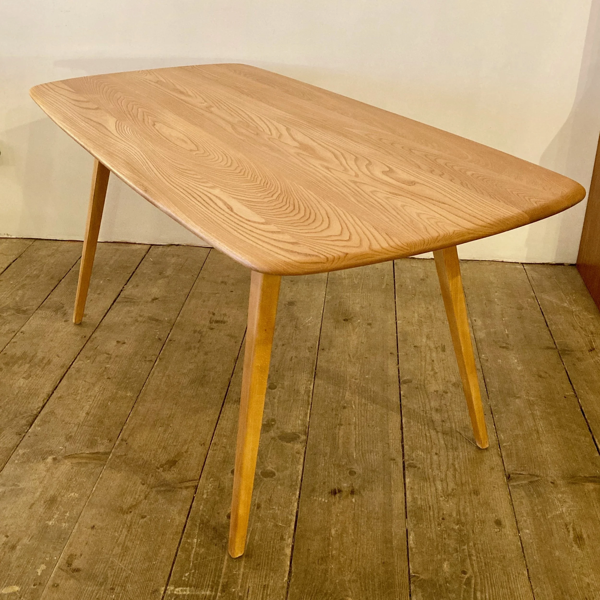 A beautifully restored 1970s Ercol dining table, a timeless piece of British mid-century furniture. The table seats up to six comfortably and features a solid elm top with a beech wood frame, showcasing Ercol’s renowned craftsmanship. Expertly restored, making it ideal for everyday dining or as a statement vintage kitchen table.