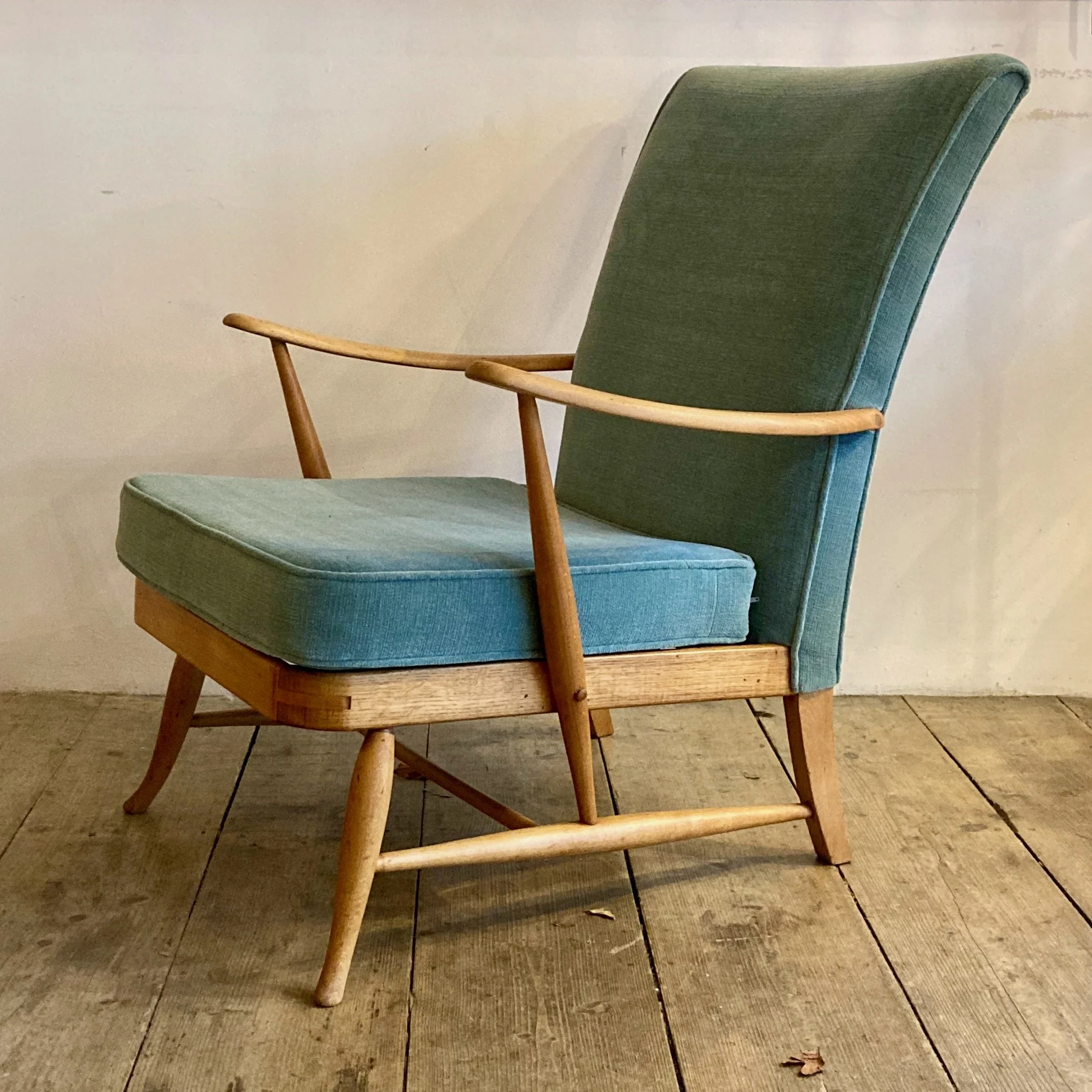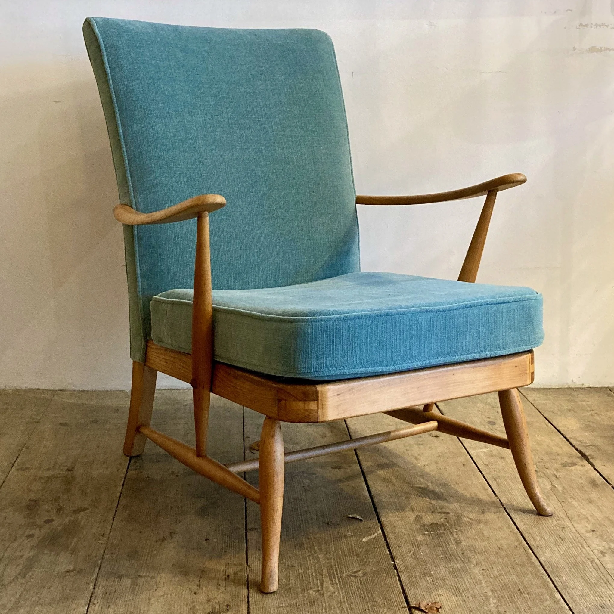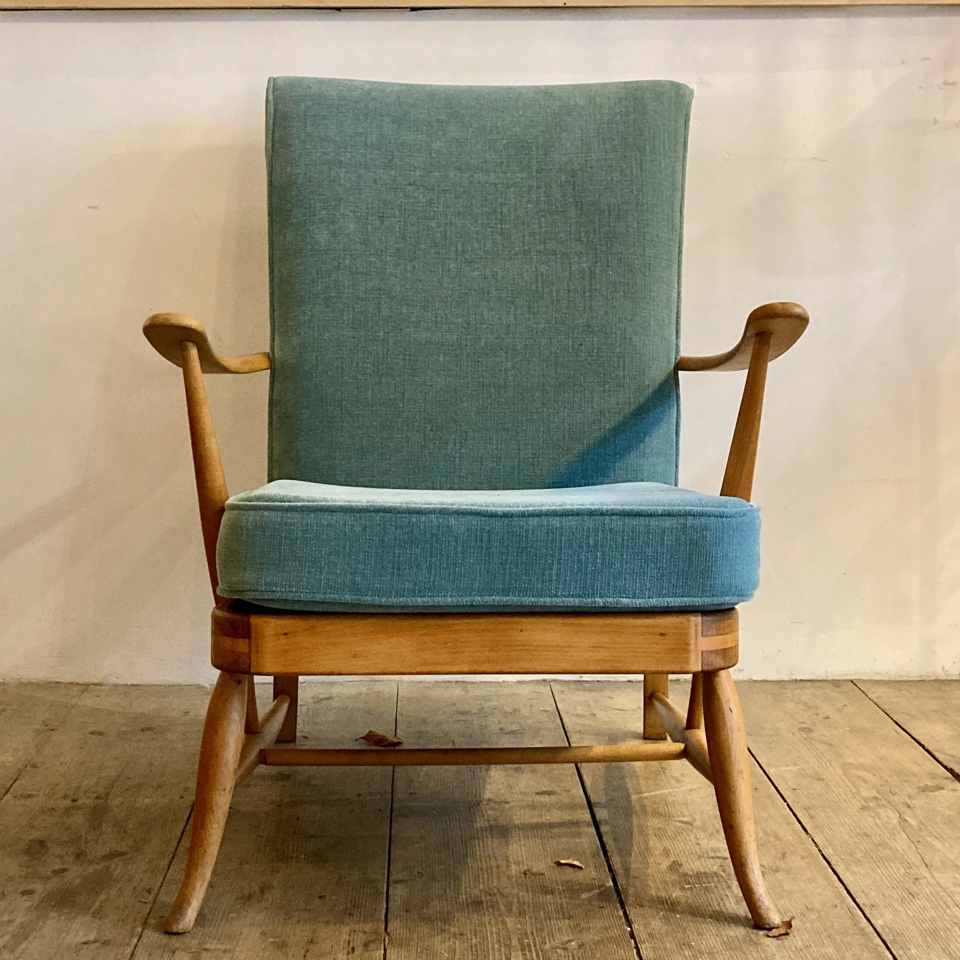 A 1950s Ercol easy armchair, carefully refurbished and newly reupholstered in a soft blue fabric. This classic Ercol design features the brand’s signature sculpted beech frame, gently curved arms and a light, open silhouette that works beautifully in both traditional and contemporary interiors.