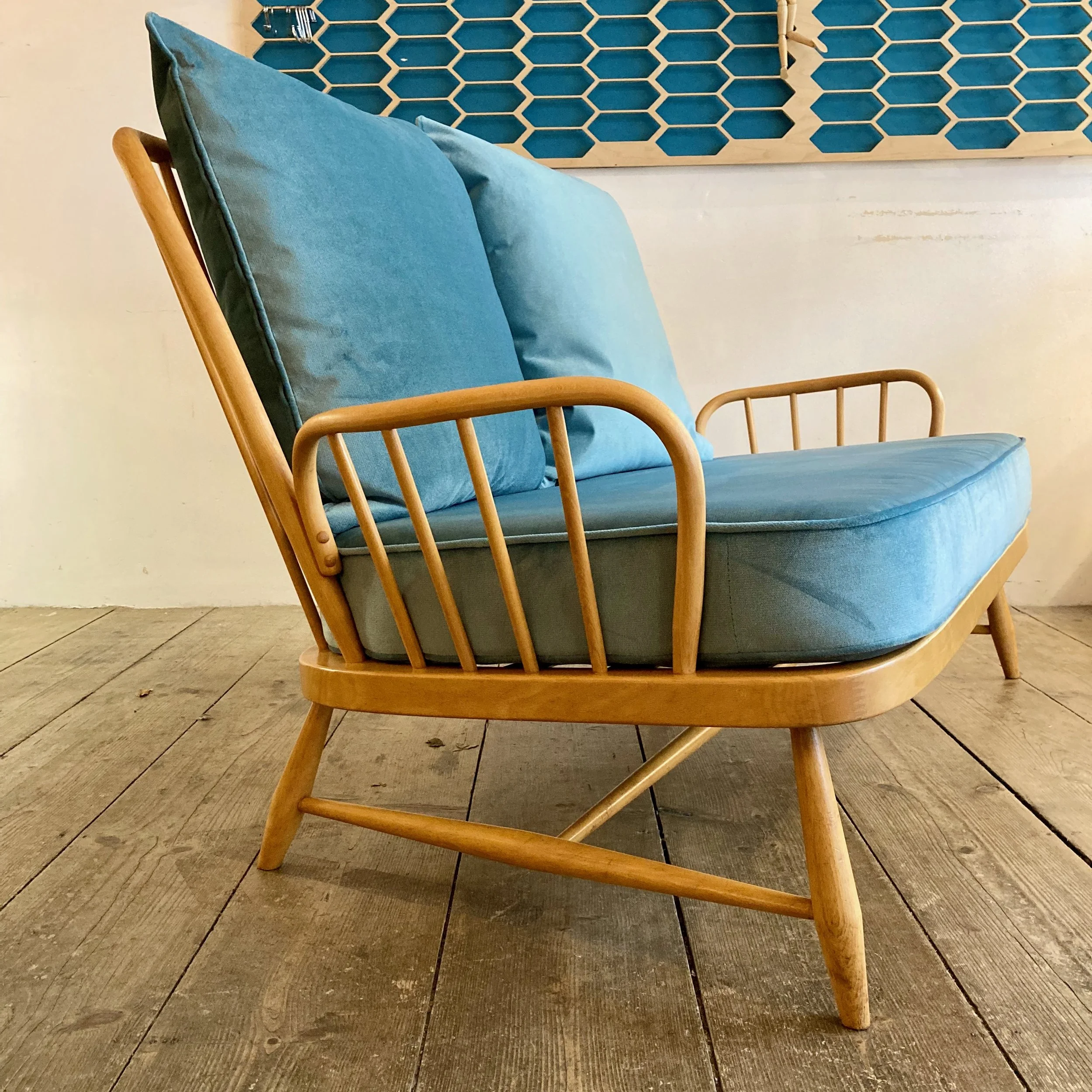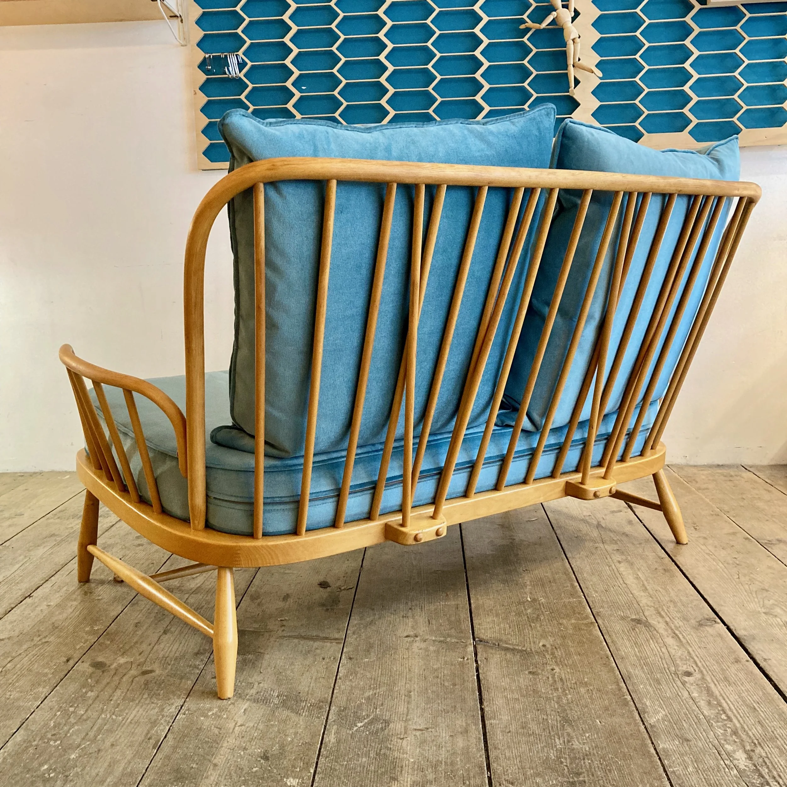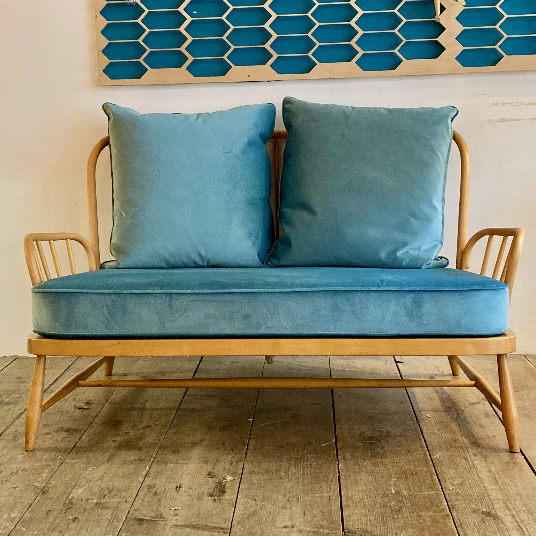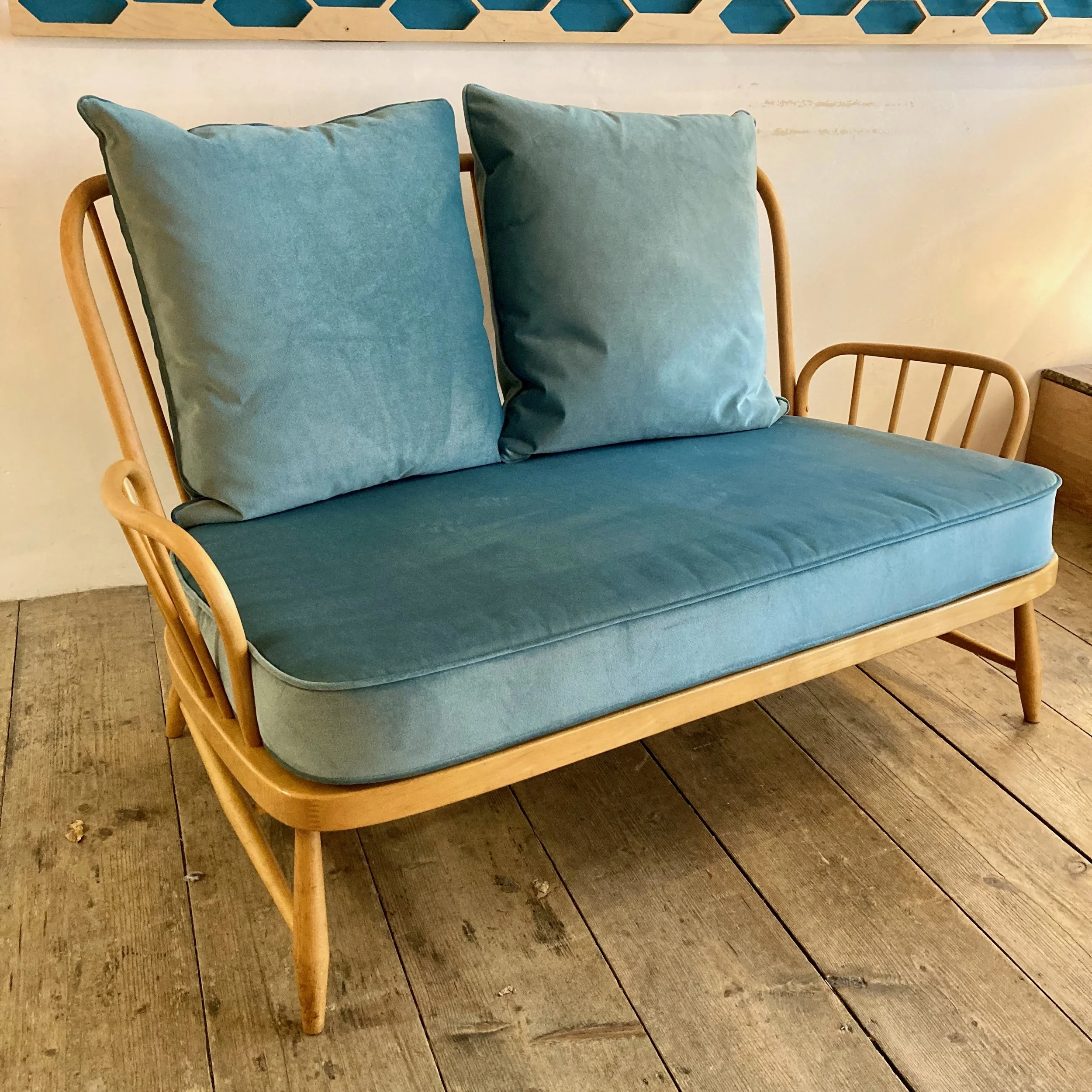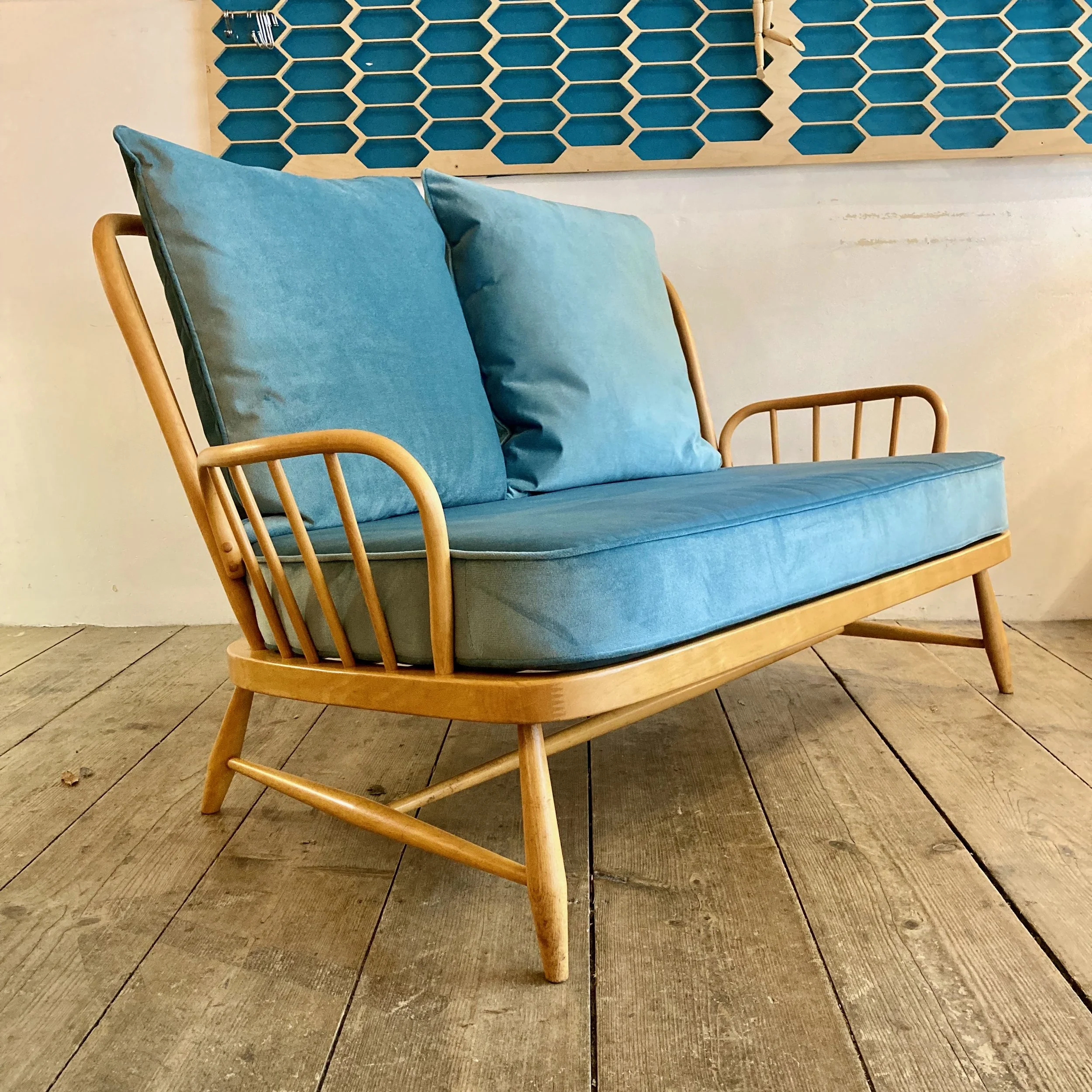 A beautifully restored and refurbished Ercol two-seater, showcasing the brand’s timeless craftsmanship. The solid frame has been carefully refreshed, while new cushions in a soft sky-blue fabric bringing a contemporary twist to this mid-century classic. Comfortable, stylish, and full of character – a standout piece for any living space.