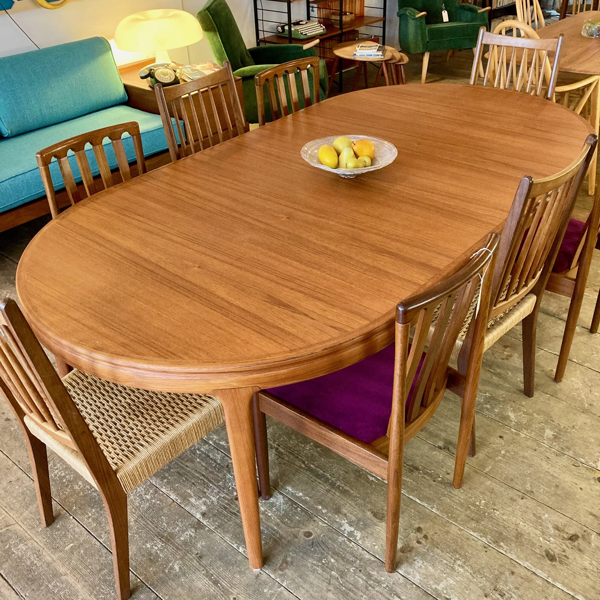 The teak grain has been carefully refinished, enhancing the rich colour and smooth surface while preserving the character of the original design. A statement piece that combines elegance, versatility, and practicality, perfect for both family dining and entertaining.