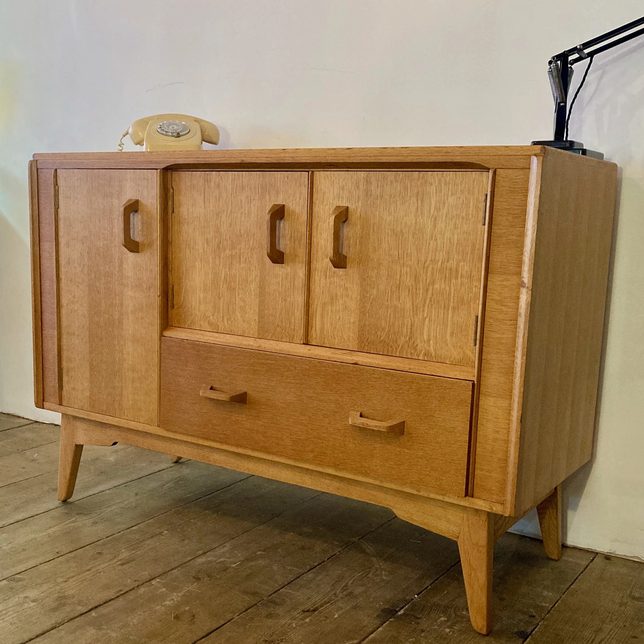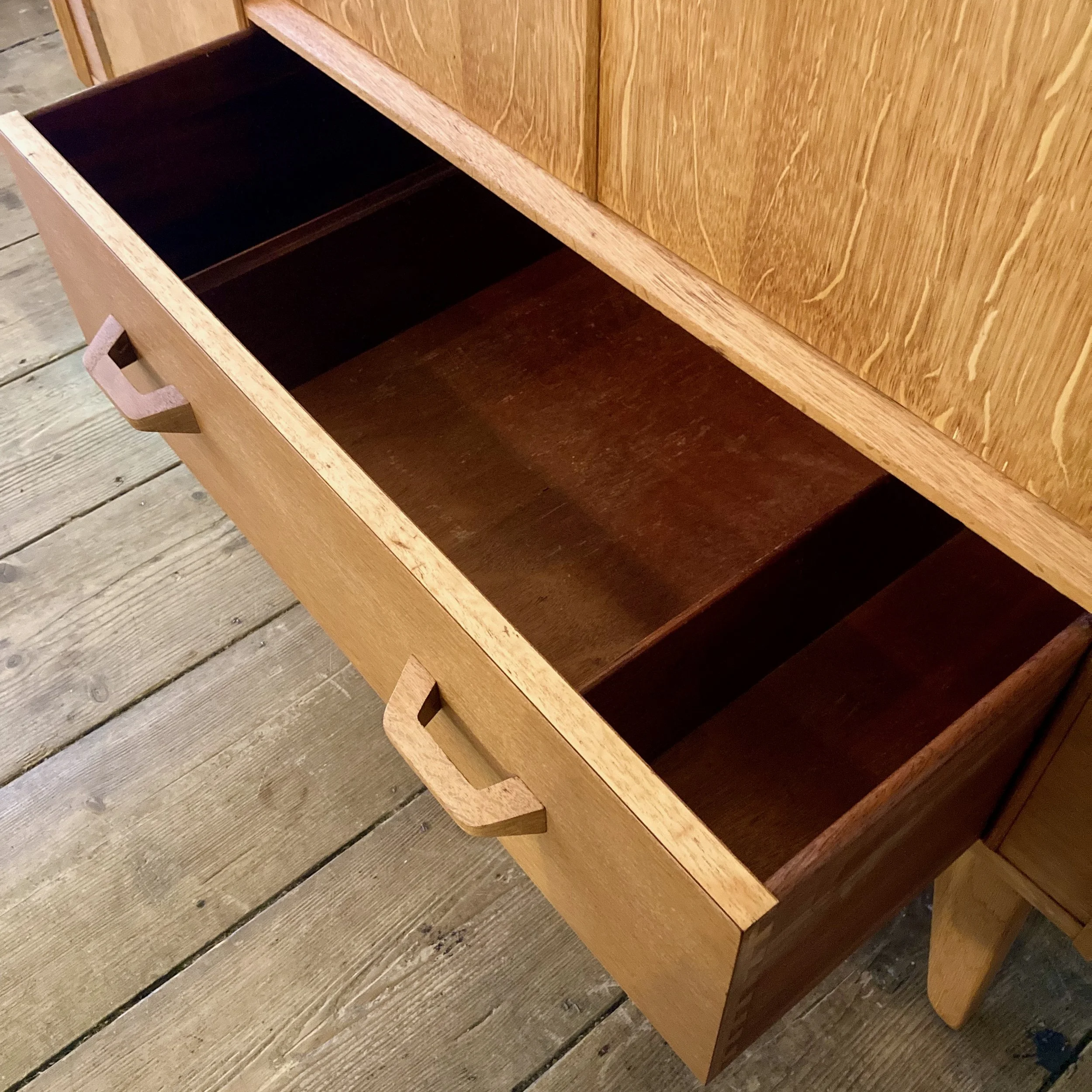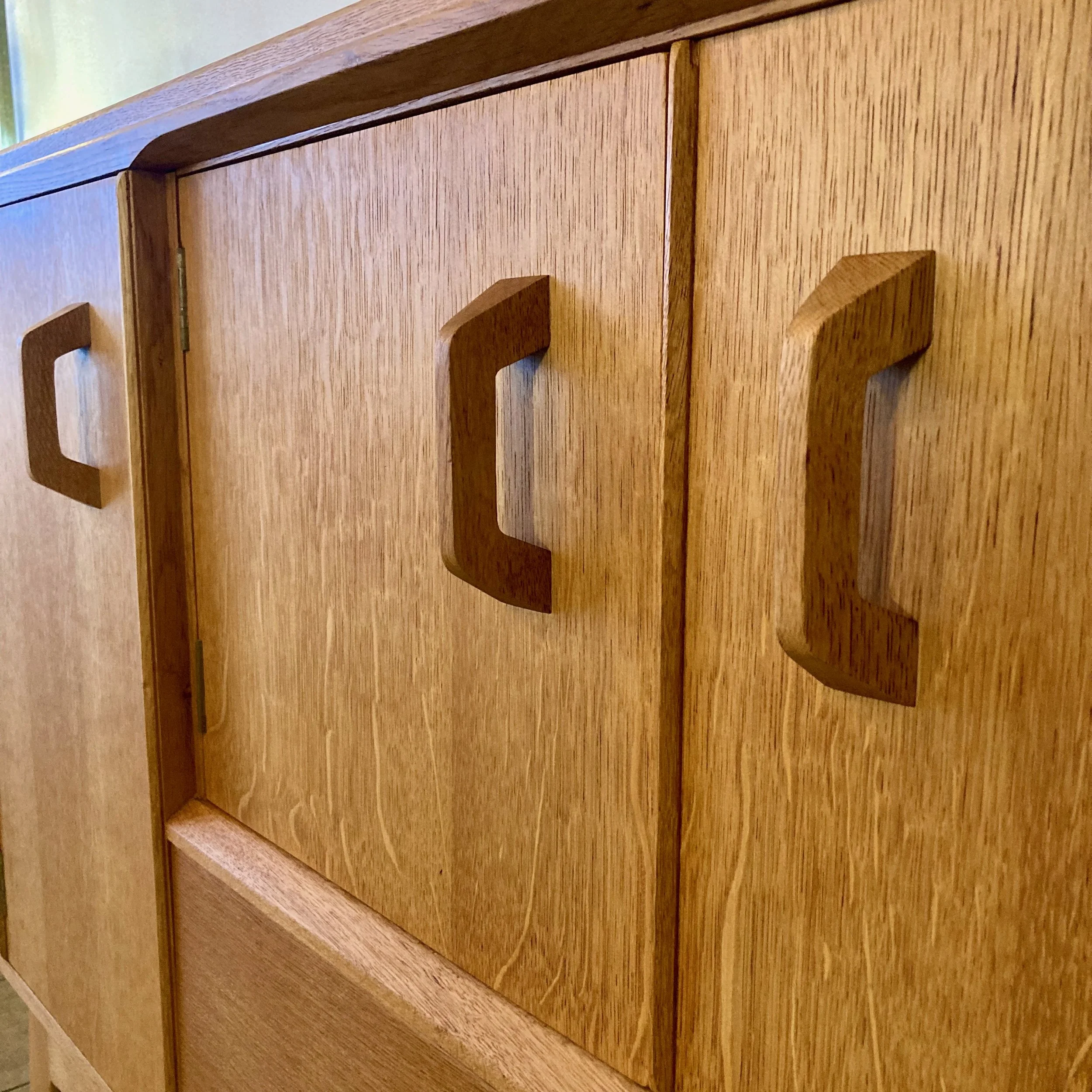 An oak G Plan sideboard from the 1950s Brandon range, beautifully restored and showcasing the craftsmanship and refined detailing that made this early G Plan collection so enduring. The piece features two separate cupboards with internal shelving for flexible storage, along with a smoothly running drawer for smaller essentials.