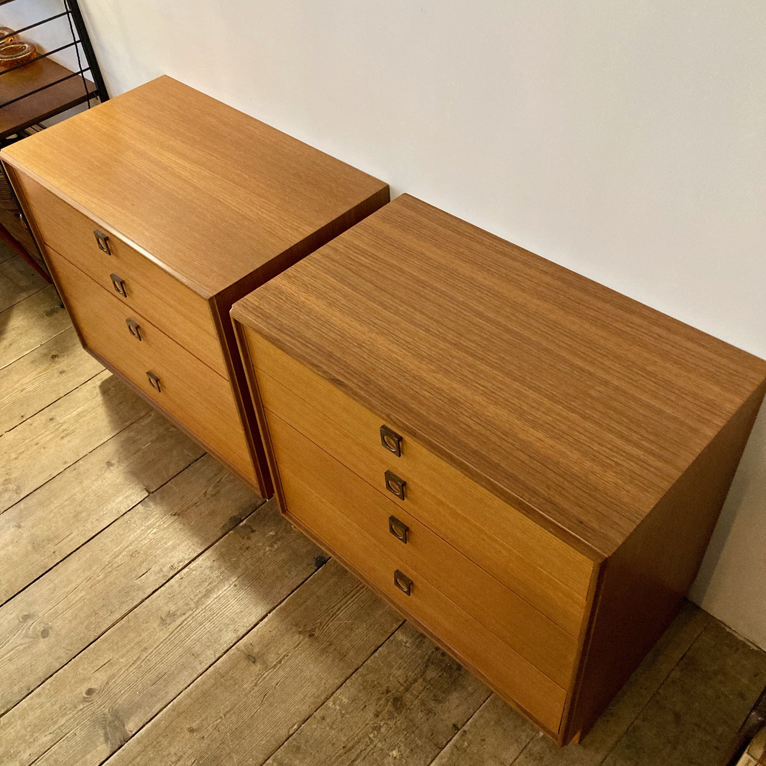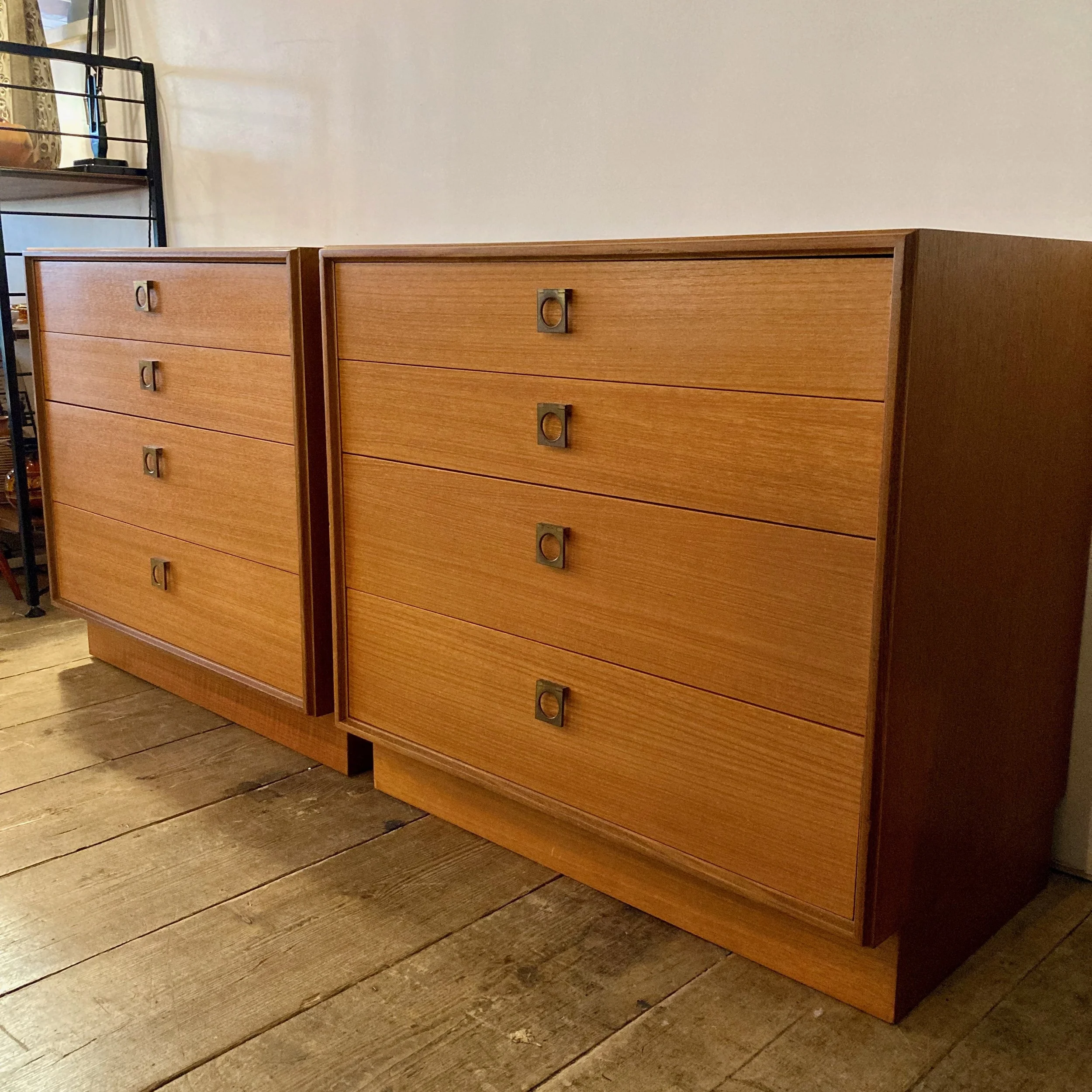A pair of 1970s G Plan teak chests of drawers from the sought-after Form Five range of bedroom furniture. Designed with the clean lines and warm teak tones that define G Plan’s mid-century aesthetic, these pieces are both functional and beautifully made.