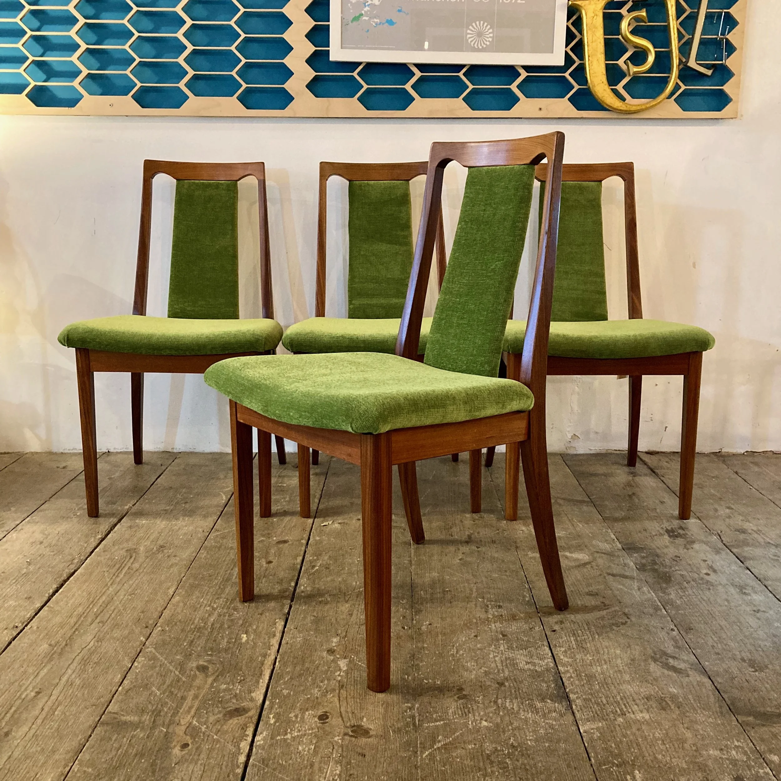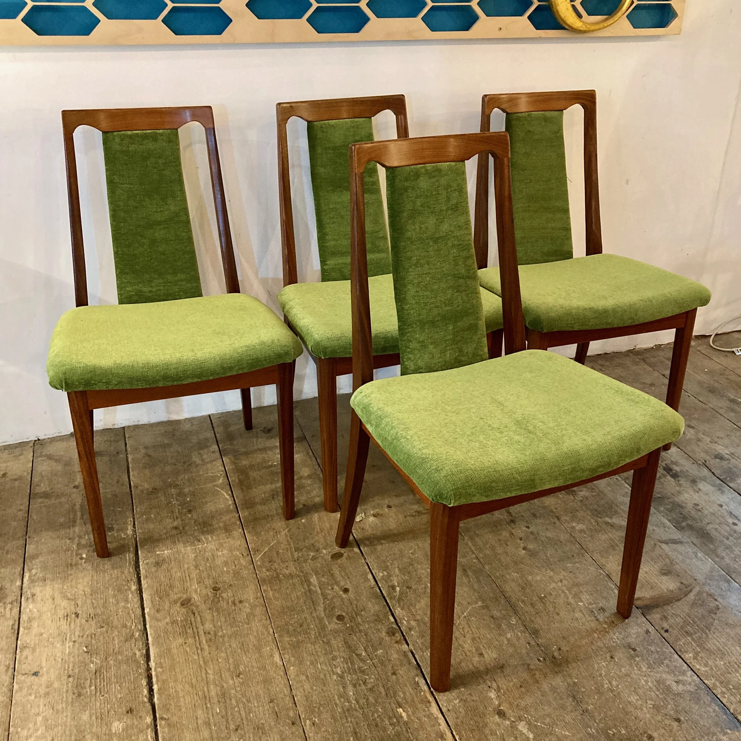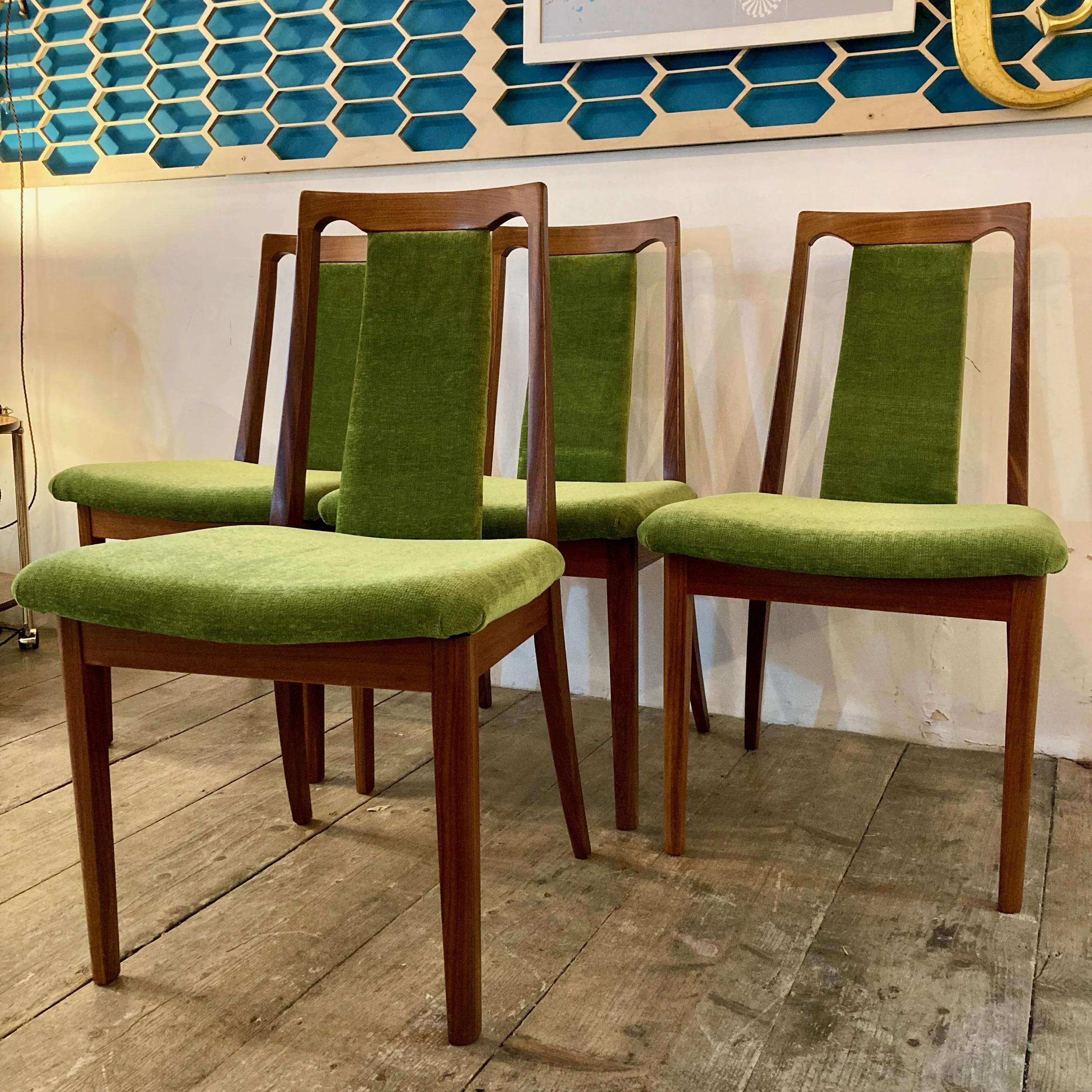A smart set of four 1970s G Plan dining chairs, crafted from rich solid teak and beautifully proportioned in classic mid-century style.