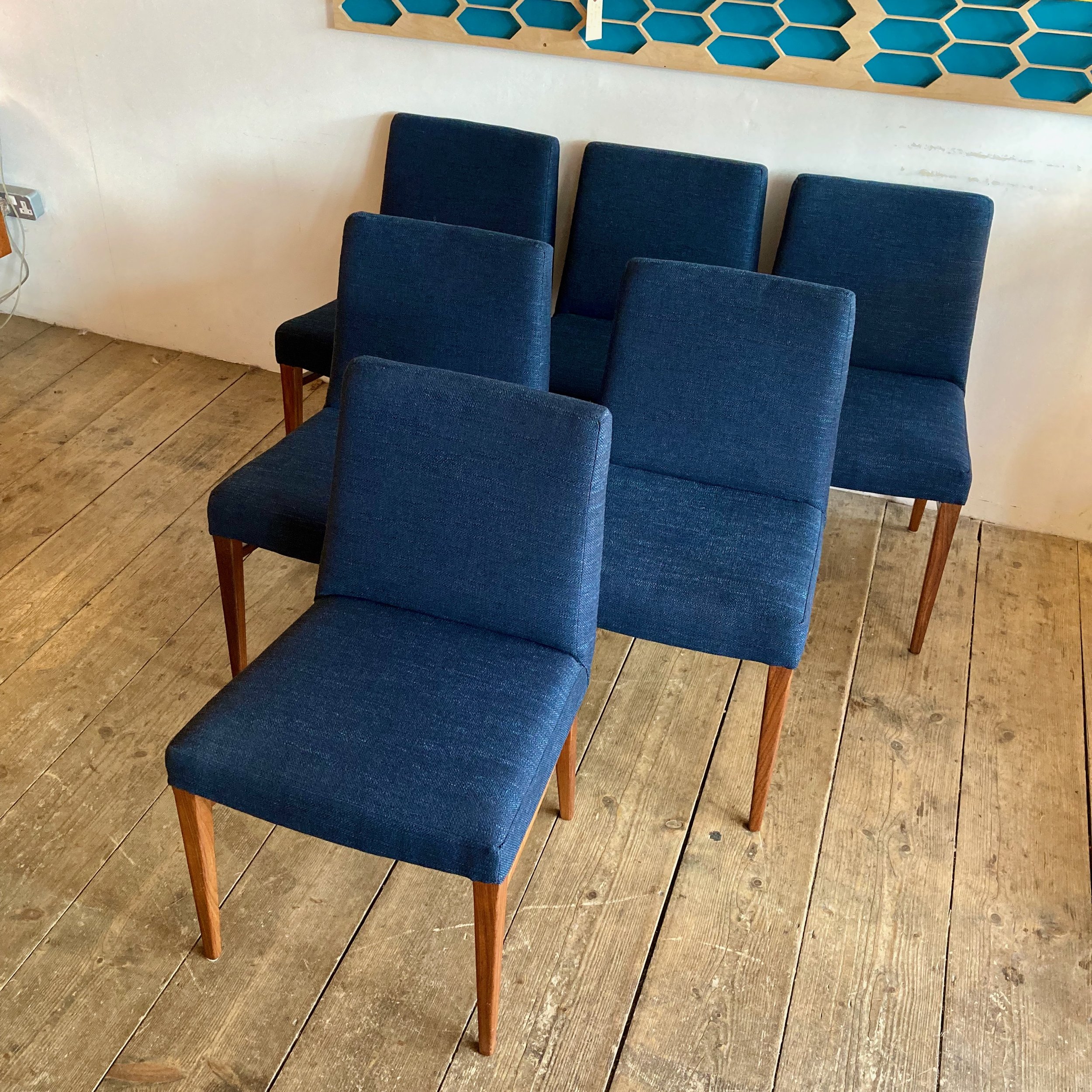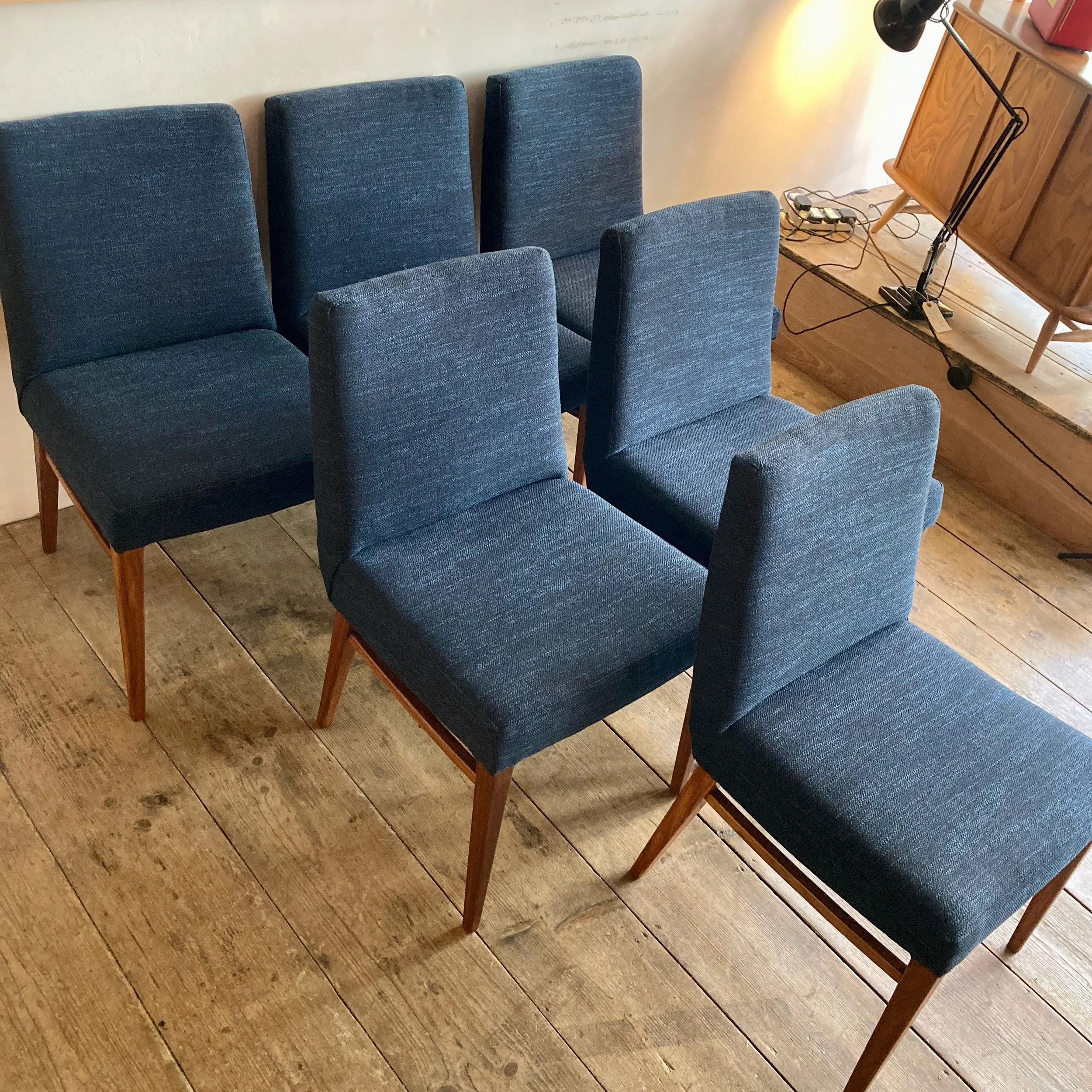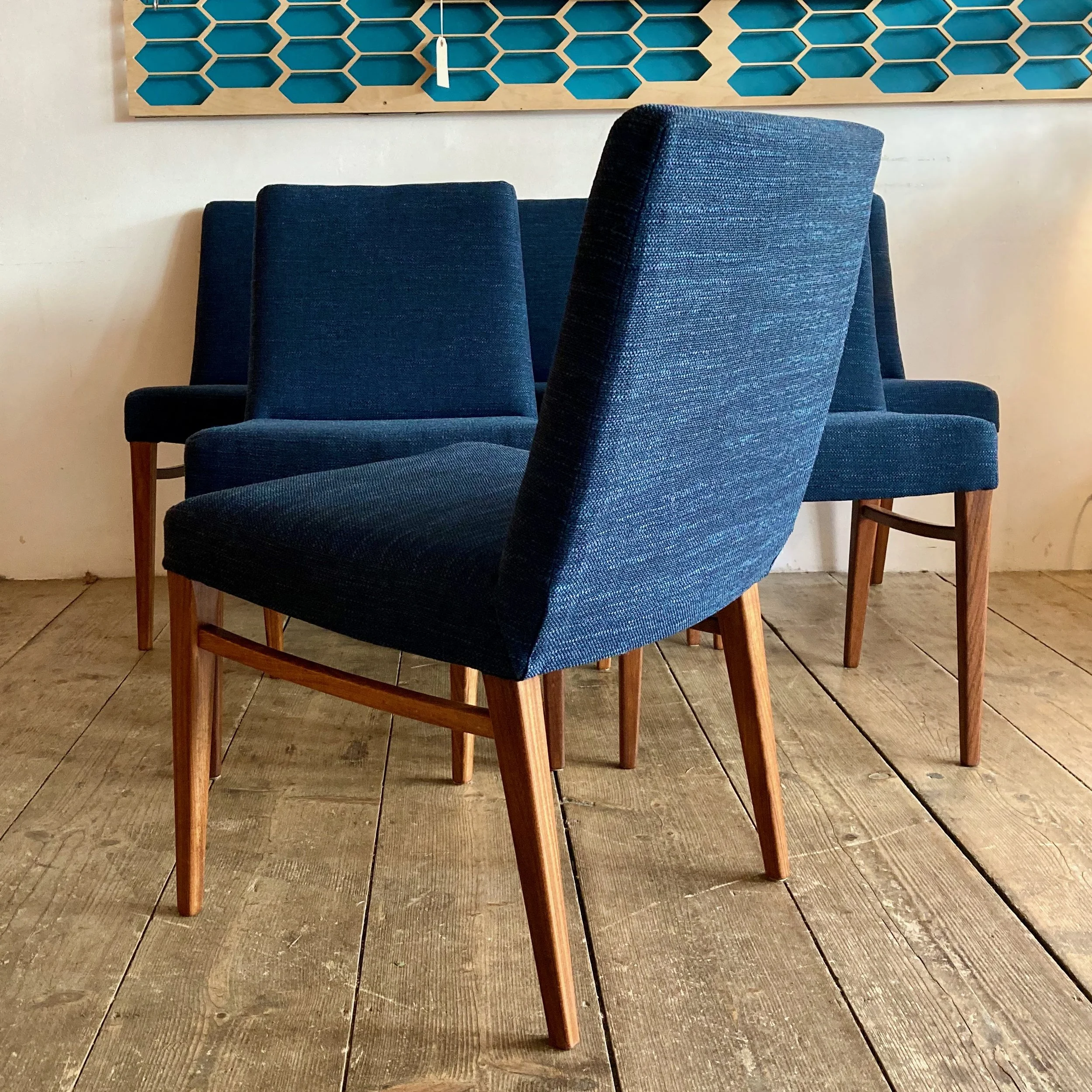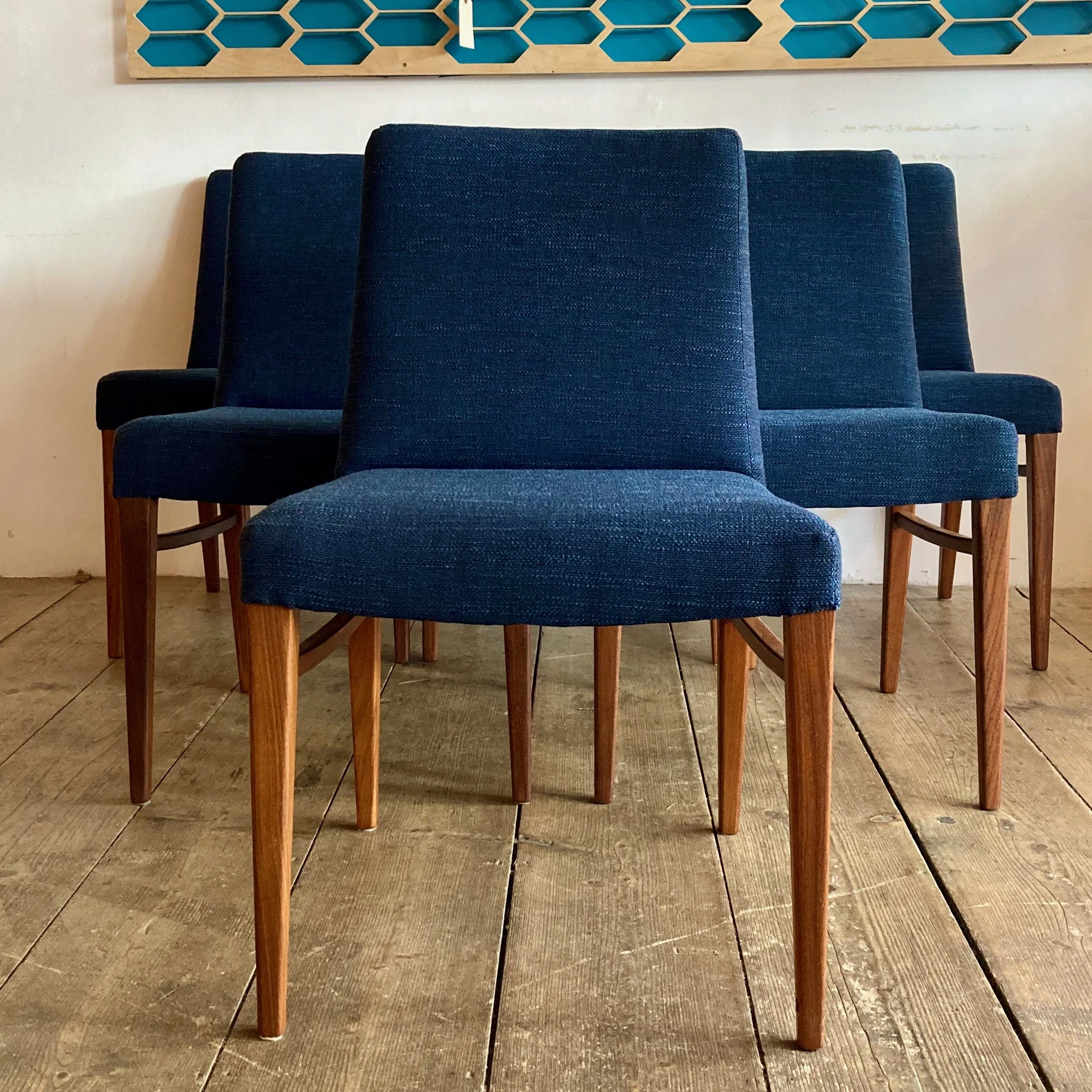 Each chair has been professionally reupholstered in a soft dark blue fabric, offering a rich contrast to the warm tones of the teak while providing comfort for everyday dining. The shaping of the backrests and seats ensures both support and visual lightness, making them as comfortable as they are refined.