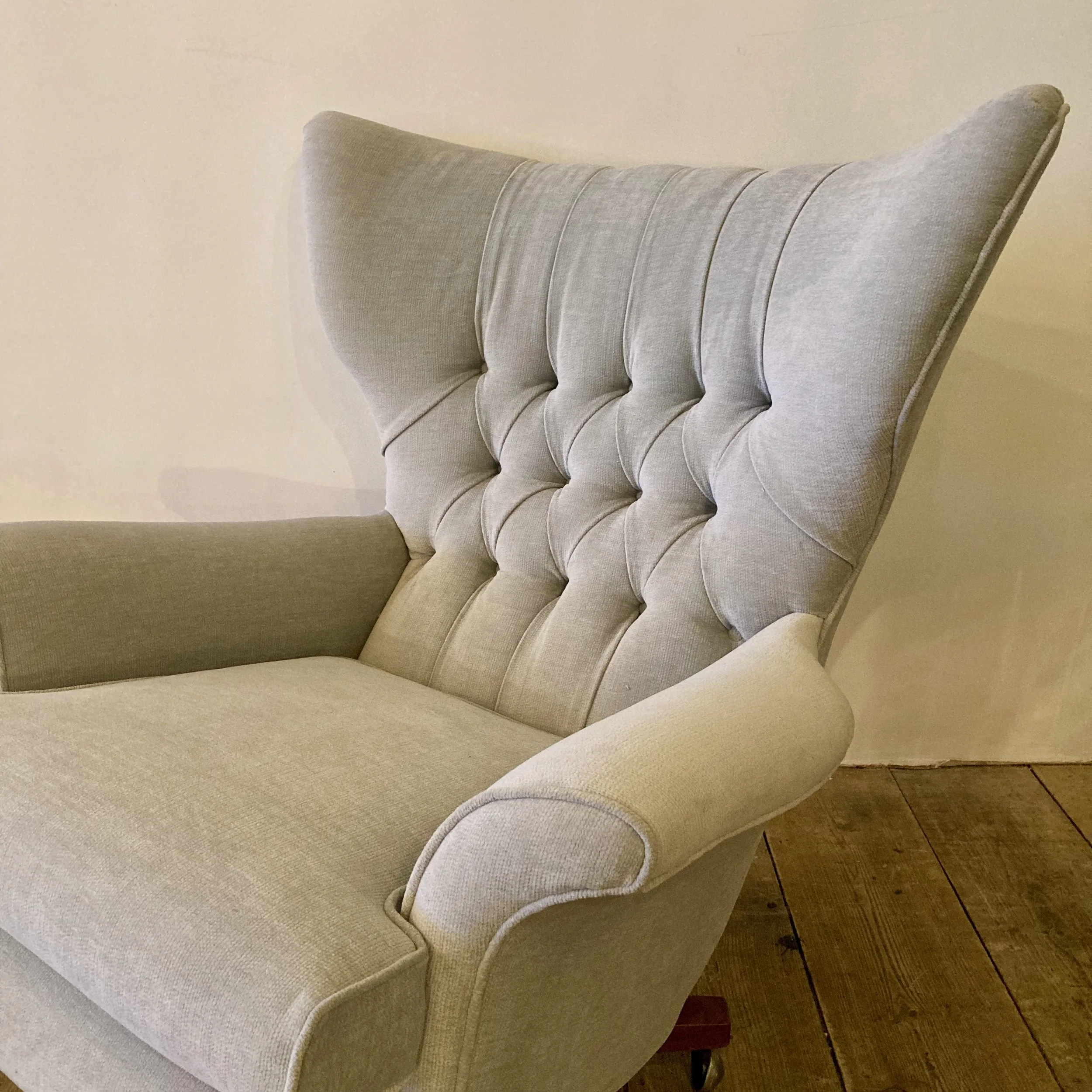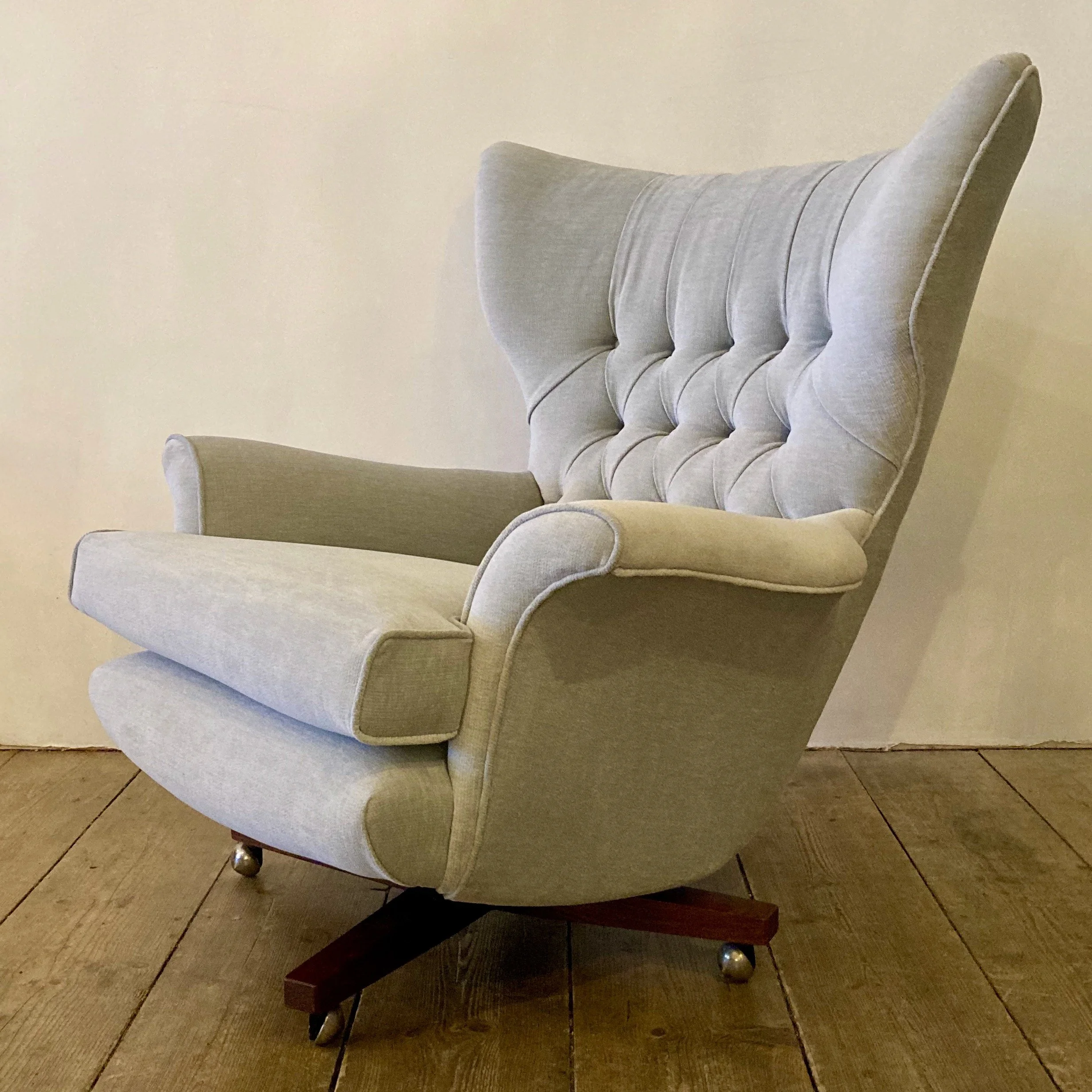 This striking 1970s G Plan 62 armchair has been fully reupholstered in a soft silver grey fabric, transforming it into an elegant and modern statement piece. Known for its bold curves and unmistakable silhouette, the Model 62 remains one of G Plan’s most iconic mid-century designs.