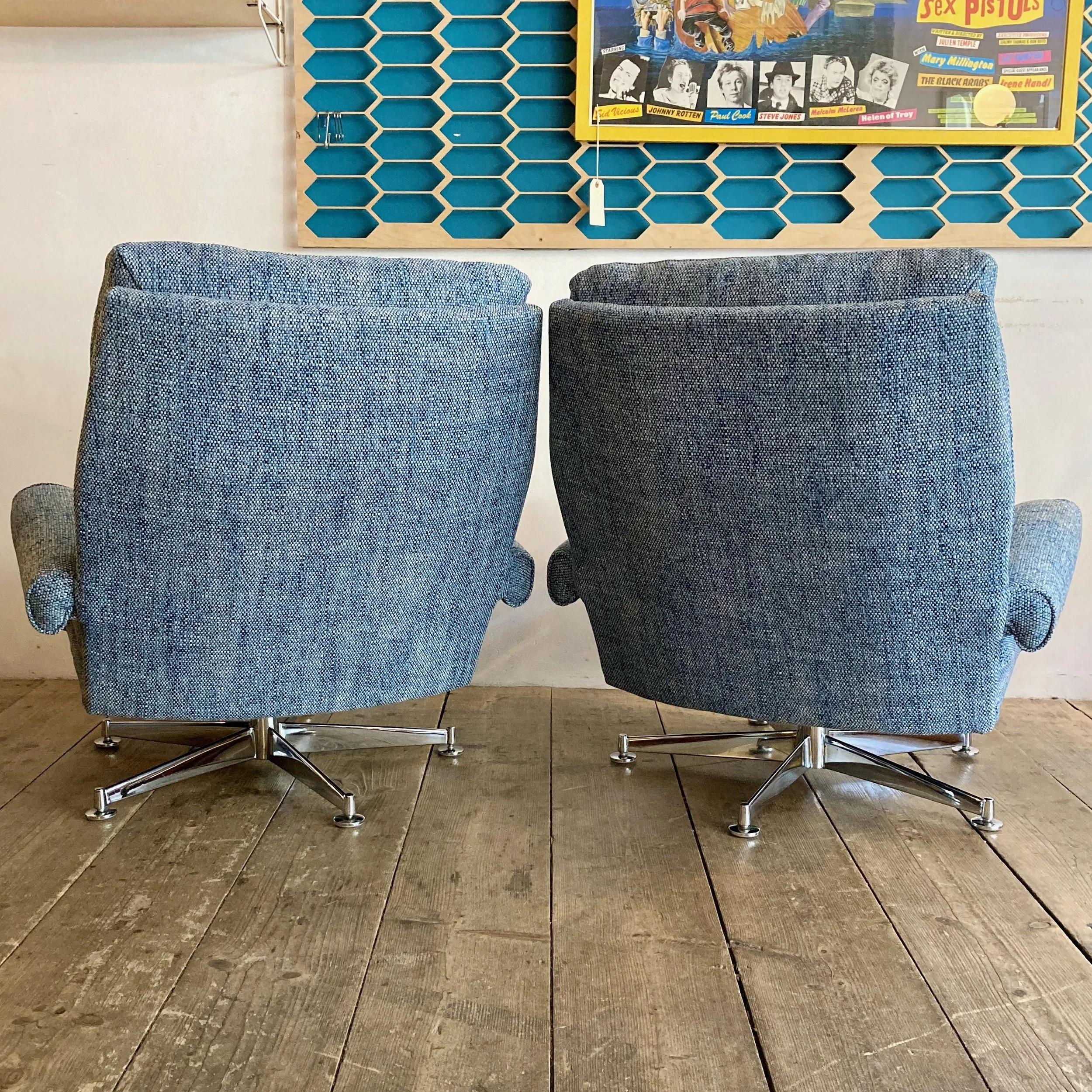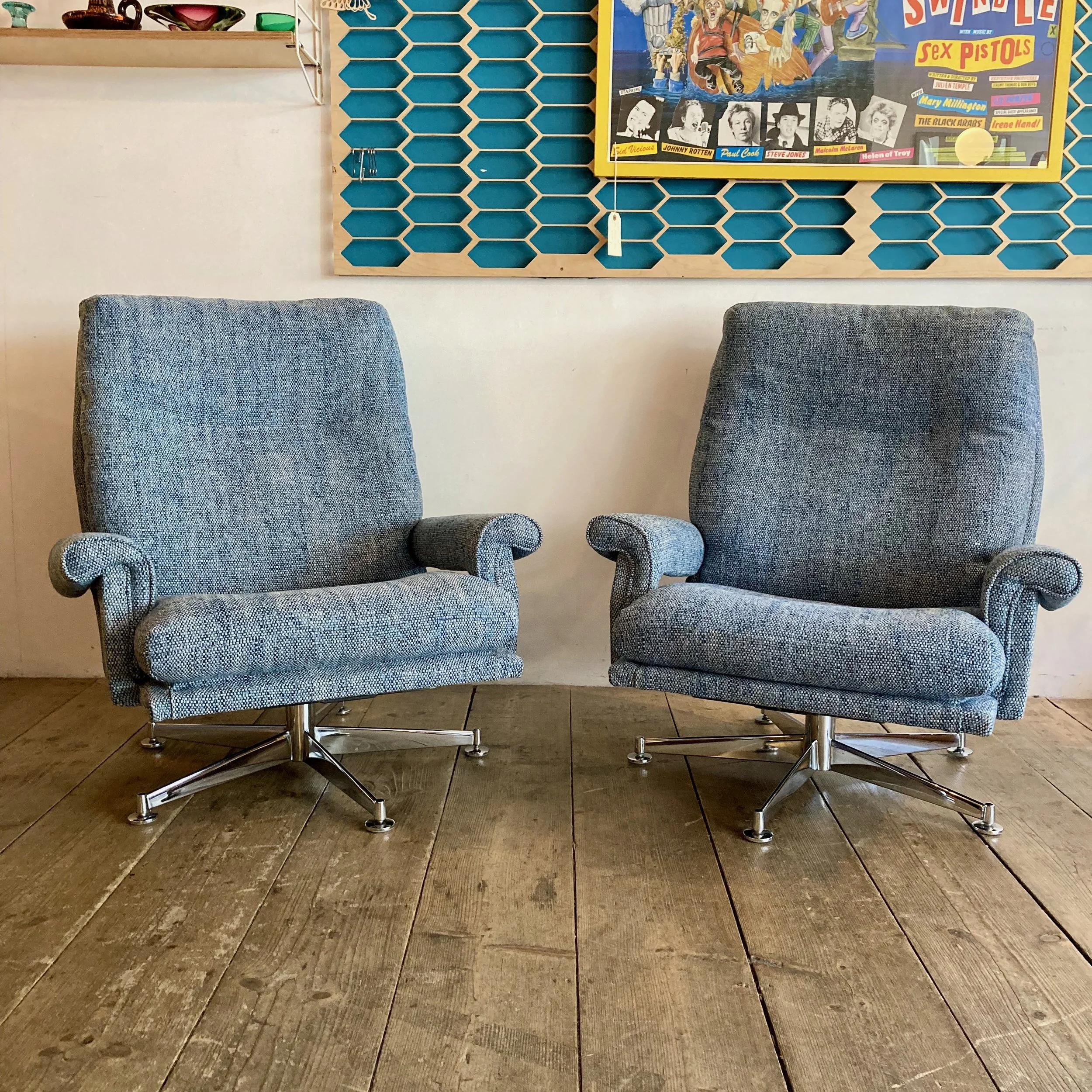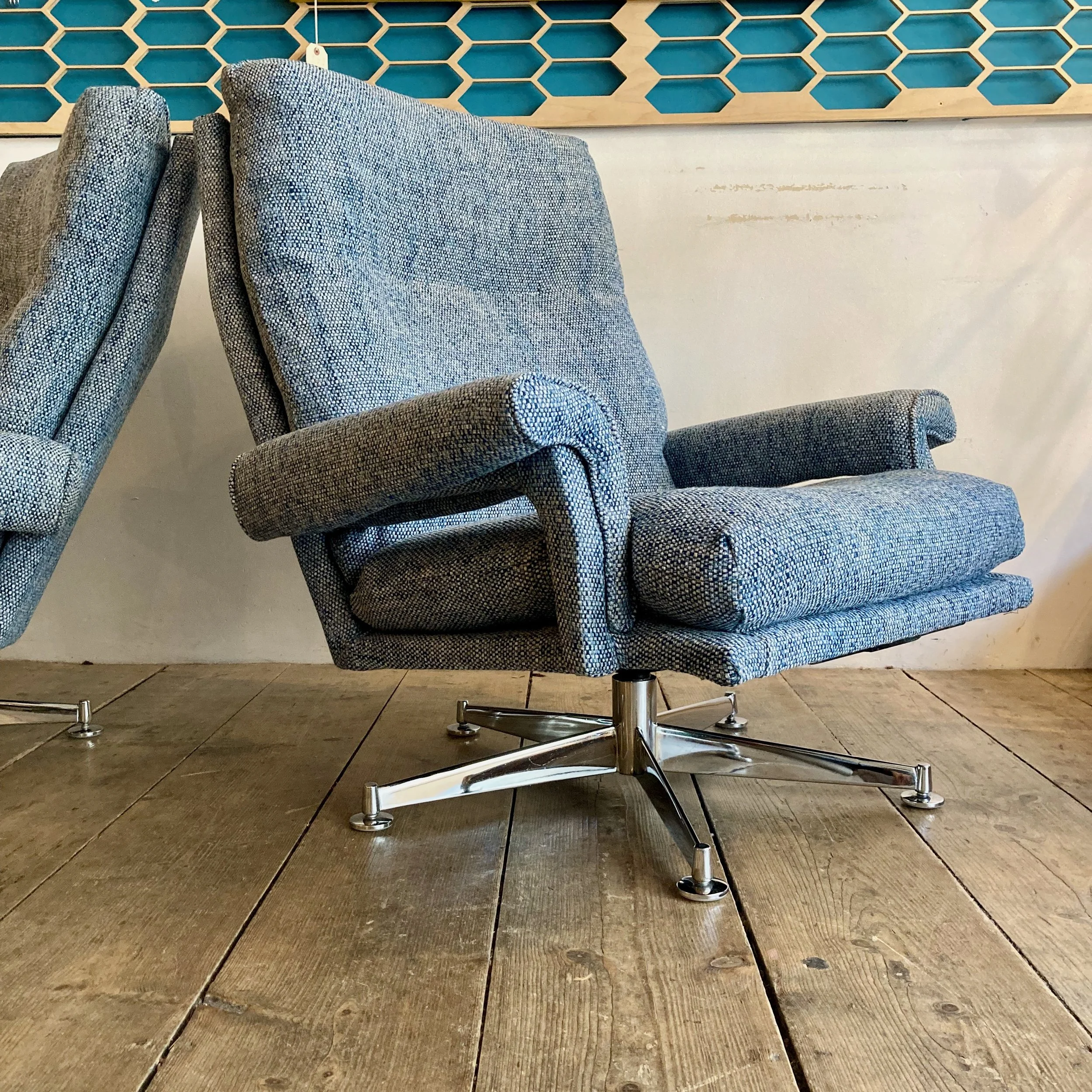Both chairs have been fully refurbished and reupholstered in a soft blue fabric, giving them a fresh, contemporary feel while complementing their vintage character. The swivel bases add a practical and playful element, perfect for relaxed, flexible seating.
