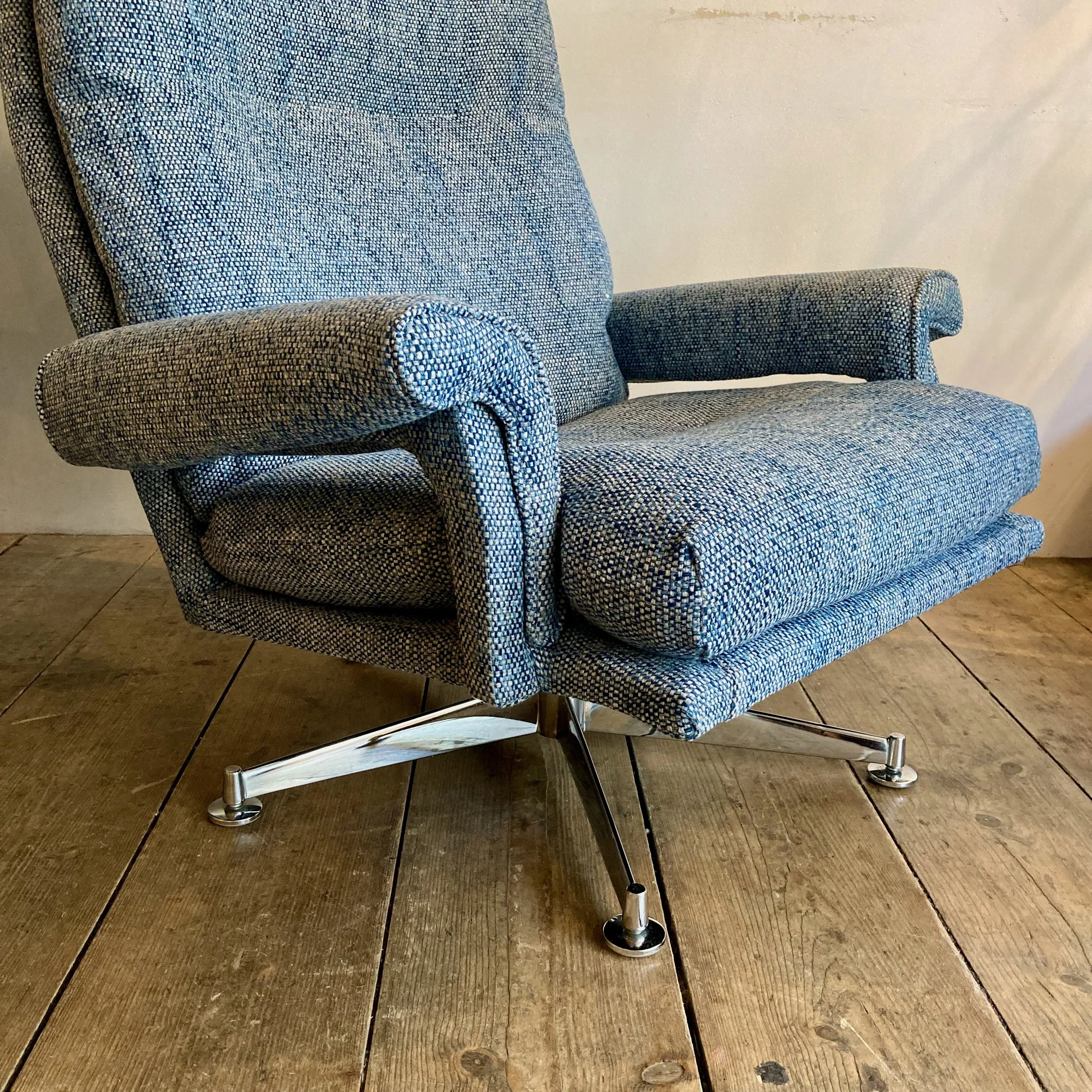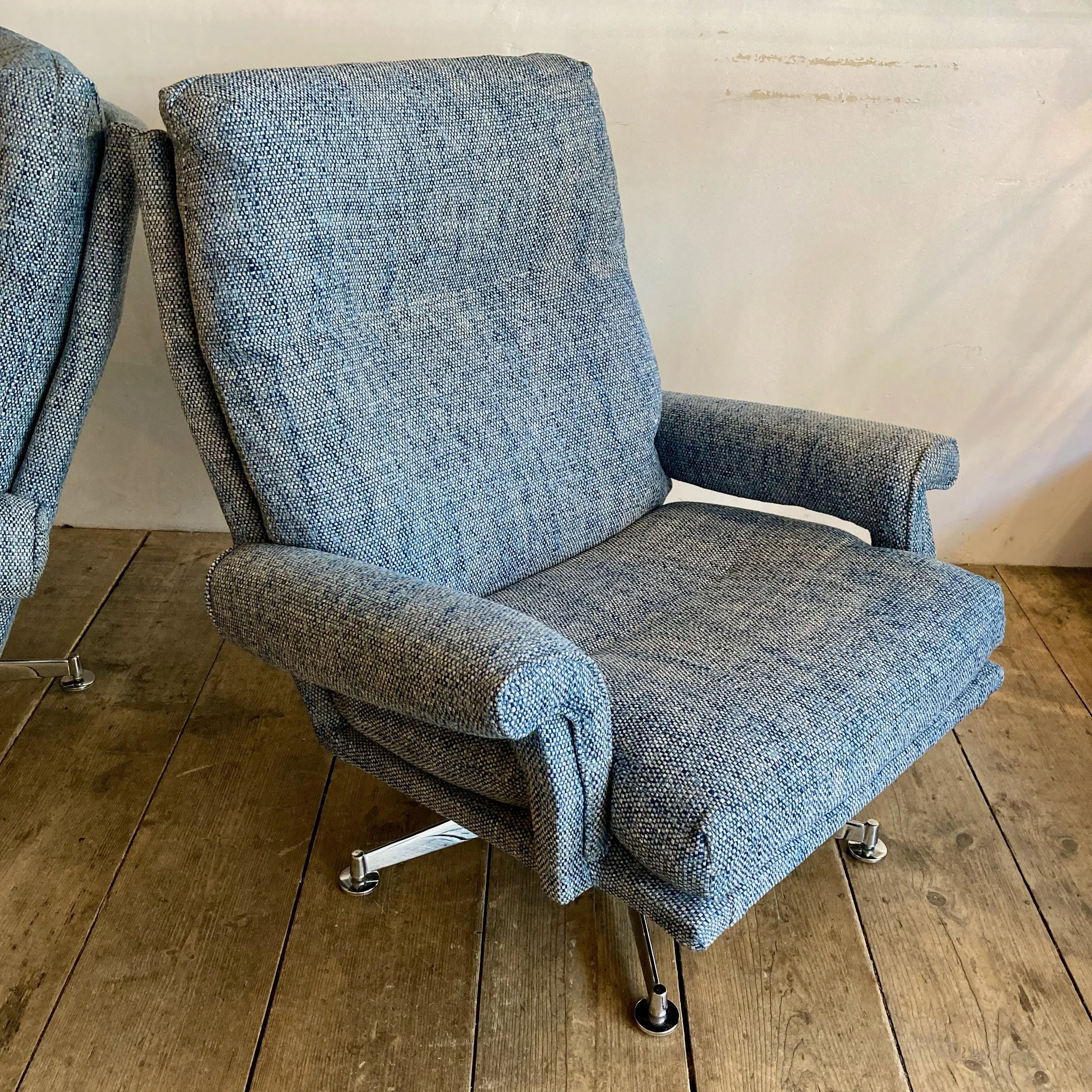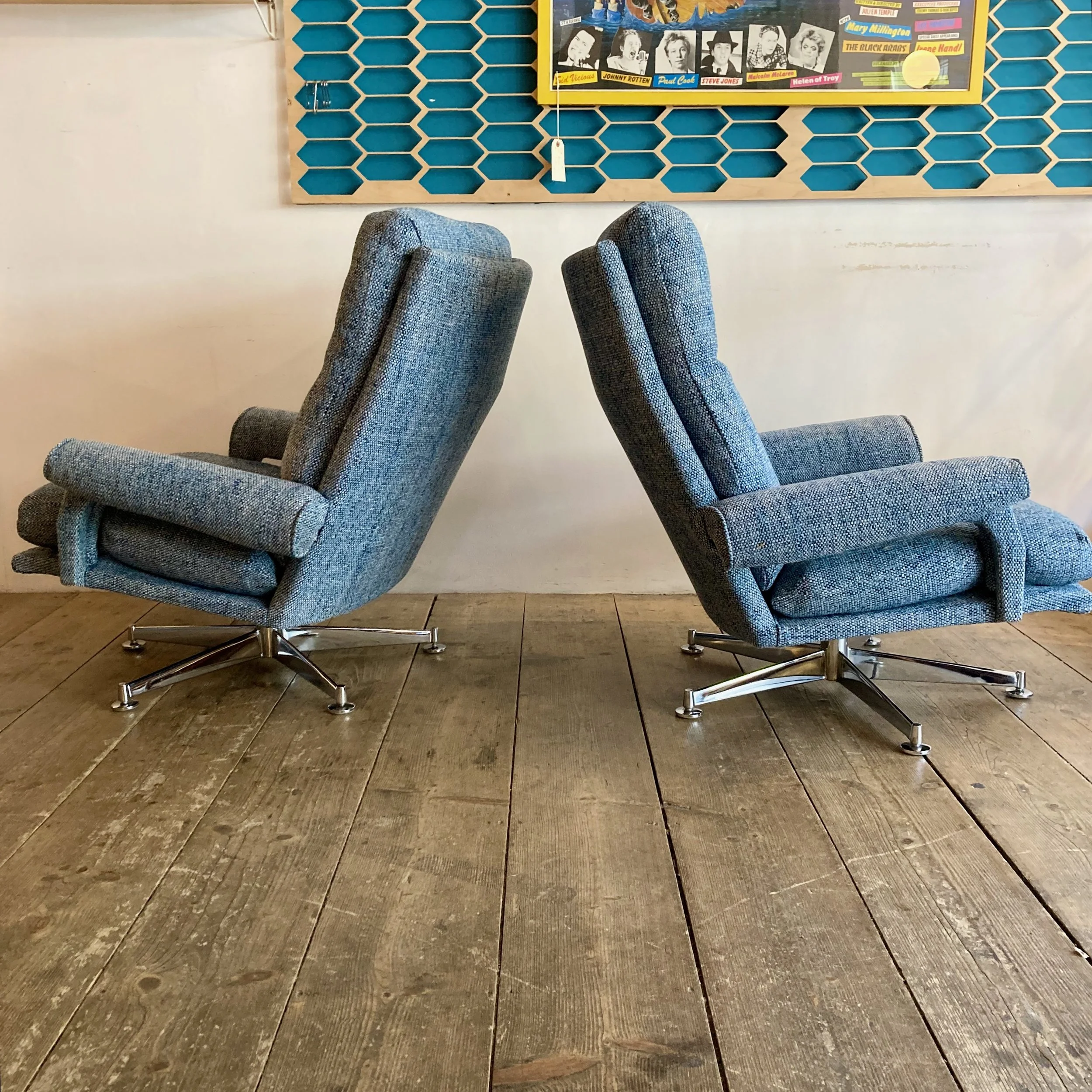 Both chairs have been fully refurbished and reupholstered in a soft blue fabric, giving them a fresh, contemporary feel while complementing their vintage character. The swivel bases add a practical and playful element, perfect for relaxed, flexible seating.