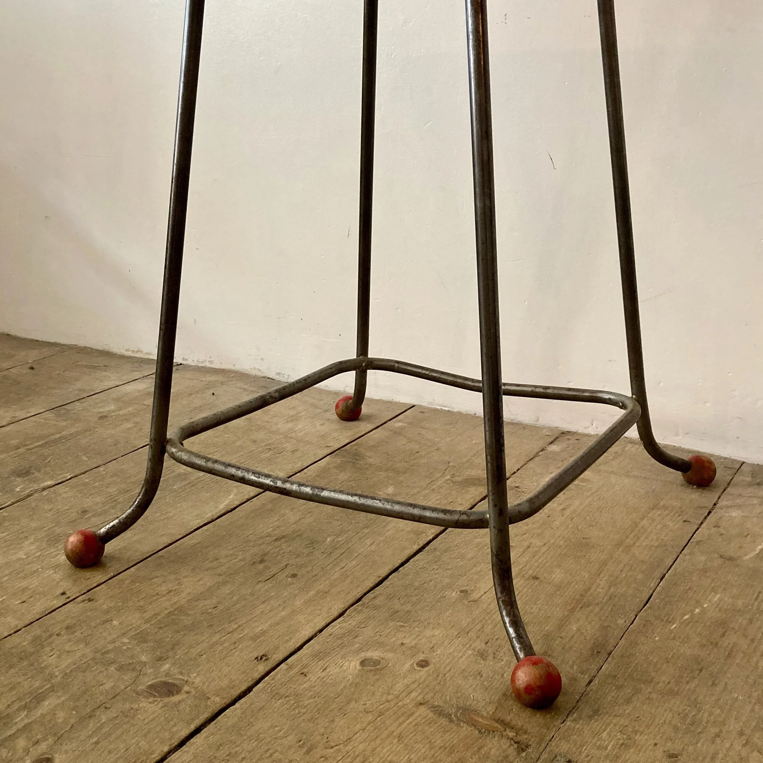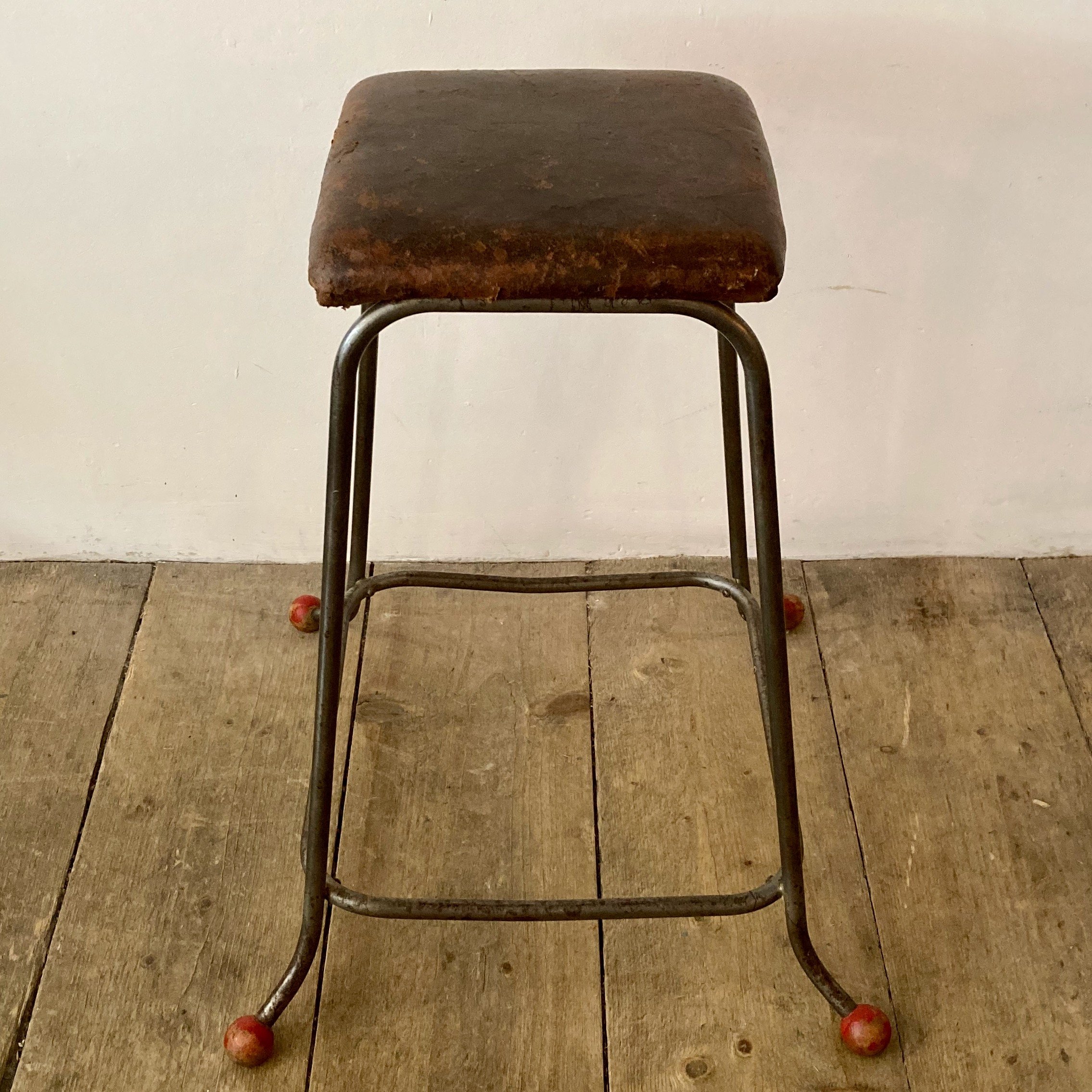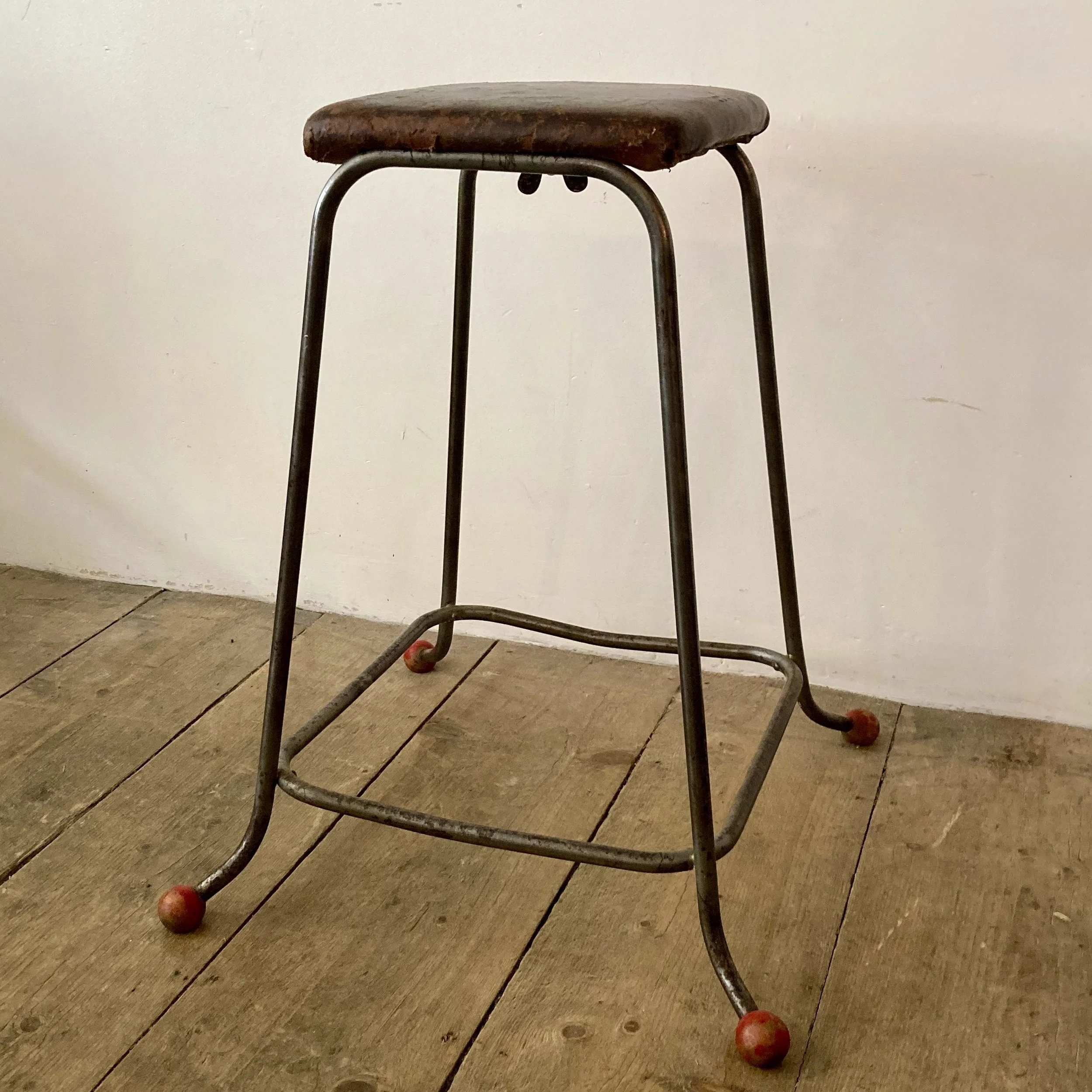 A striking 1950s industrial-style stool, featuring a sturdy metal frame and a richly patinated leather seat. Set on distinctive wooden ball feet, this piece perfectly blends utilitarian design with vintage character.