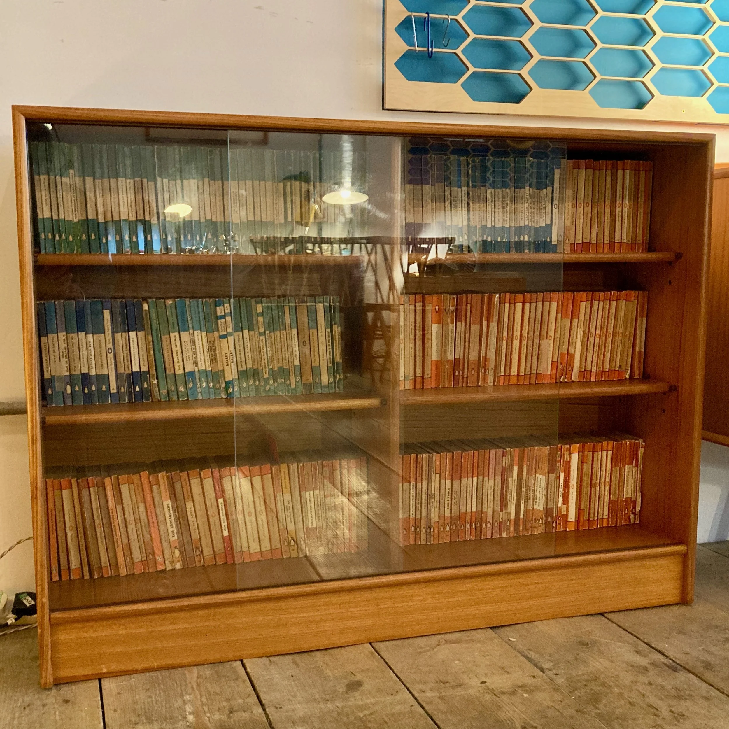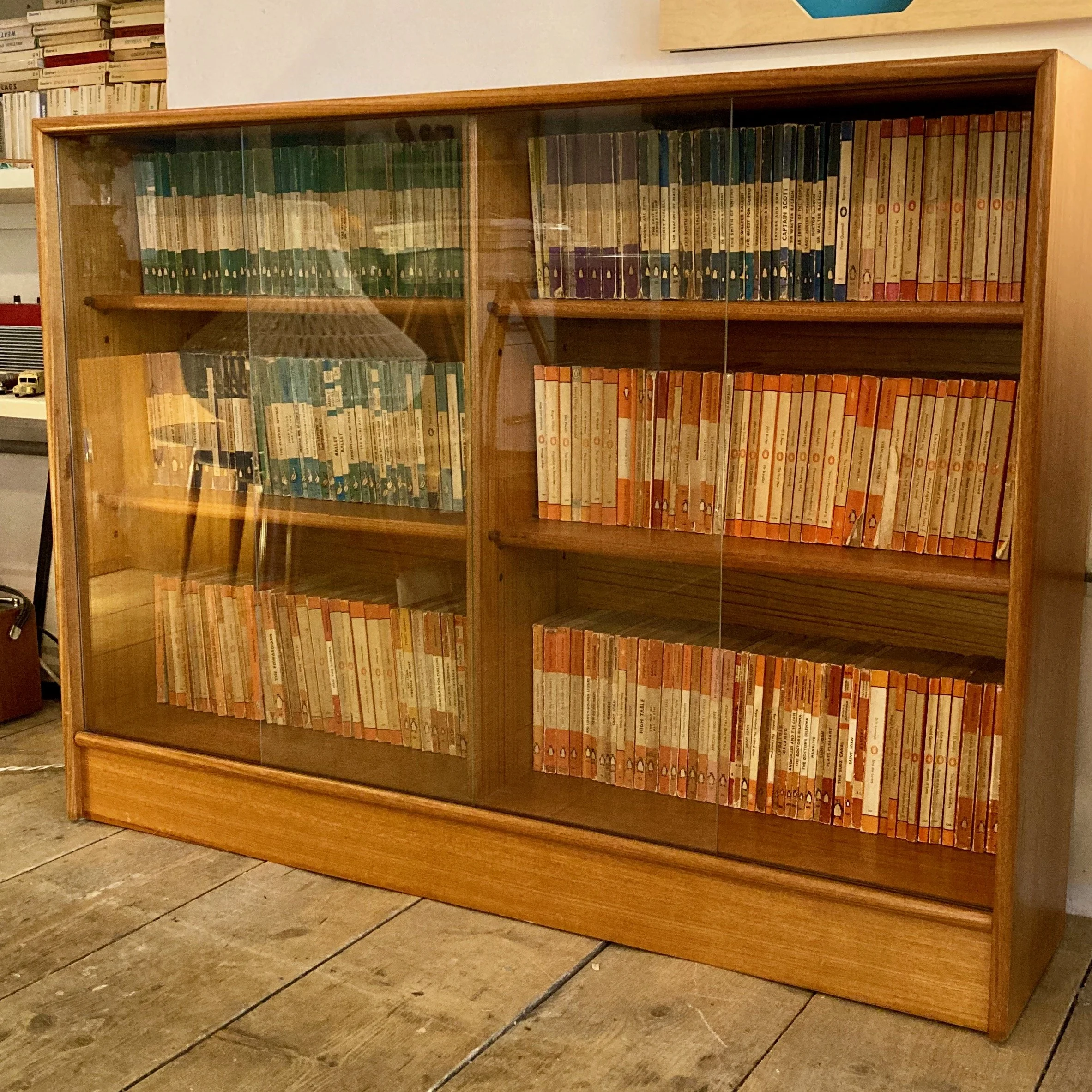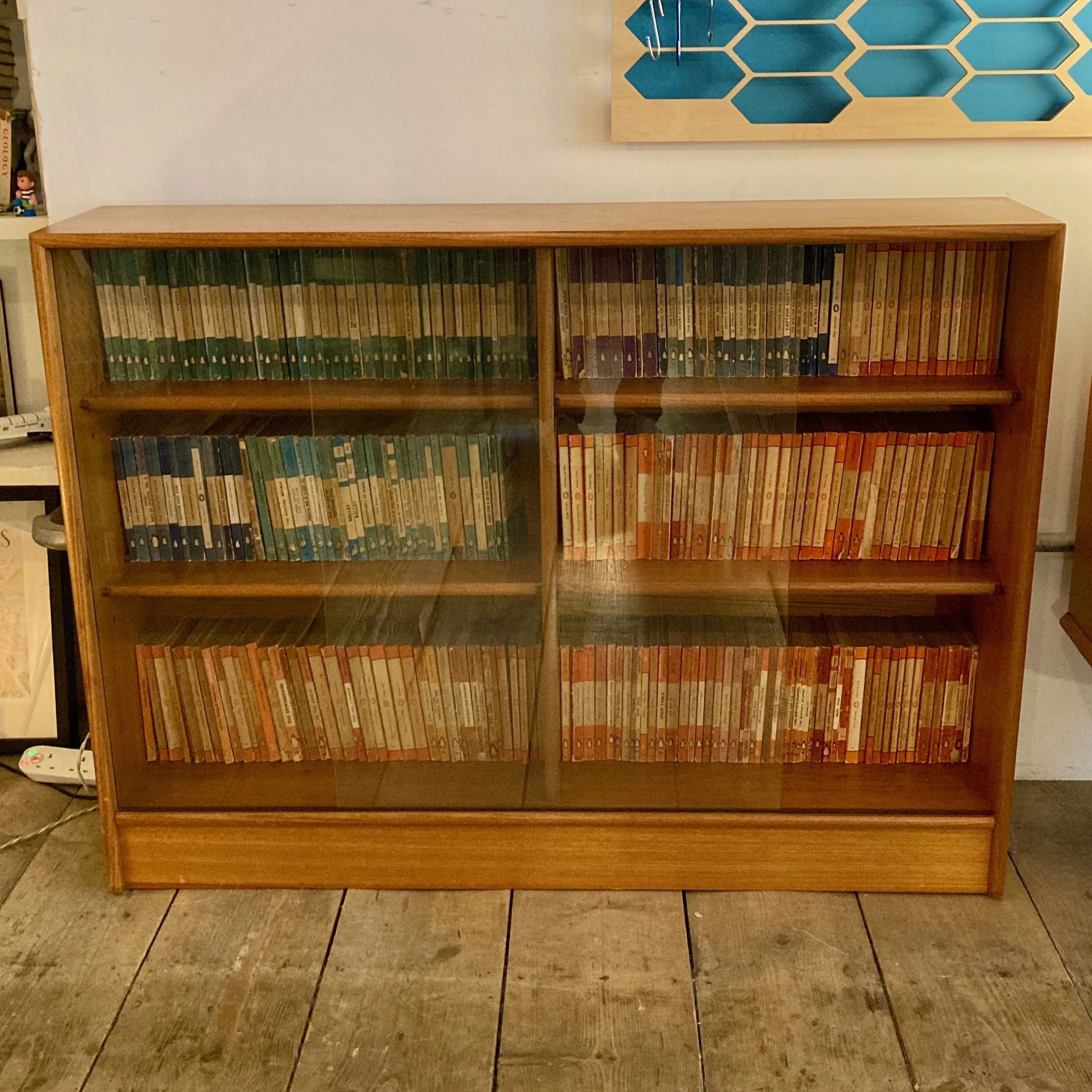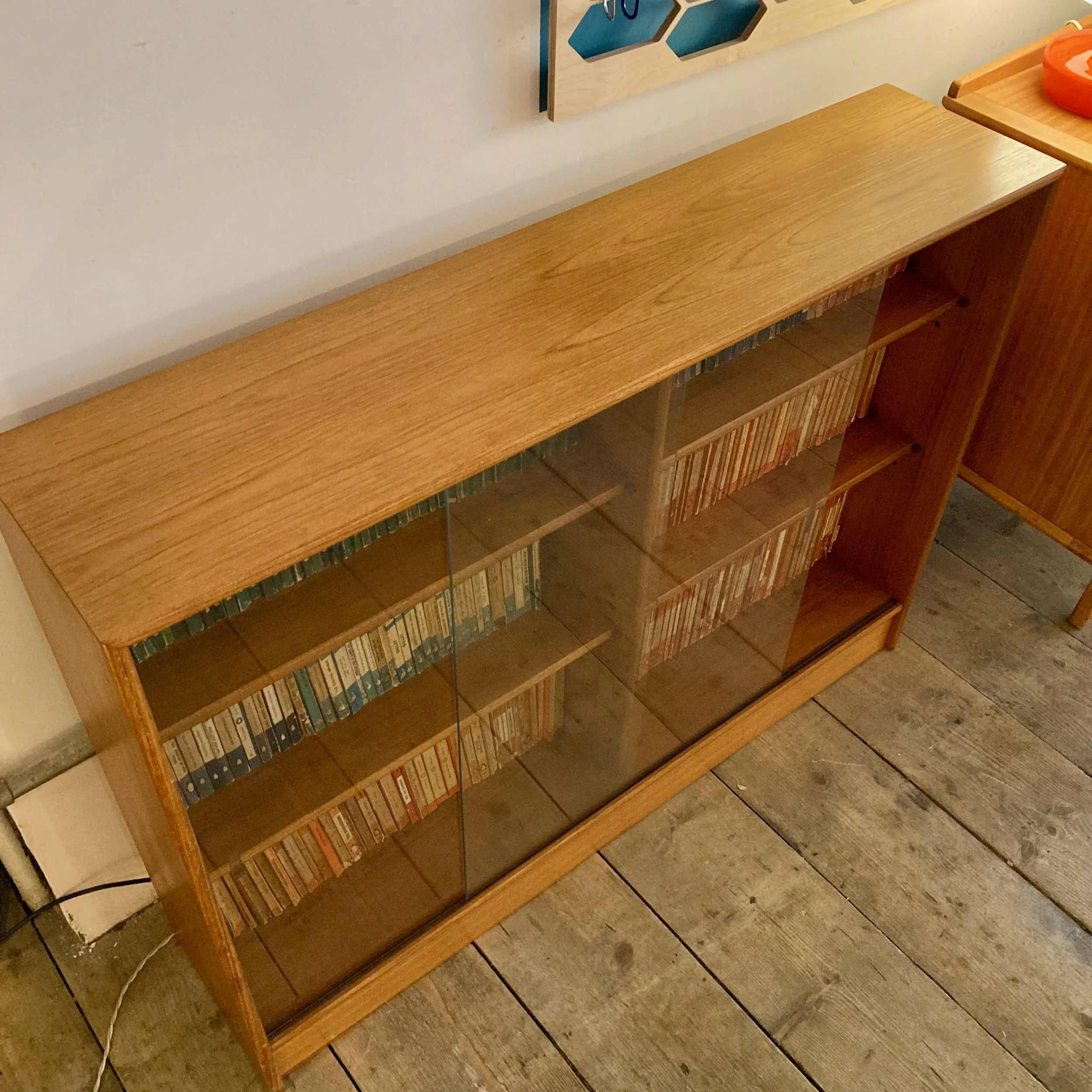 A glazed teak bookcase from the 1960s, showcasing the clean lines and warm tones typical of mid-century Scandinavian-inspired design. This versatile piece features sliding glass doors and adjustable shelving, perfect for displaying books, ceramics, or collectables while keeping them dust-free.