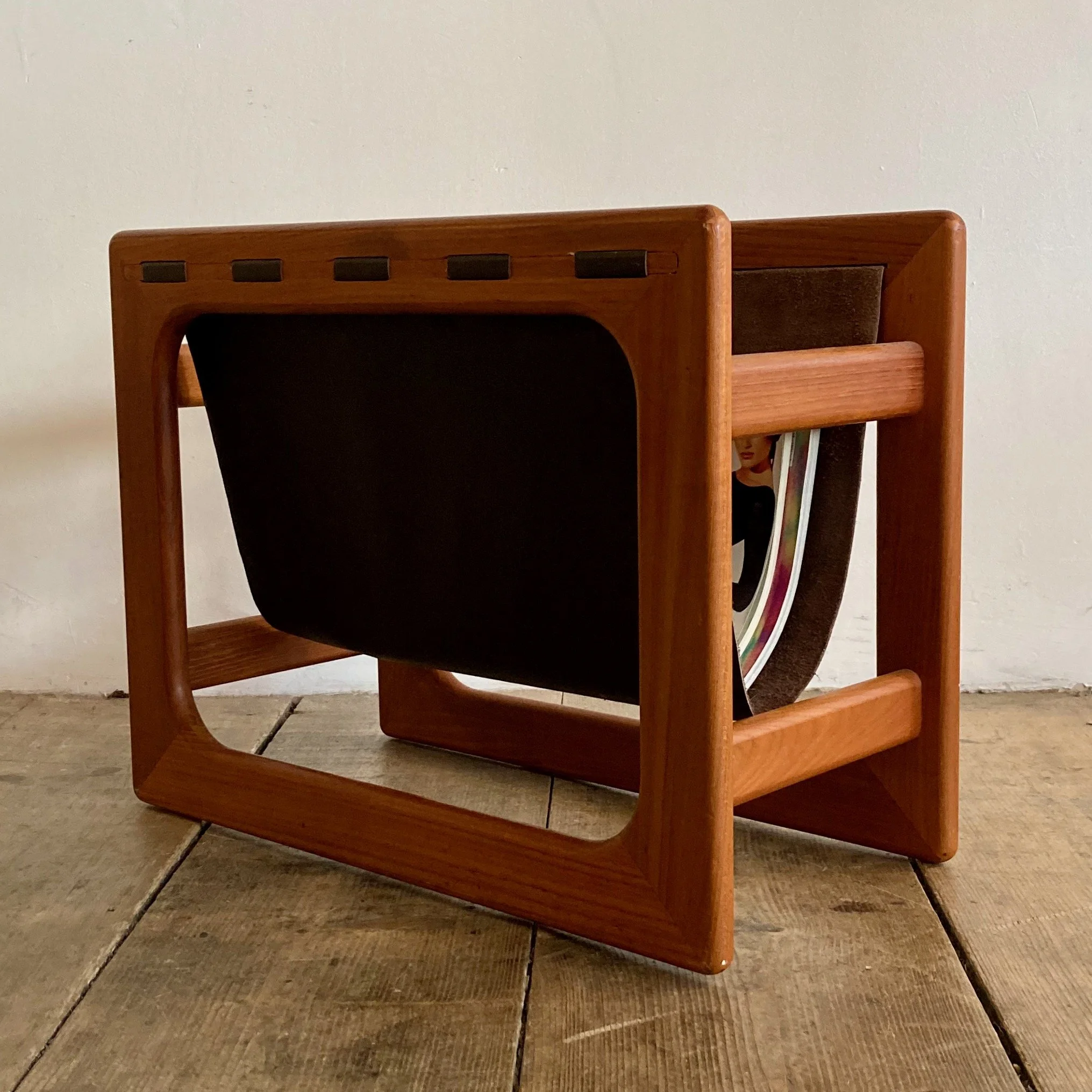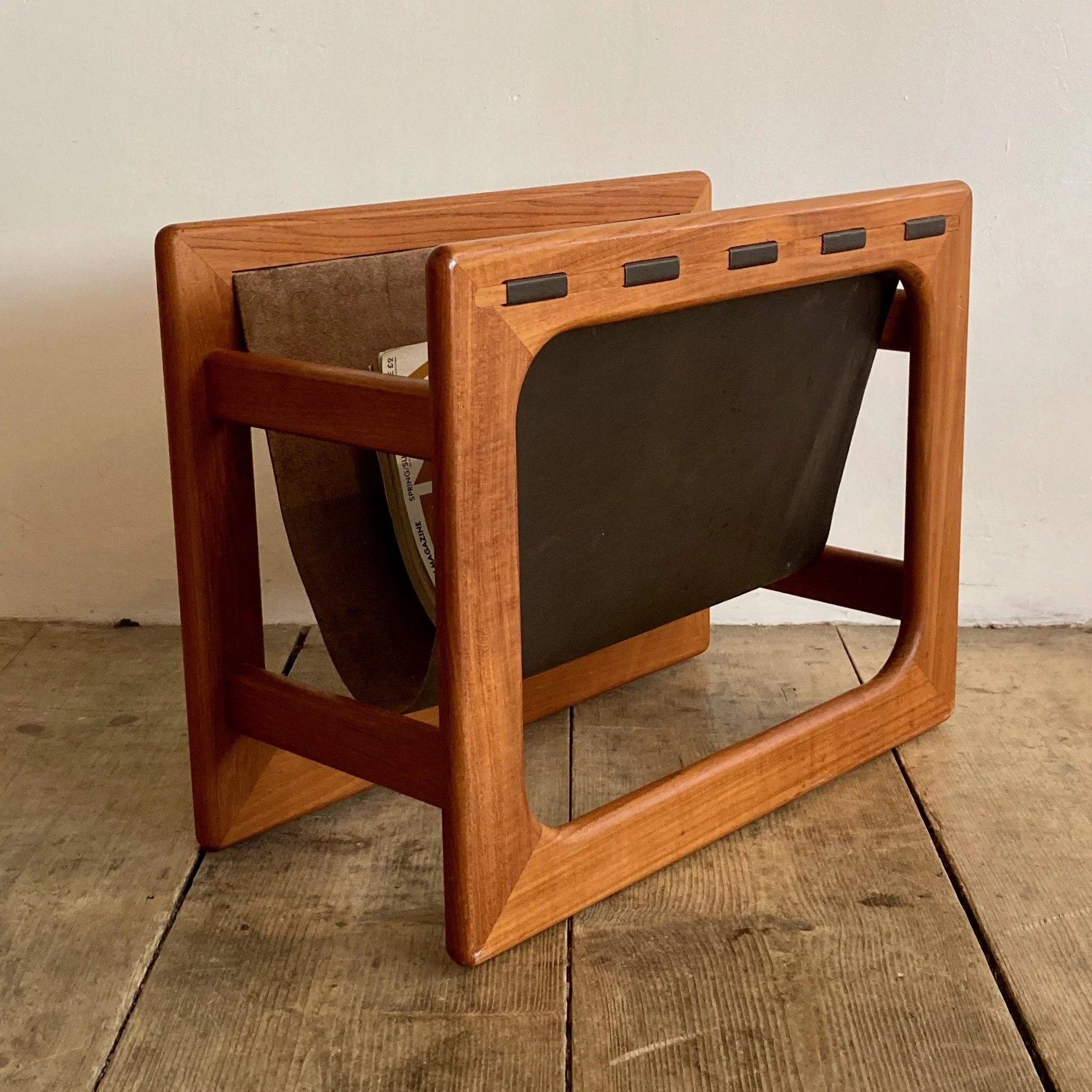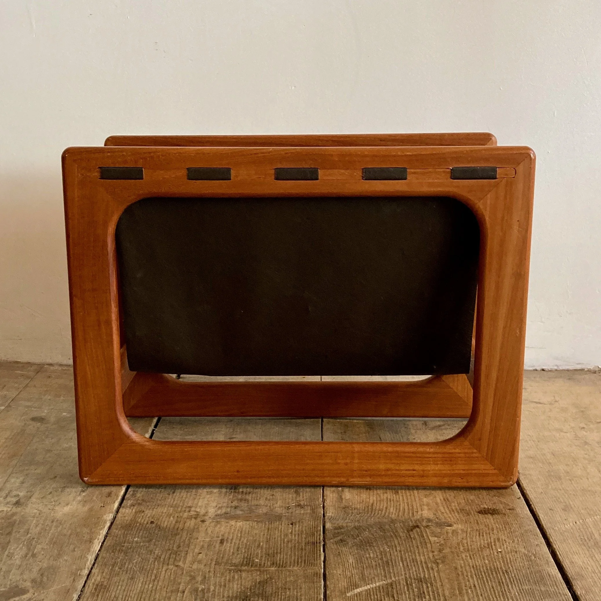 A beautifully crafted 1970s Danish magazine rack, designed by Aksel Kjersgaard for Sain Møbler. Combining clean Scandinavian lines with practical design, this piece features a solid teak frame paired with a sling-style leather holder.