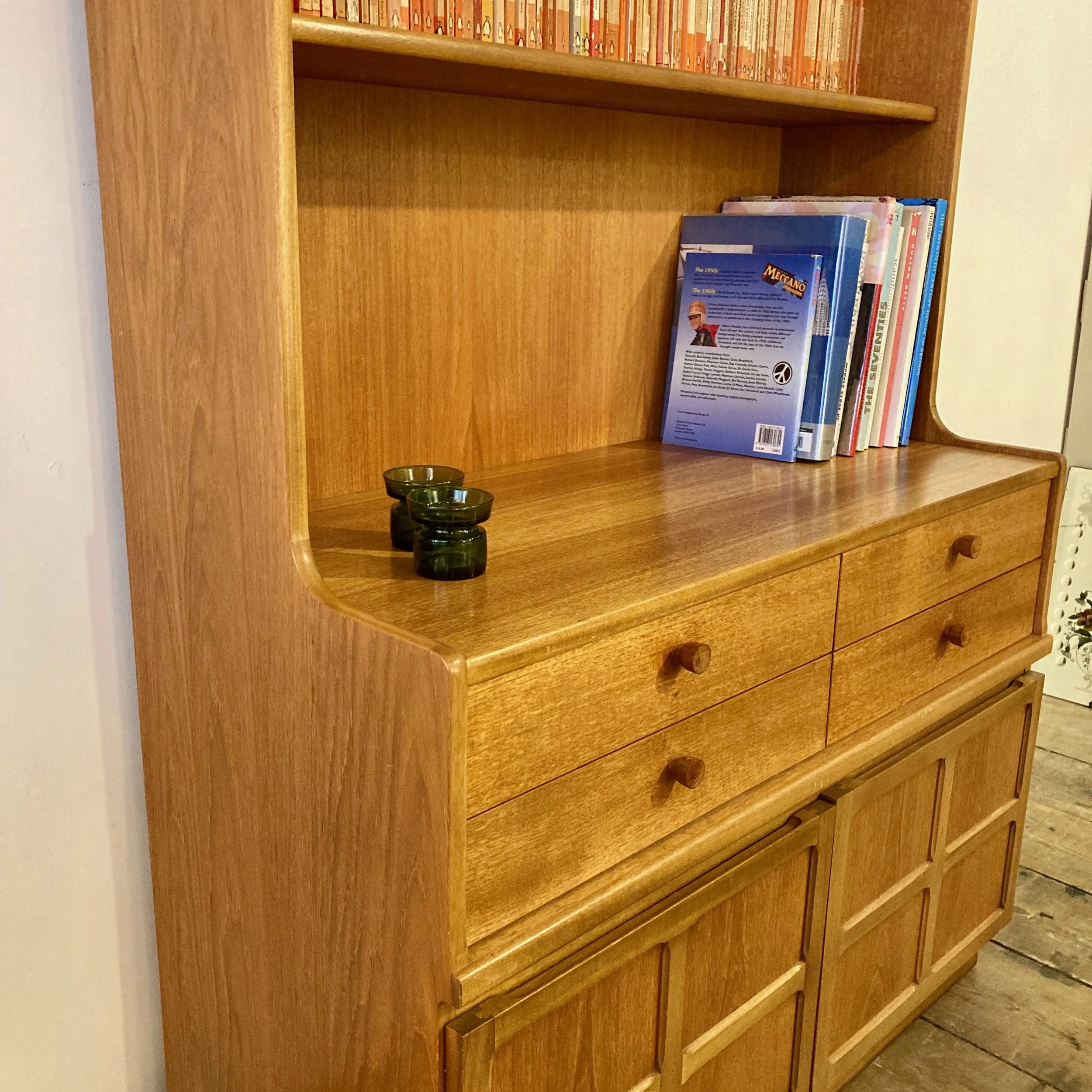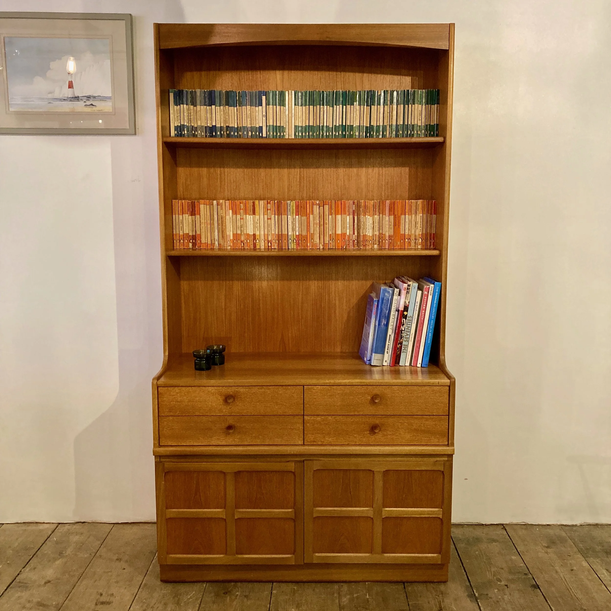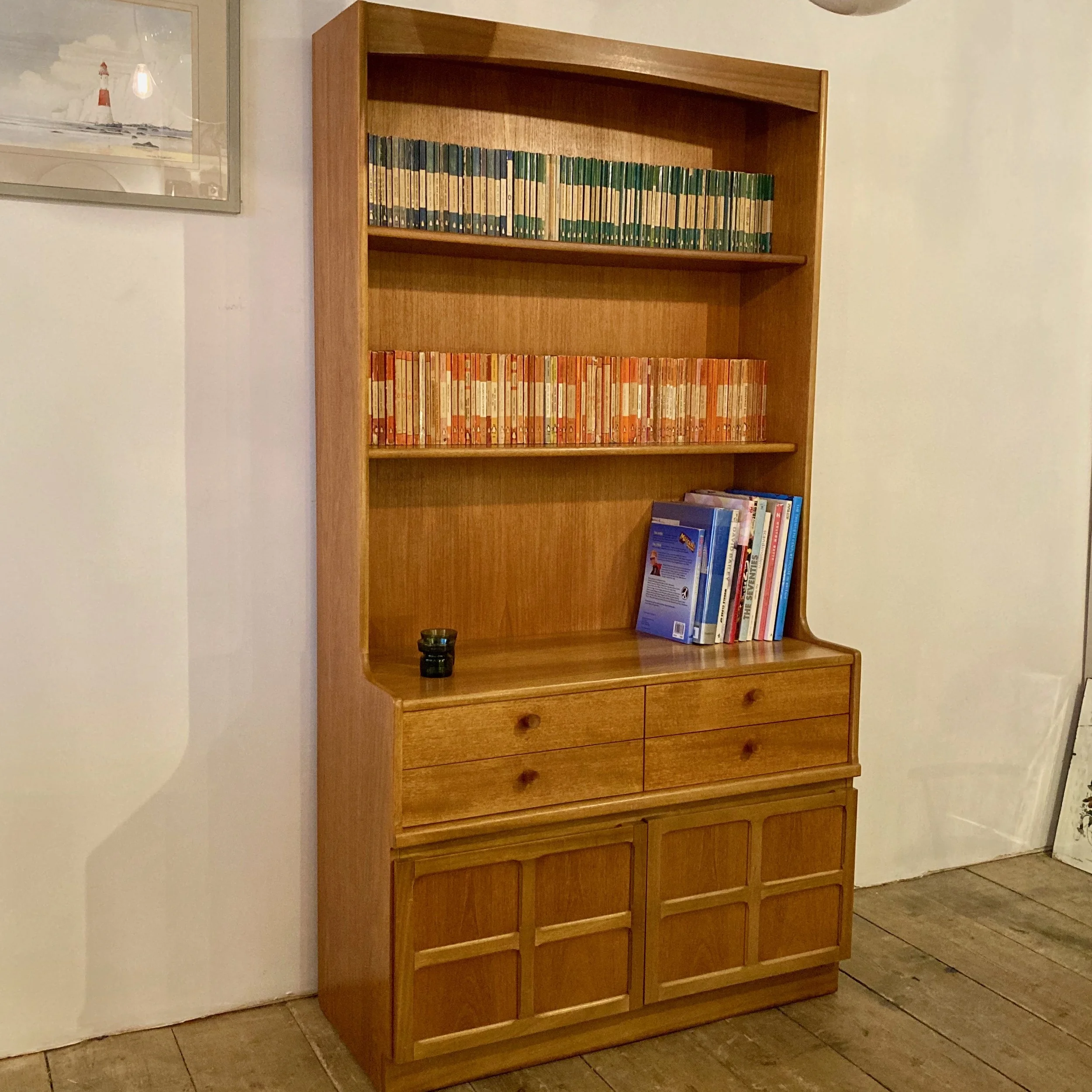 An elegant 1970s teak bookcase and storage cabinet by Nathan, showcasing the brand’s renowned craftsmanship and timeless mid-century design. This versatile piece features open shelving above, four drawers and a lower cupboard, offering generous storage alongside beautifully balanced proportions.