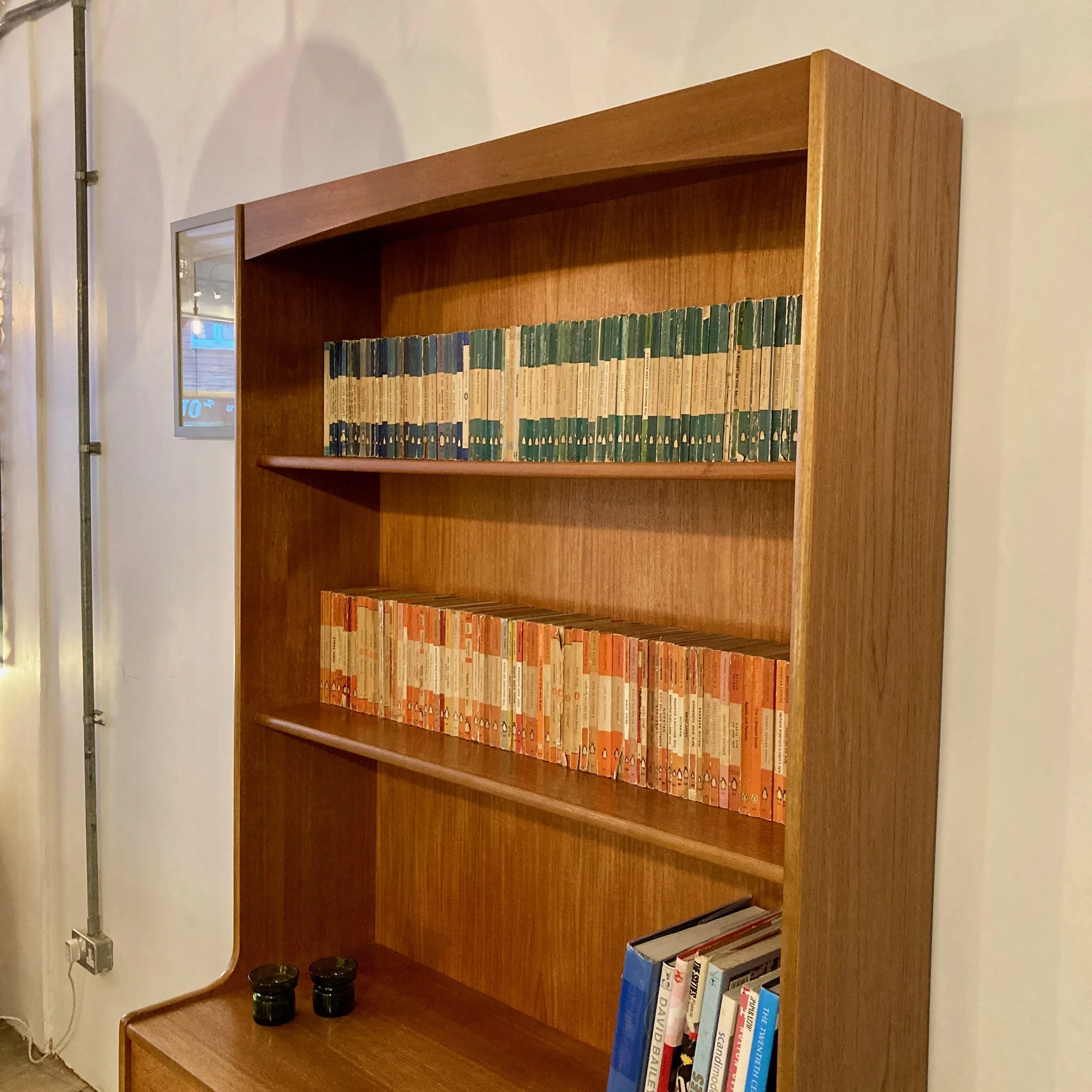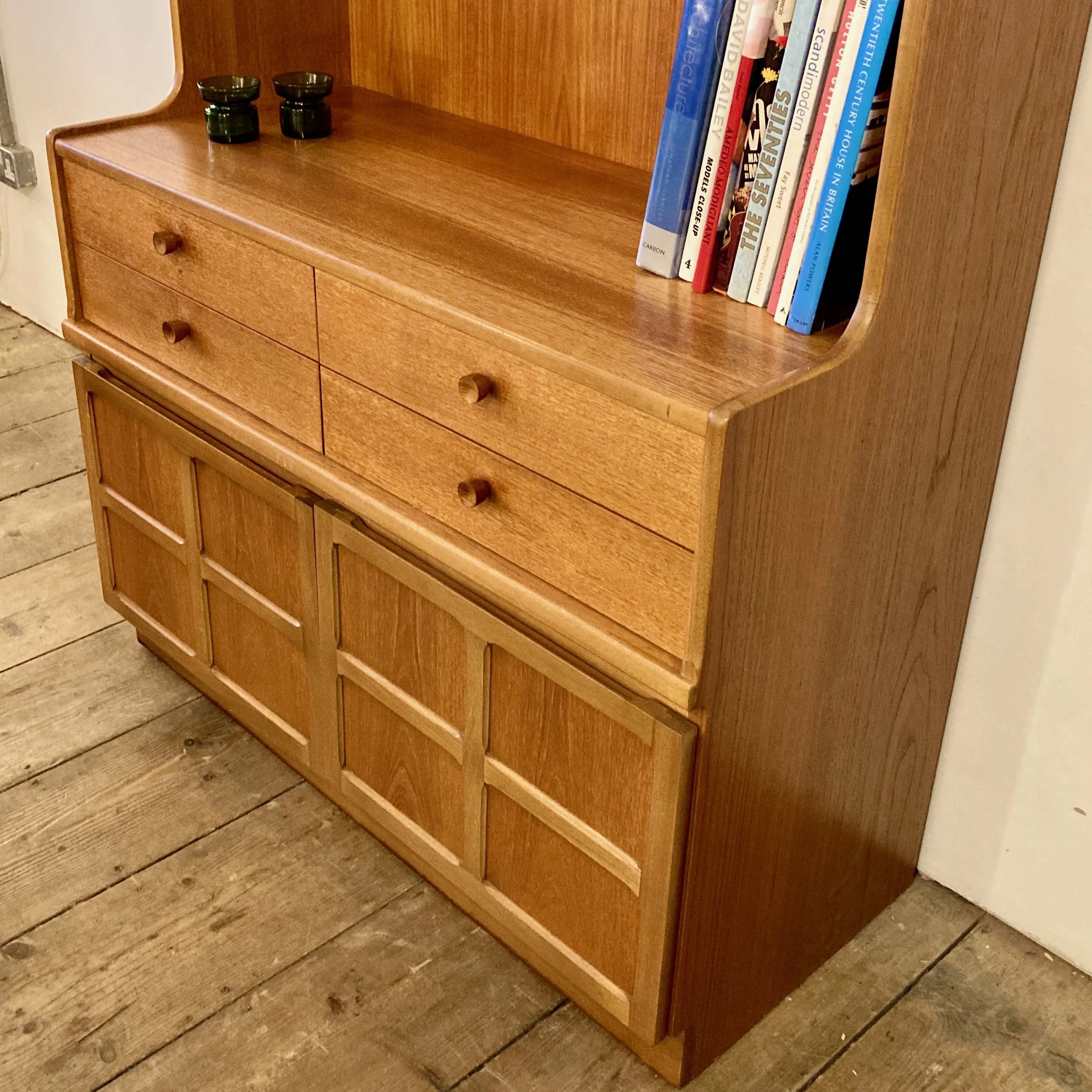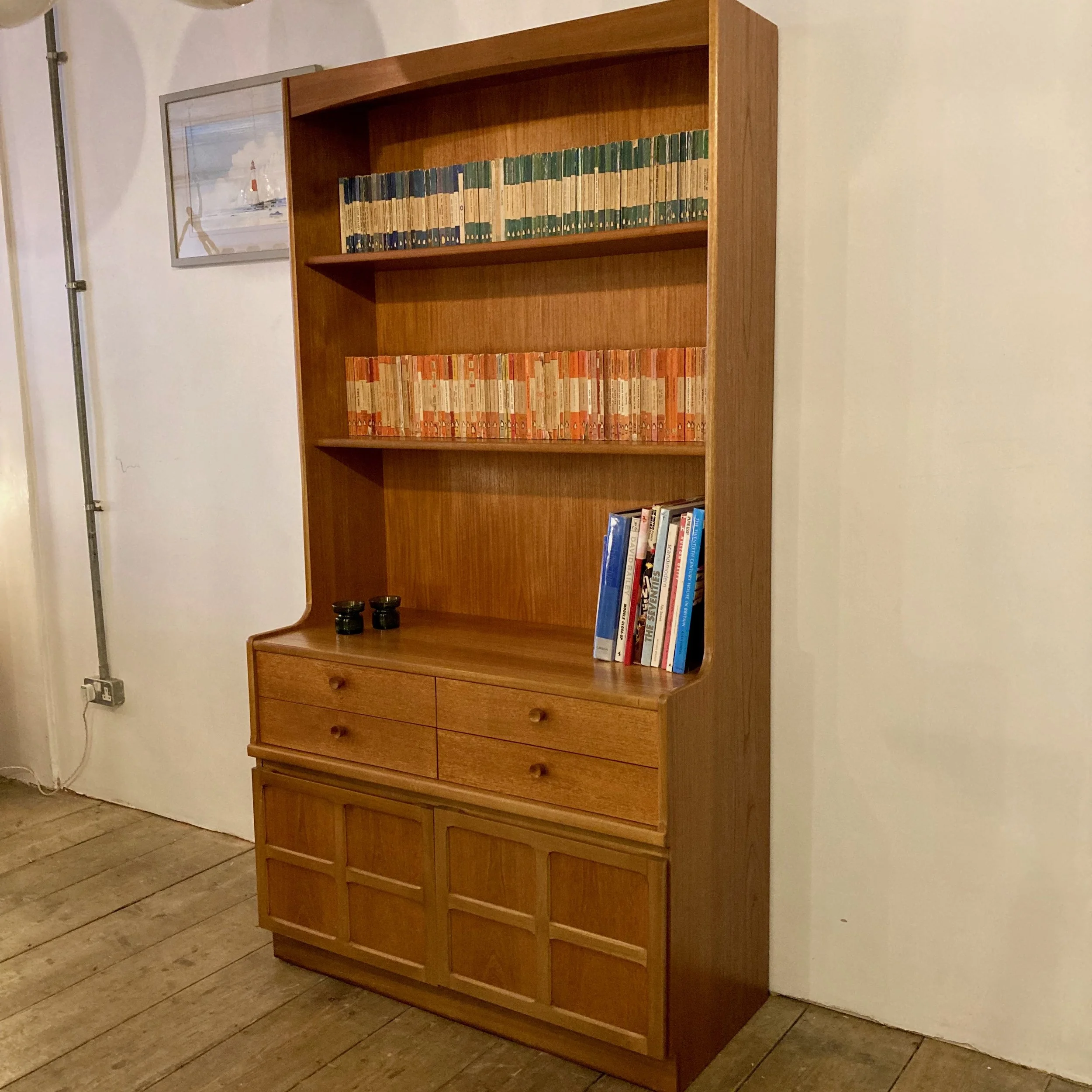 An elegant 1970s teak bookcase and storage cabinet by Nathan, showcasing the brand’s renowned craftsmanship and timeless mid-century design. This versatile piece features open shelving above, four drawers and a lower cupboard, offering generous storage alongside beautifully balanced proportions.
