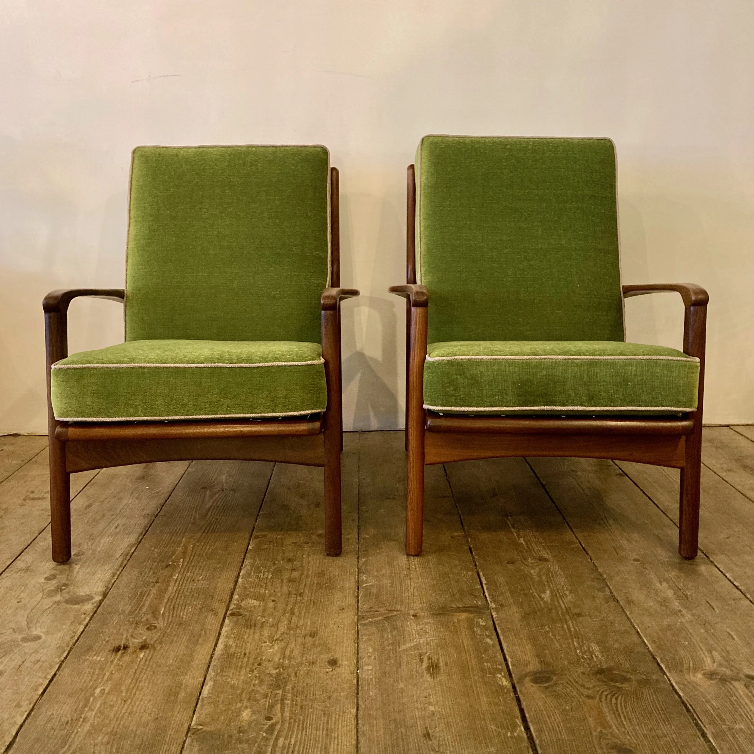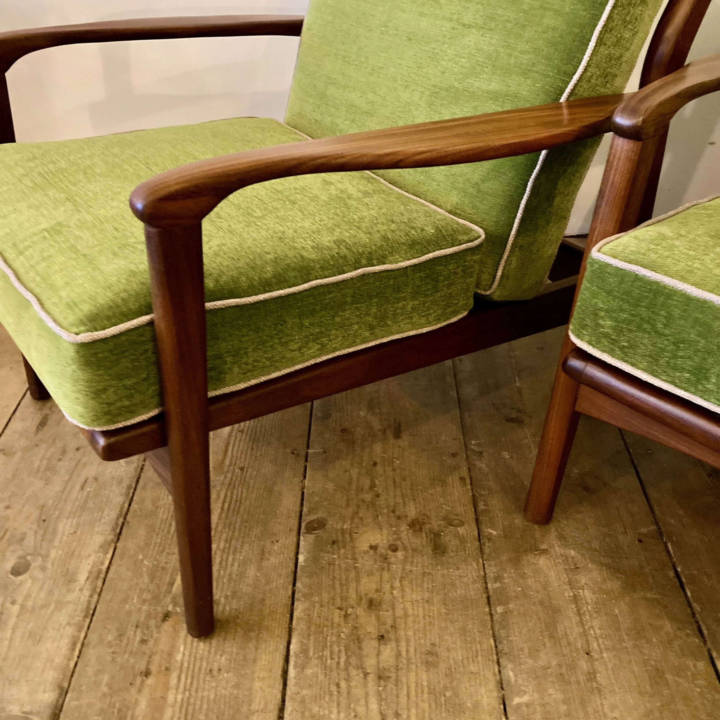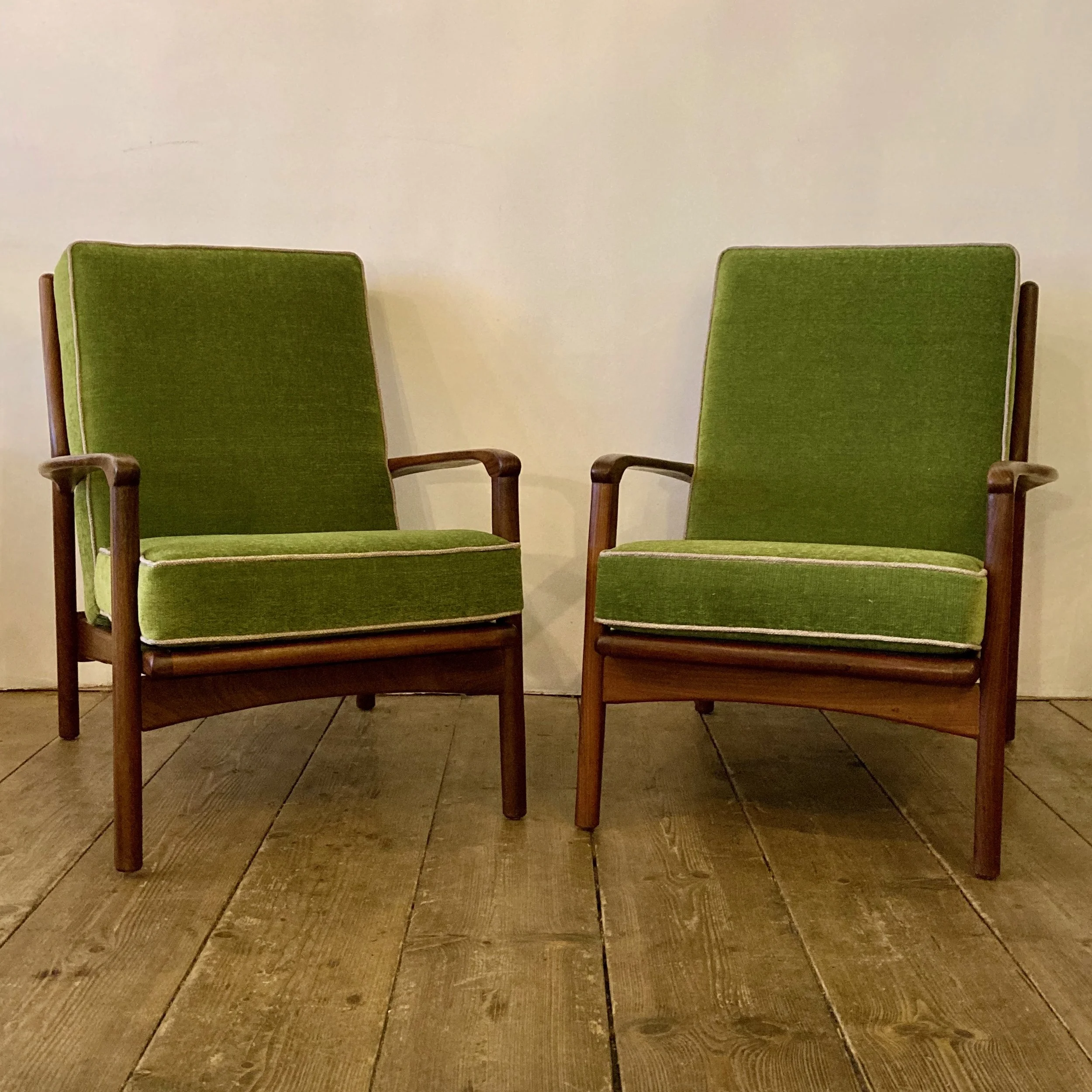 A stunning pair of 1960s teak armchairs by British designer R.W. Toothill, inspired by classic Danish modern styling. These beautifully proportioned chairs feature sculpted teak frames and have been professionally reupholstered in a soft emerald green fabric with cream piping, creating a bold yet elegant mid-century look.