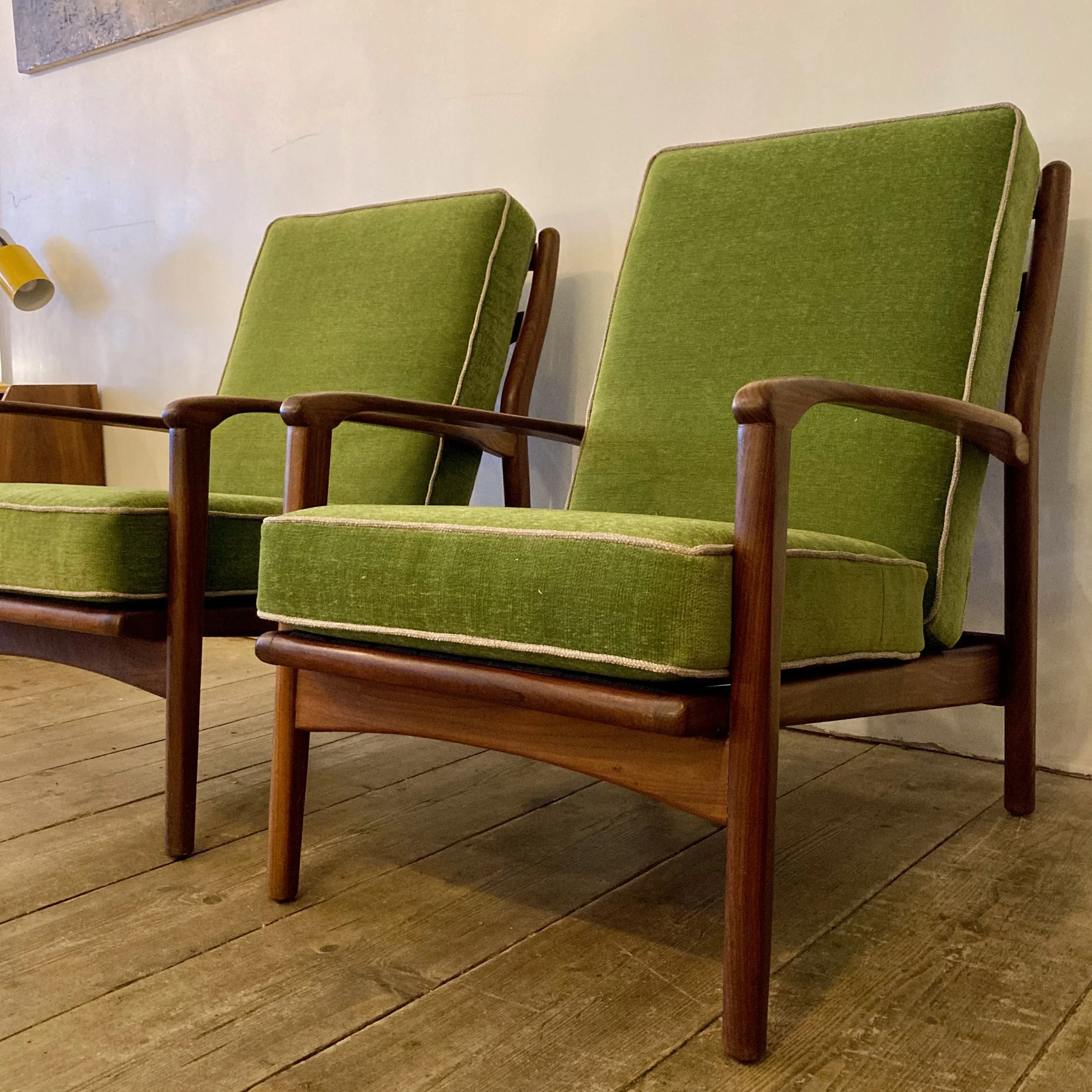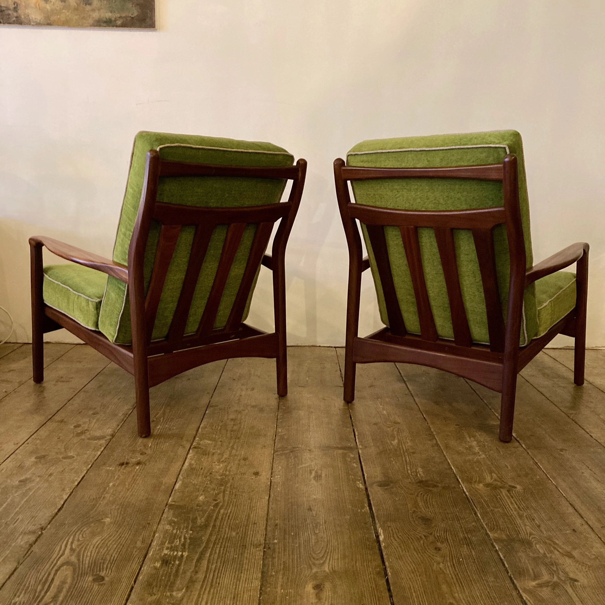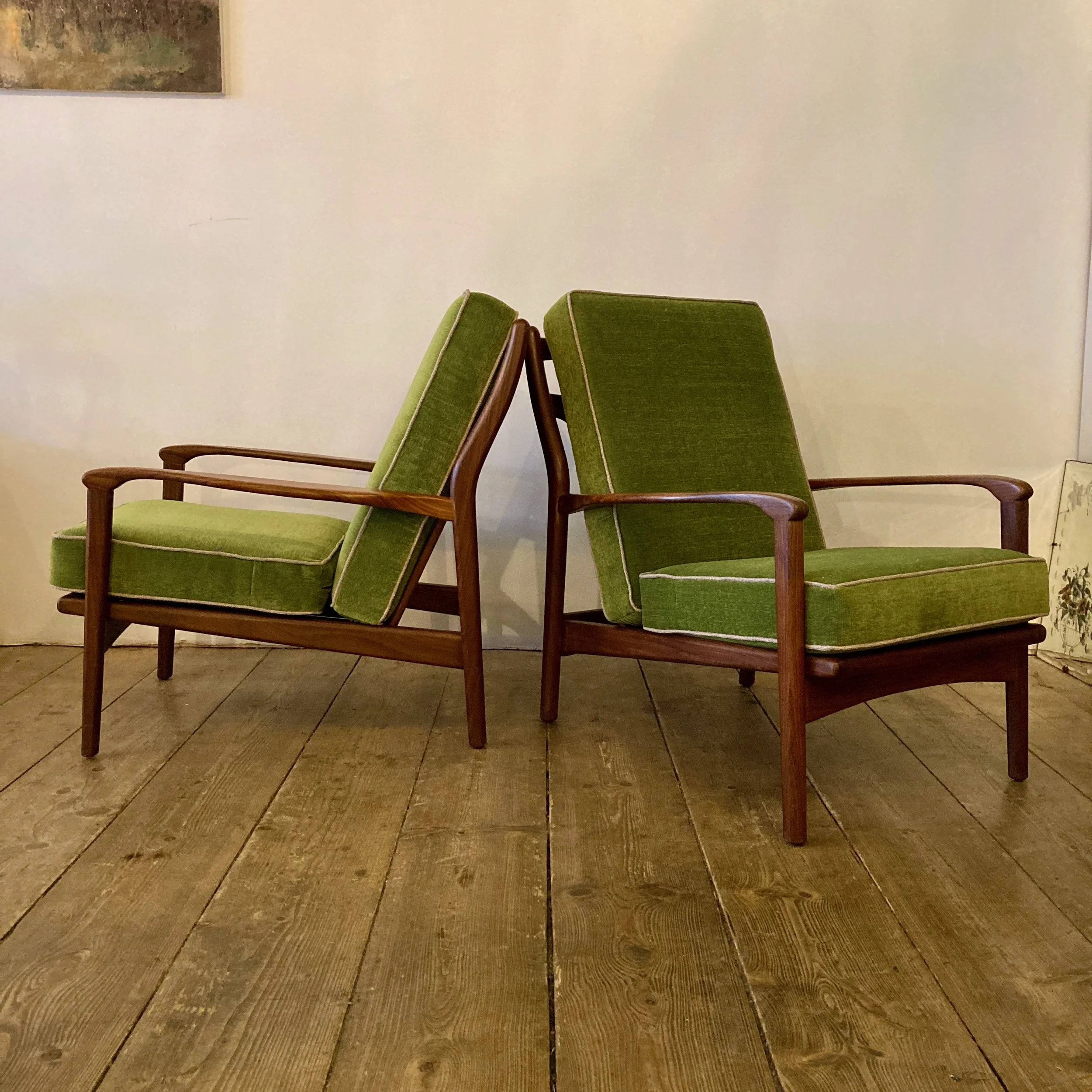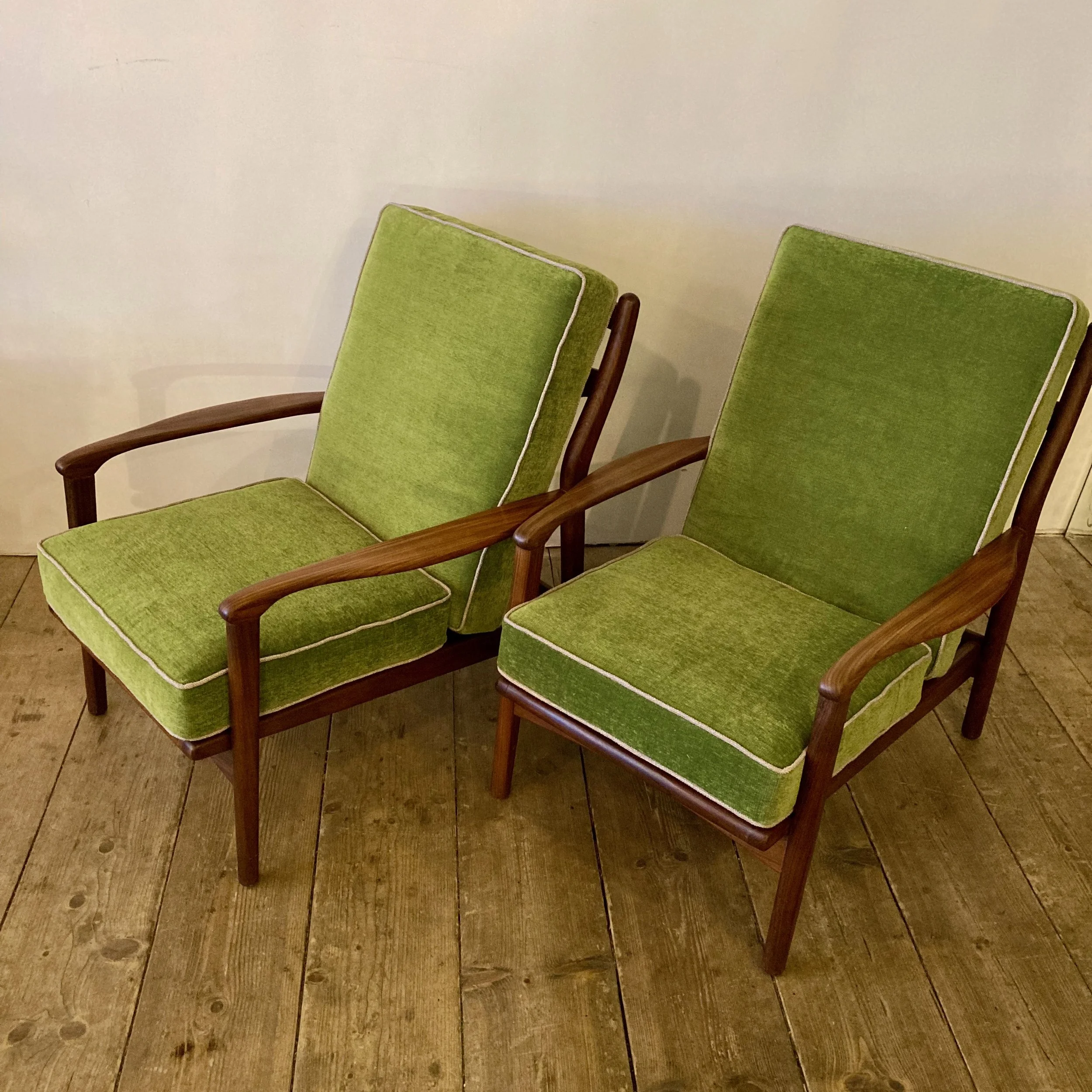 A stunning pair of 1960s teak armchairs by British designer R.W. Toothill, inspired by classic Danish modern styling. These beautifully proportioned chairs feature sculpted teak frames and have been professionally reupholstered in a soft emerald green fabric with cream piping, creating a bold yet elegant mid-century look.