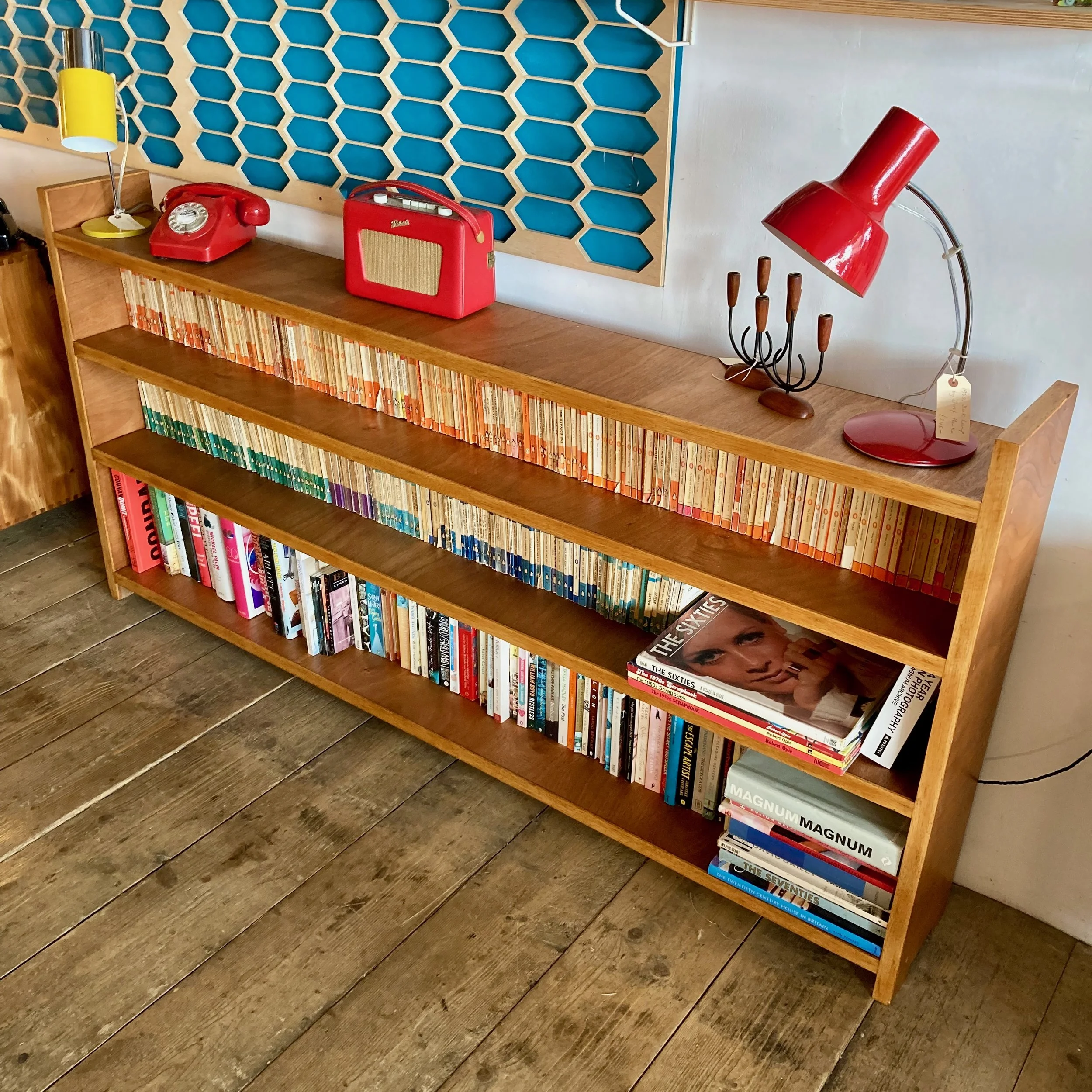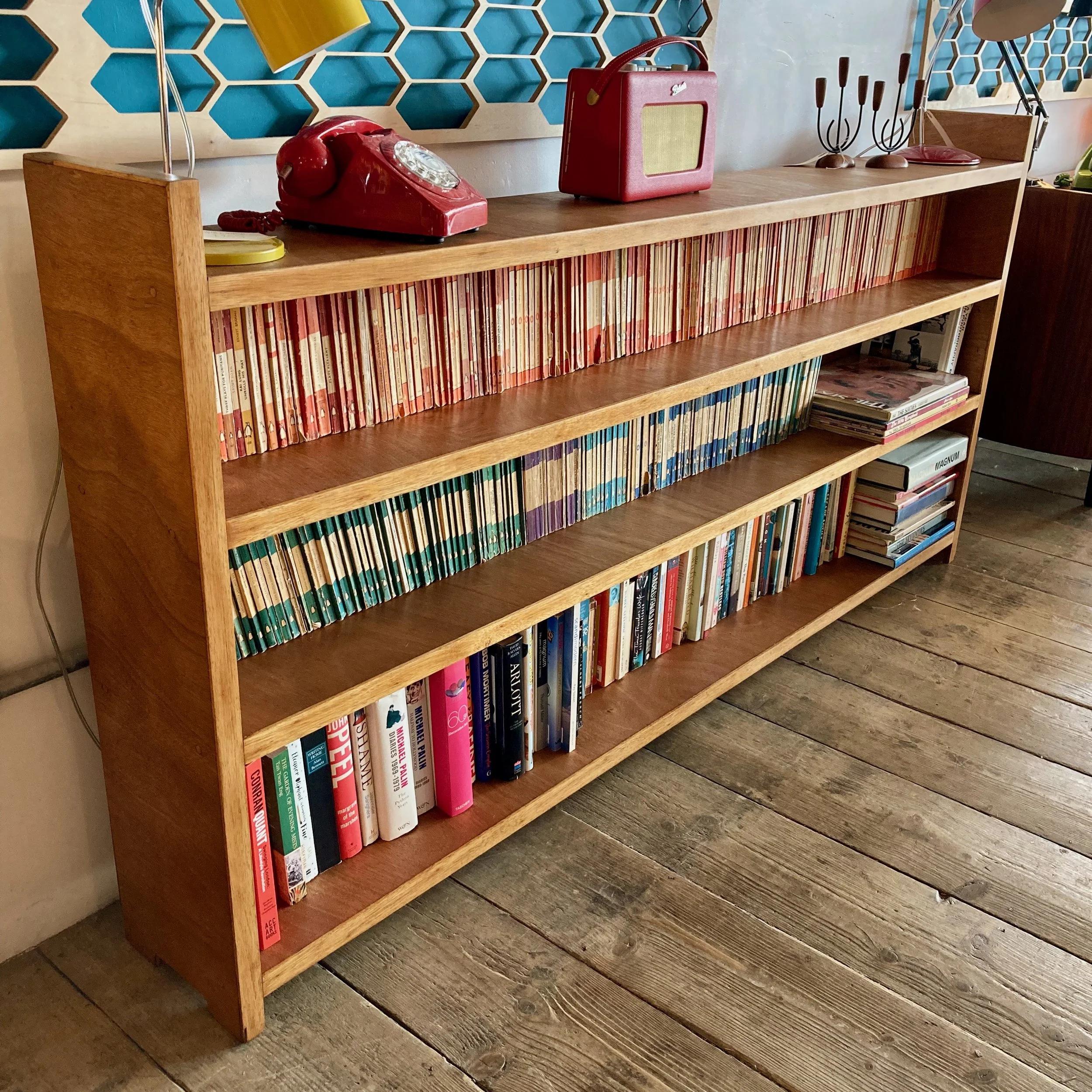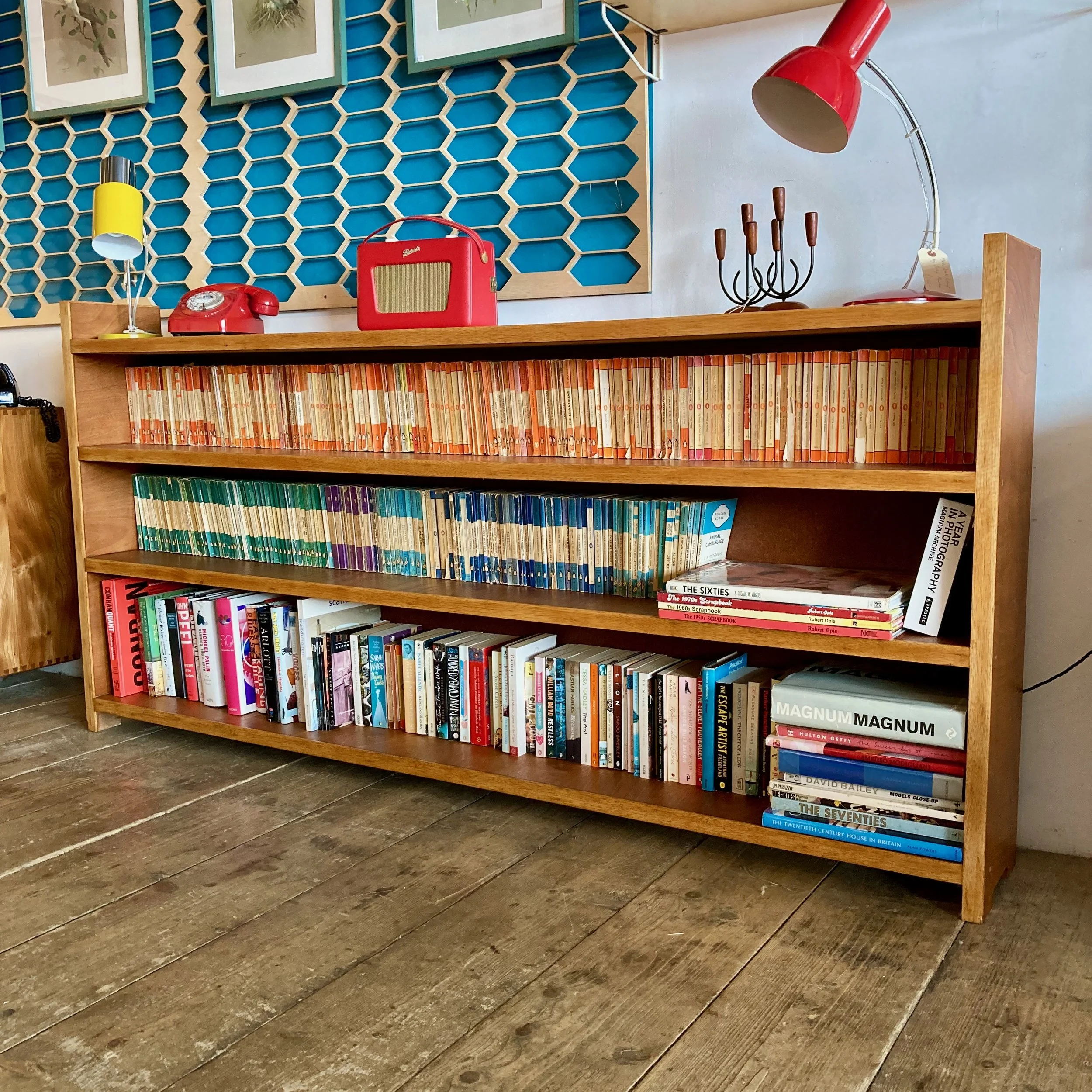 A beautifully restored vintage wooden bookcase, offering generous length and timeless character. Featuring three long, sturdy shelves, it provides ample space for books, display pieces, or storage while maintaining a clean, classic profile.