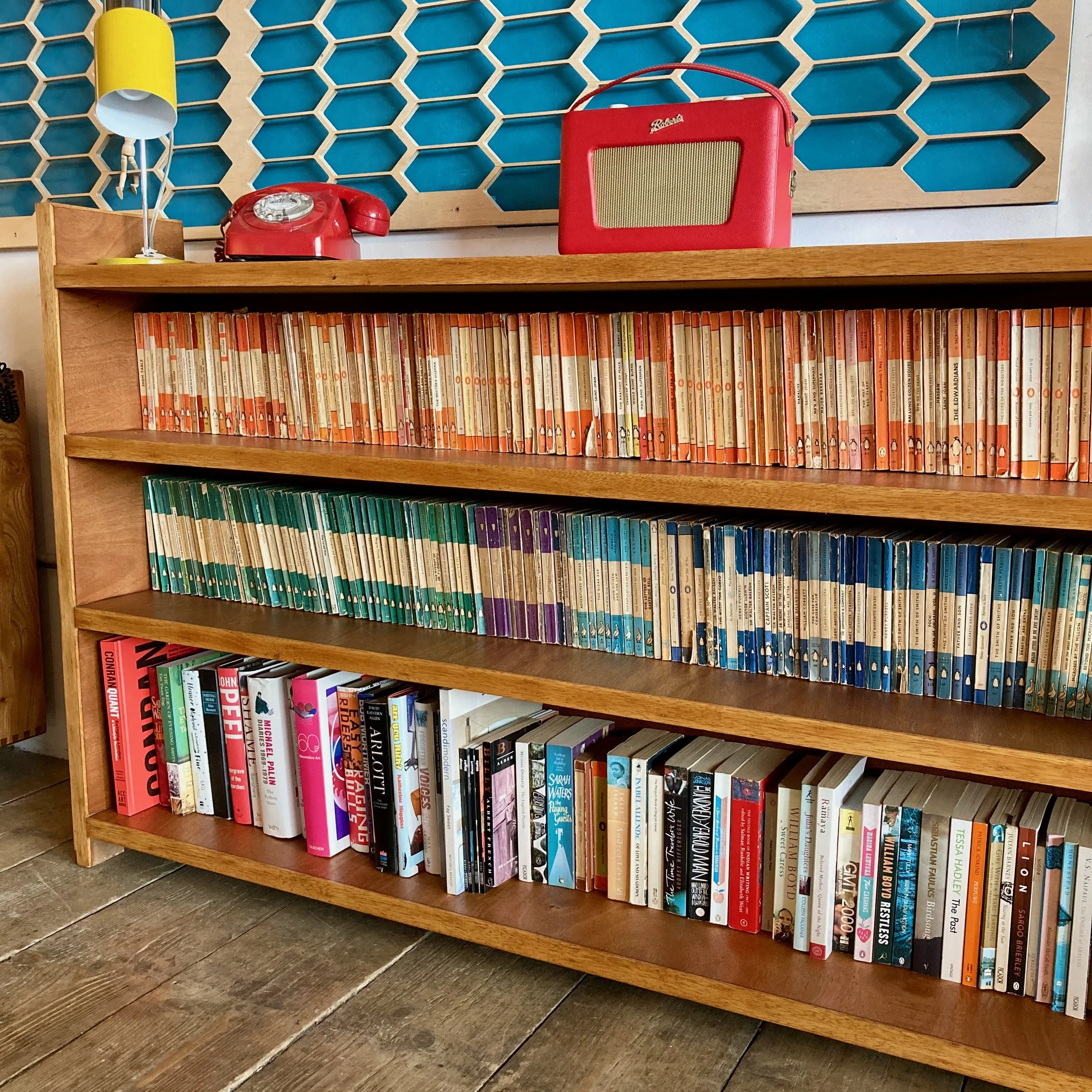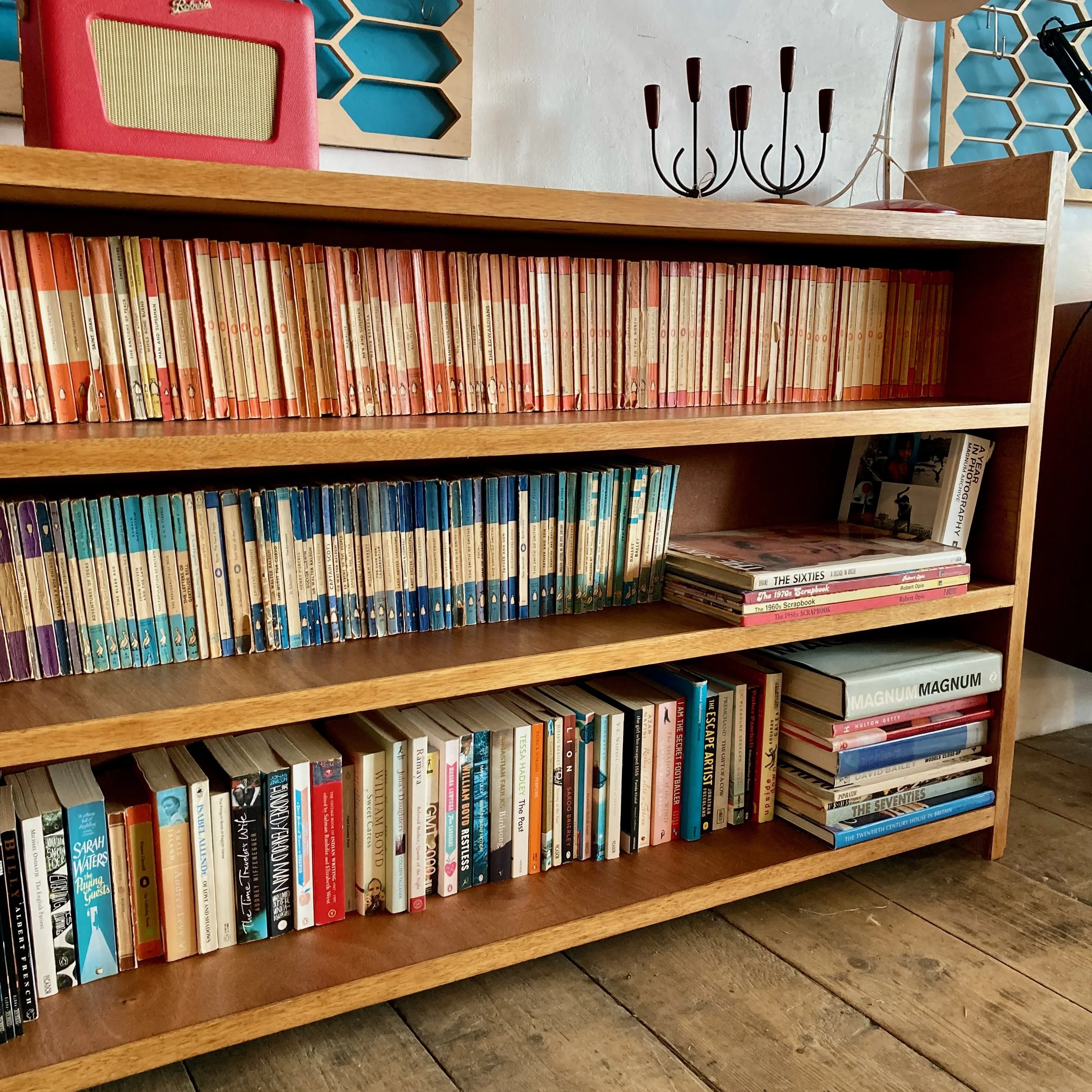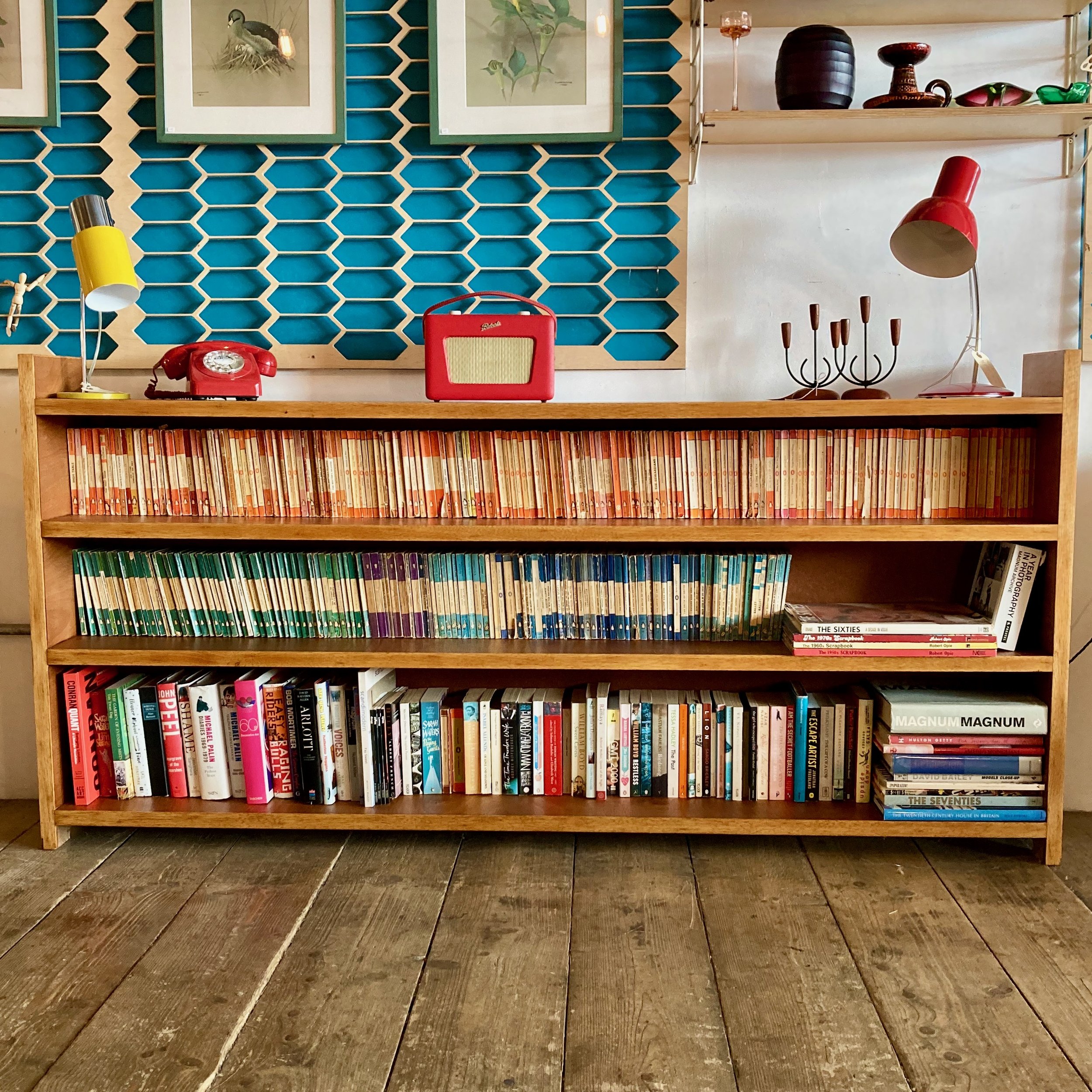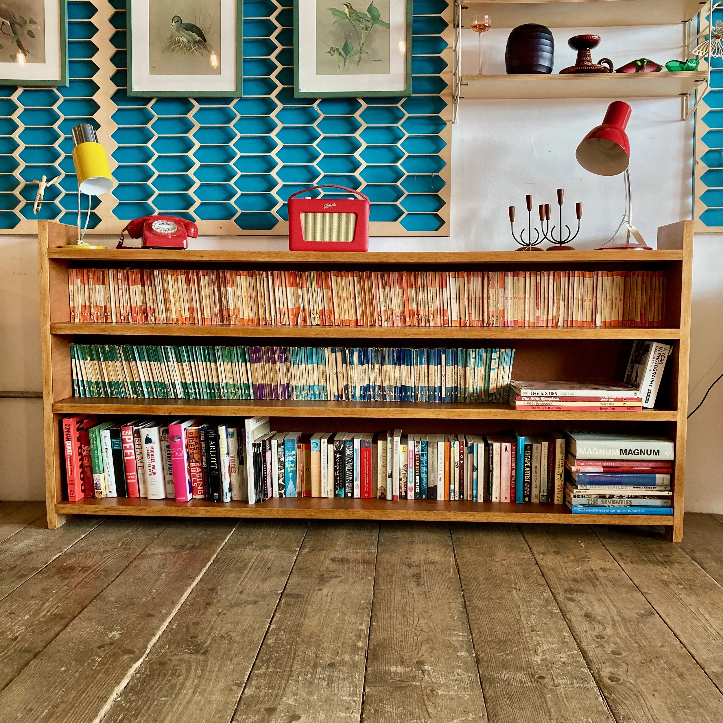 A beautifully restored vintage wooden bookcase, offering generous length and timeless character. Featuring three long, sturdy shelves, it provides ample space for books, display pieces, or storage while maintaining a clean, classic profile.