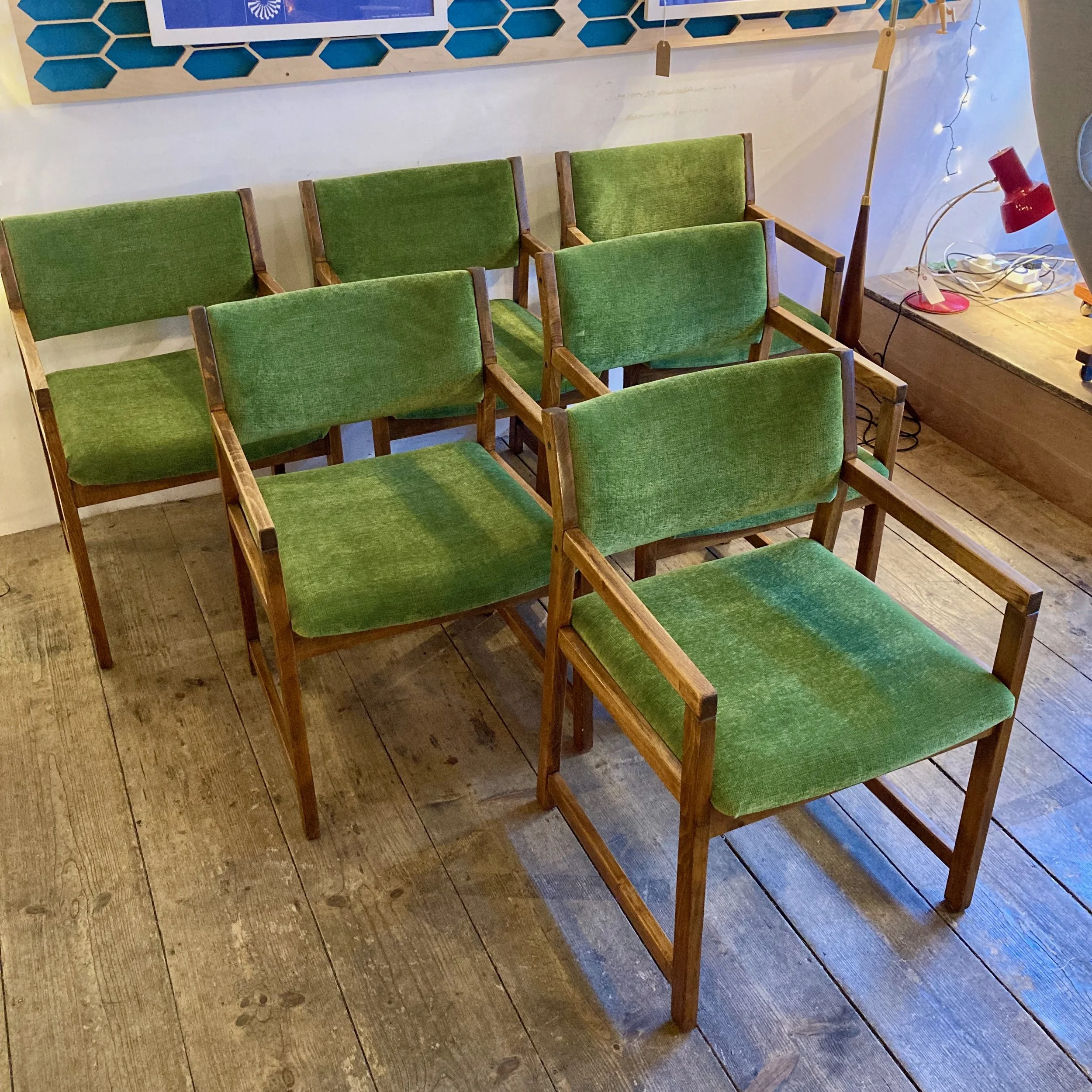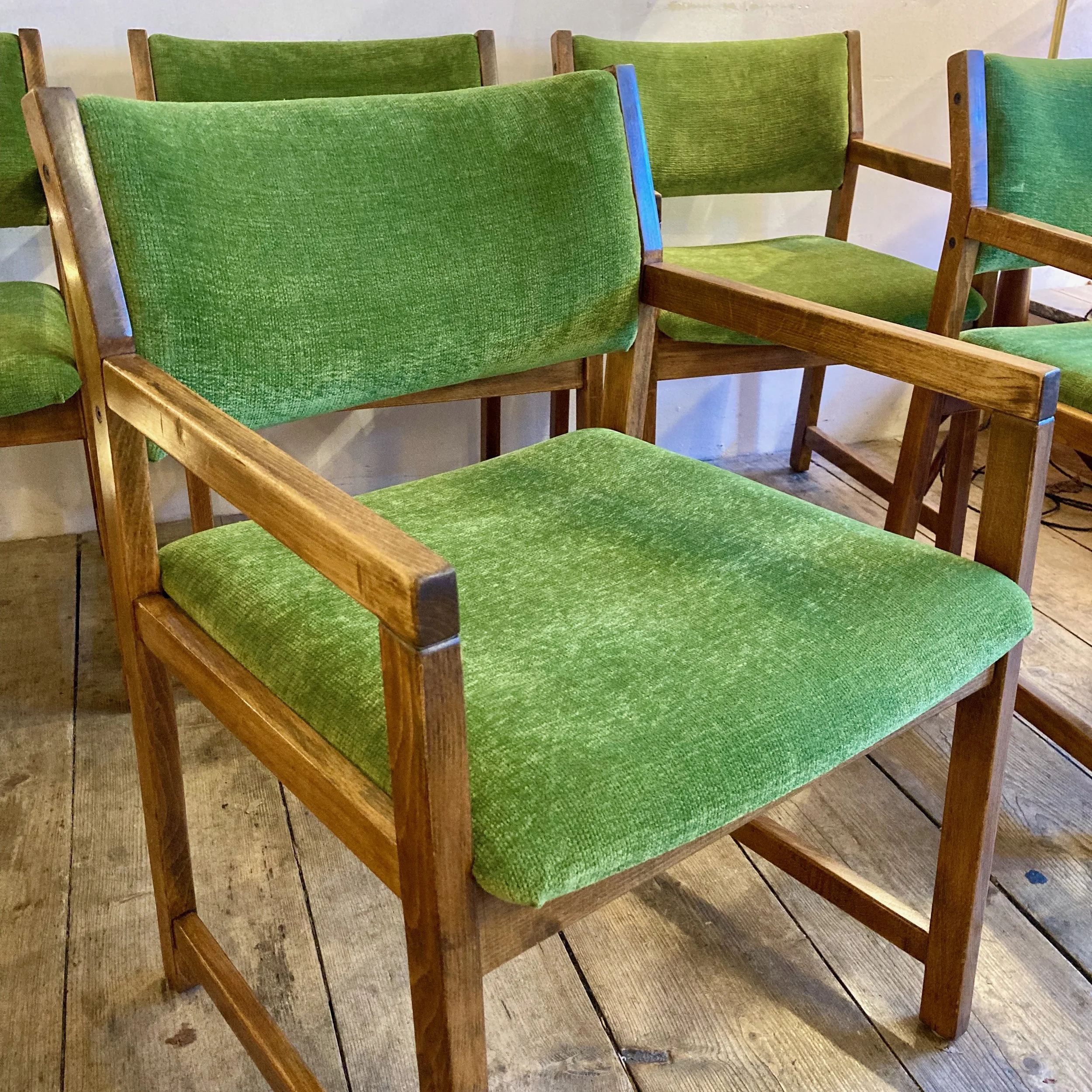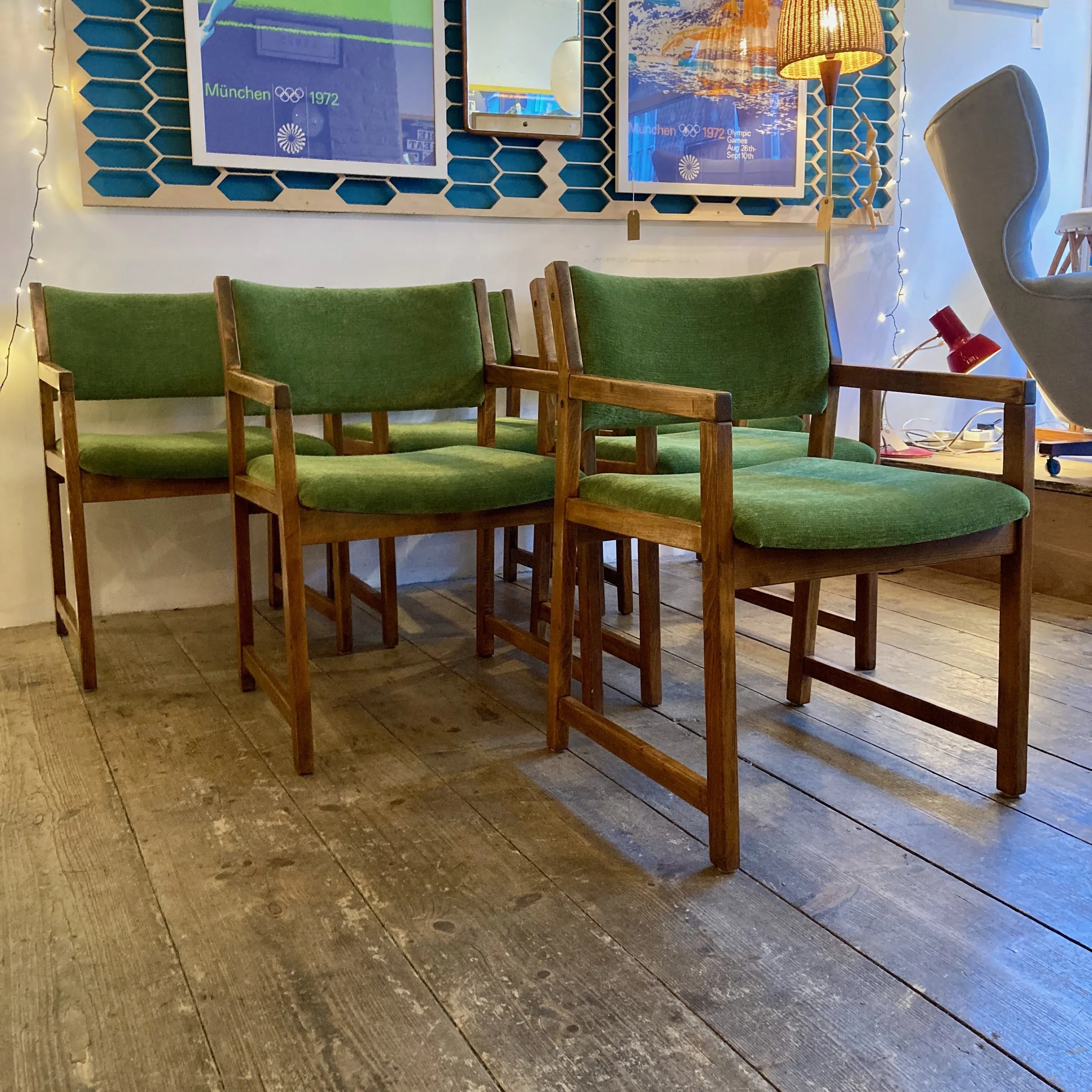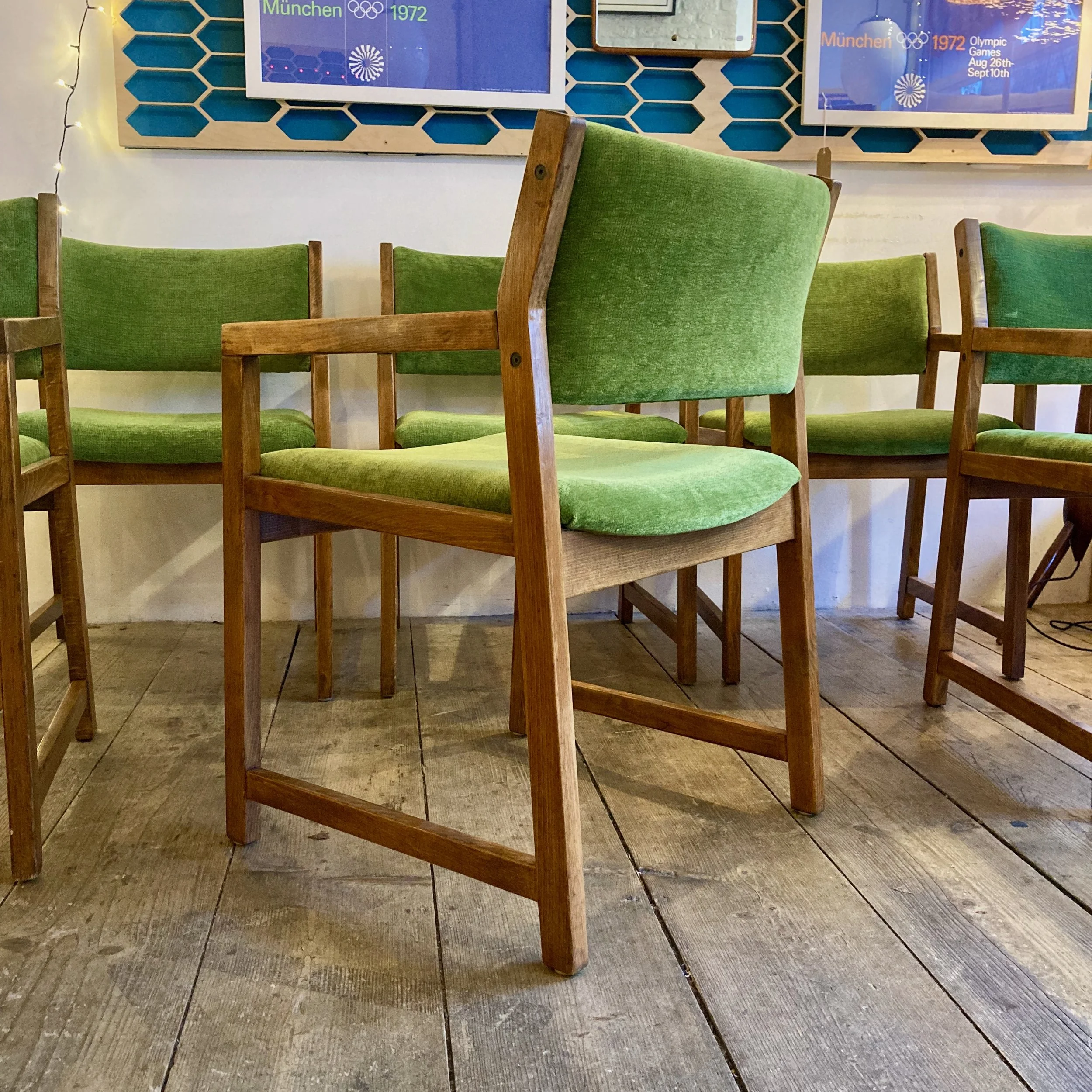 Set of six 1960s Danish vintage dining chairs designed by Kurt Olsen for Møbelværk. These classic mid-century Scandinavian elbow chairs feature beautifully shaped restored beech wood frames and have been professionally re-upholstered in a soft emerald green fabric, enhancing their clean Danish modern lines. Ideal as vintage dining chairs or statement seating for a mid-century interior.