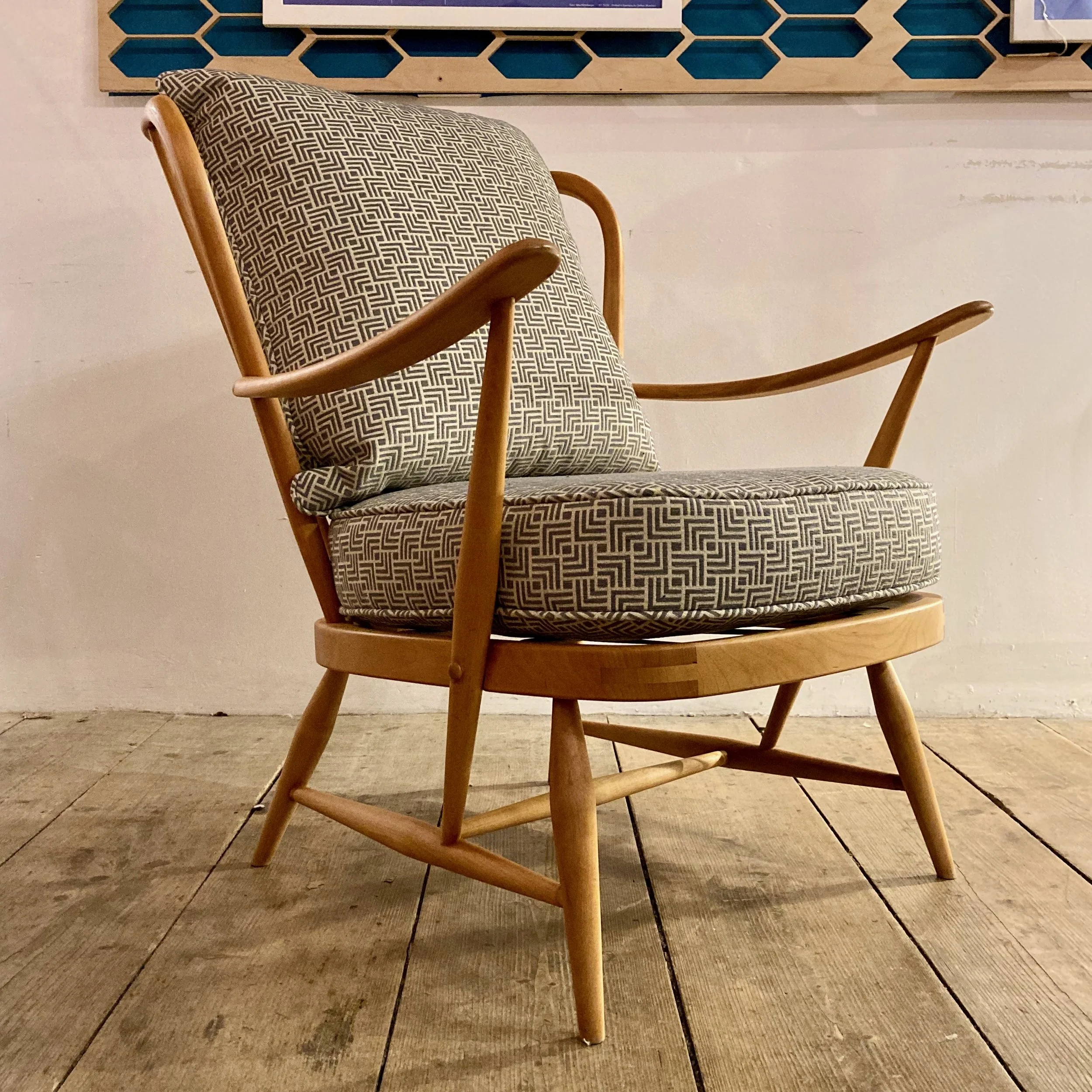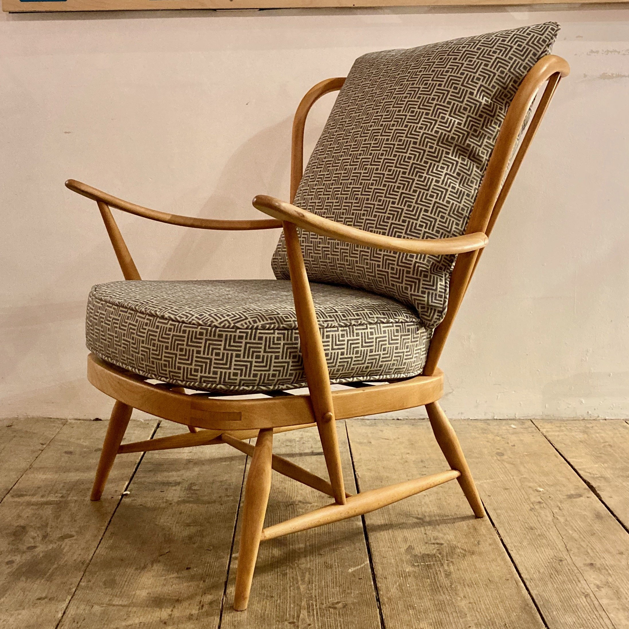 A beautifully refurbished 1970s Ercol Windsor Model 477 easy armchair, featuring a solid beech wood frame and newly reupholstered in a soft, patterned fabric. This classic piece of British mid-century furniture offers both comfort and timeless design, making it ideal for a living room, reading corner, or vintage-inspired interior.