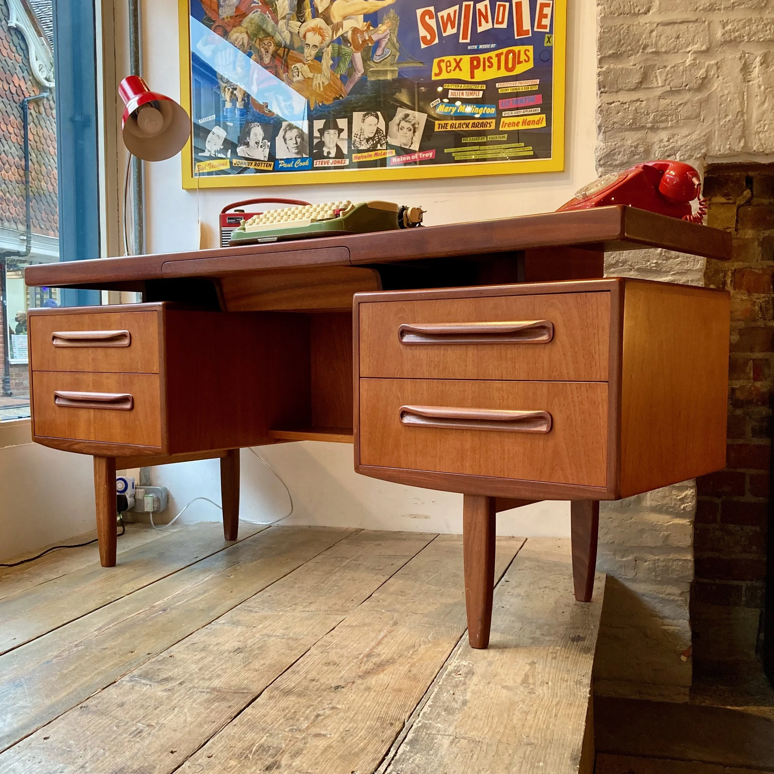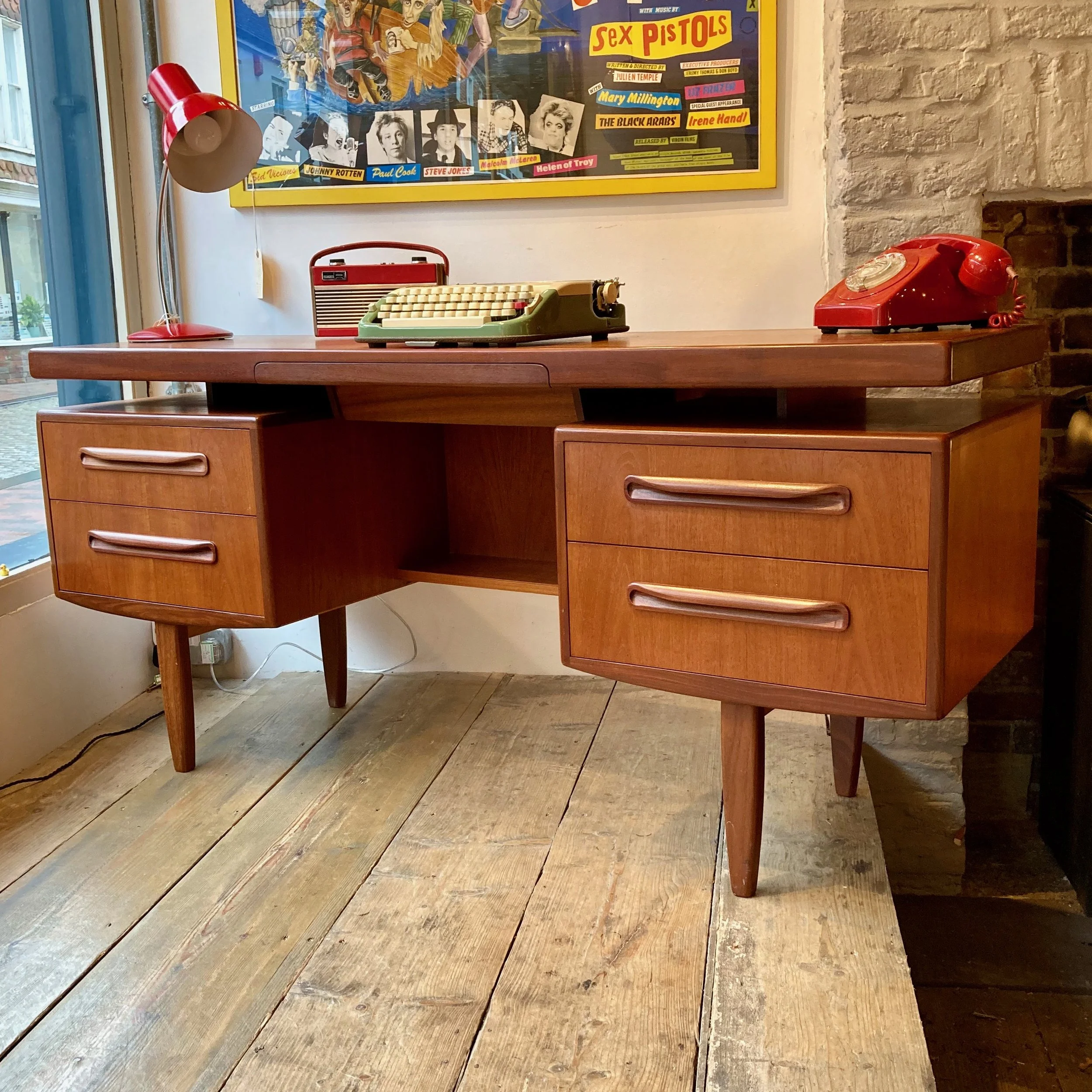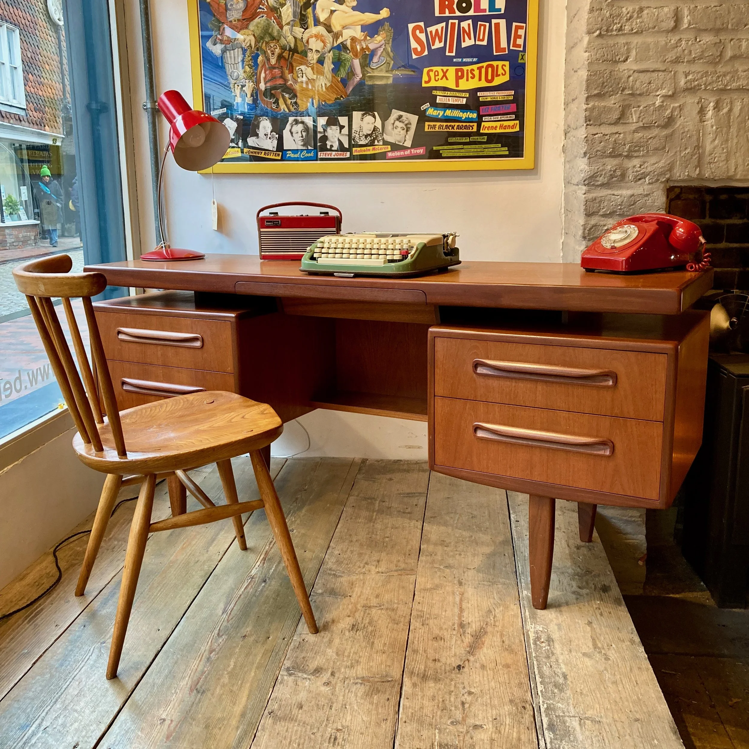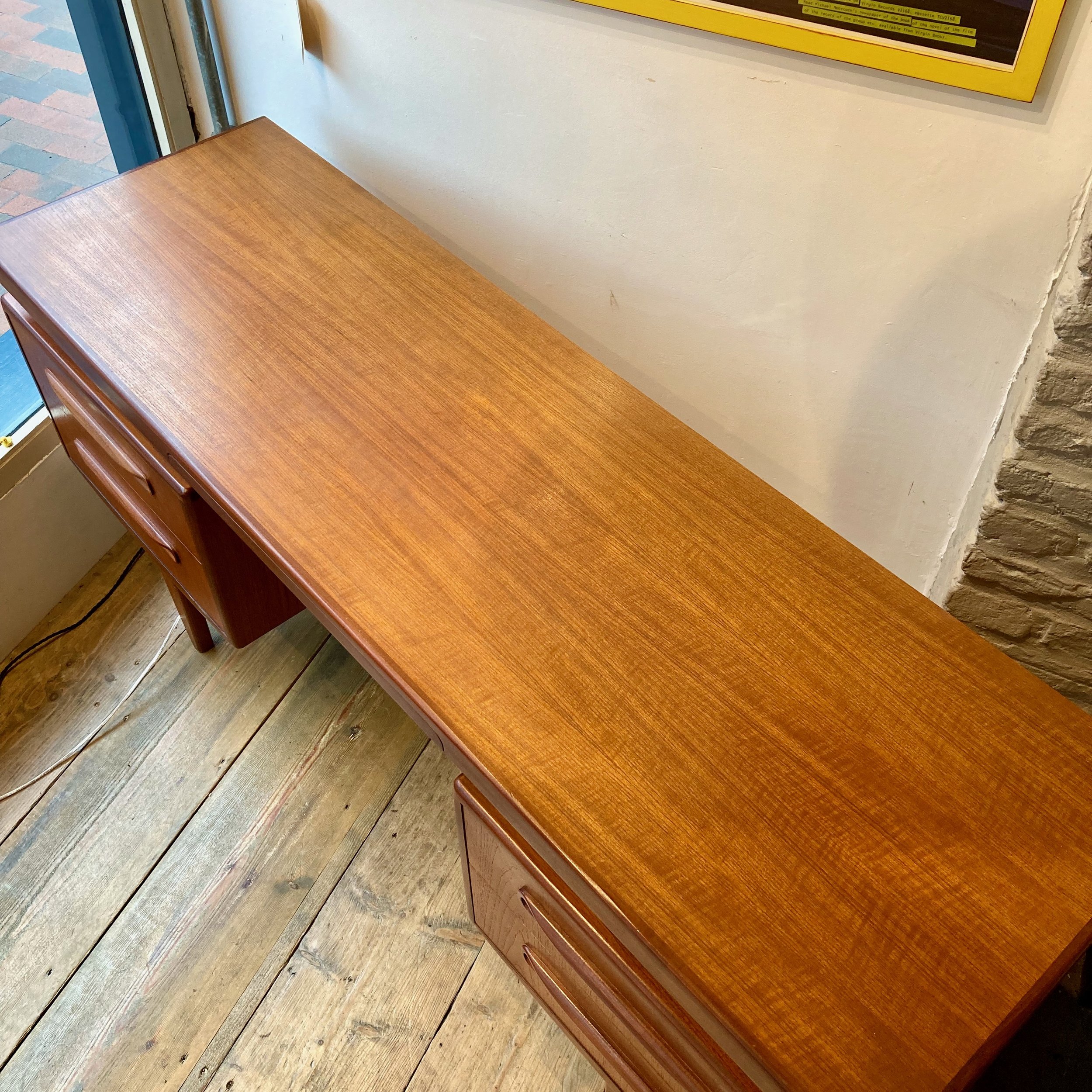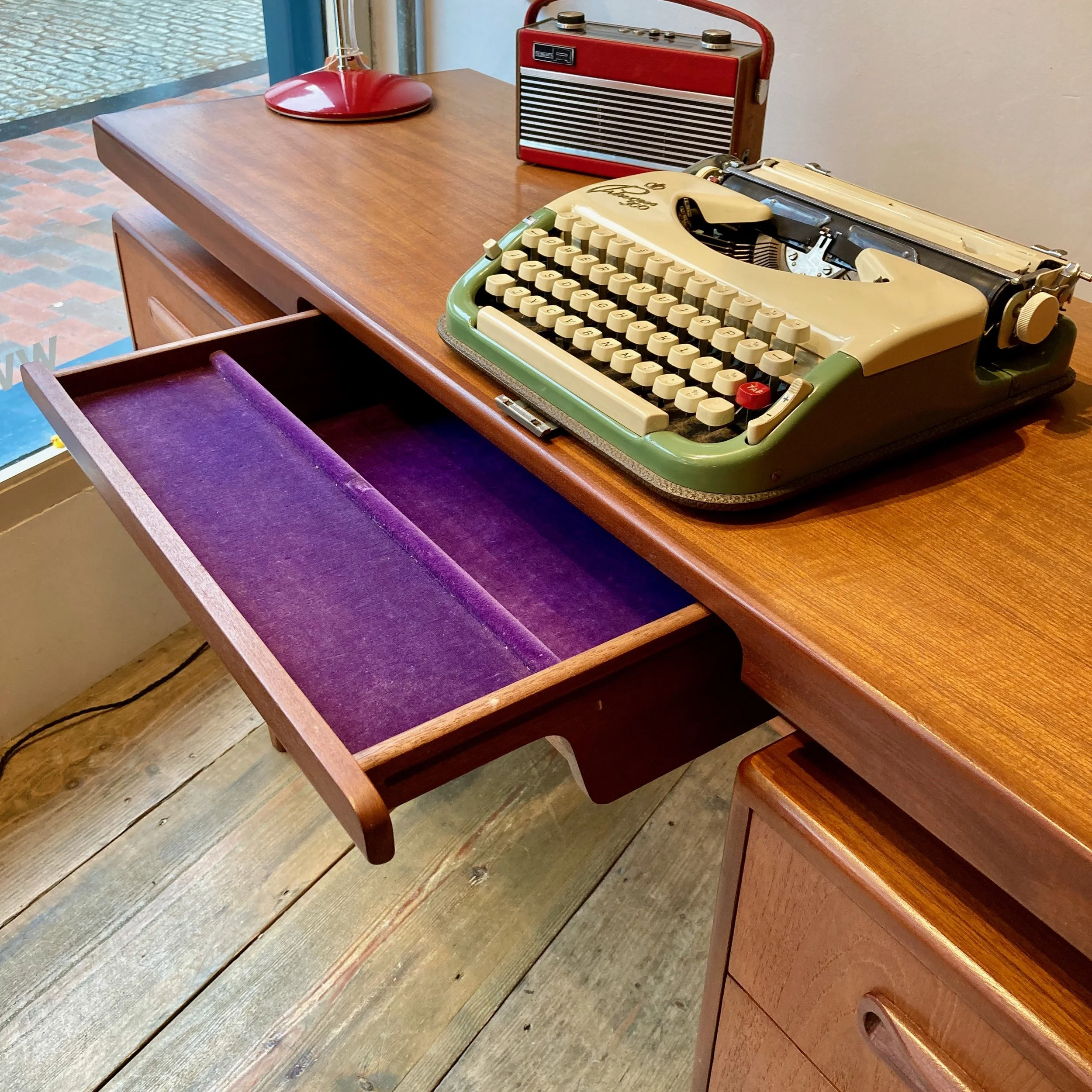 The design features drawers to both sides for generous storage, along with a discreet central “secret” drawer, beautifully velvet-lined—a distinctive and sought-after G Plan detail. The floating form and clean lines make it ideal for a home office, bedroom, or mid-century interior.