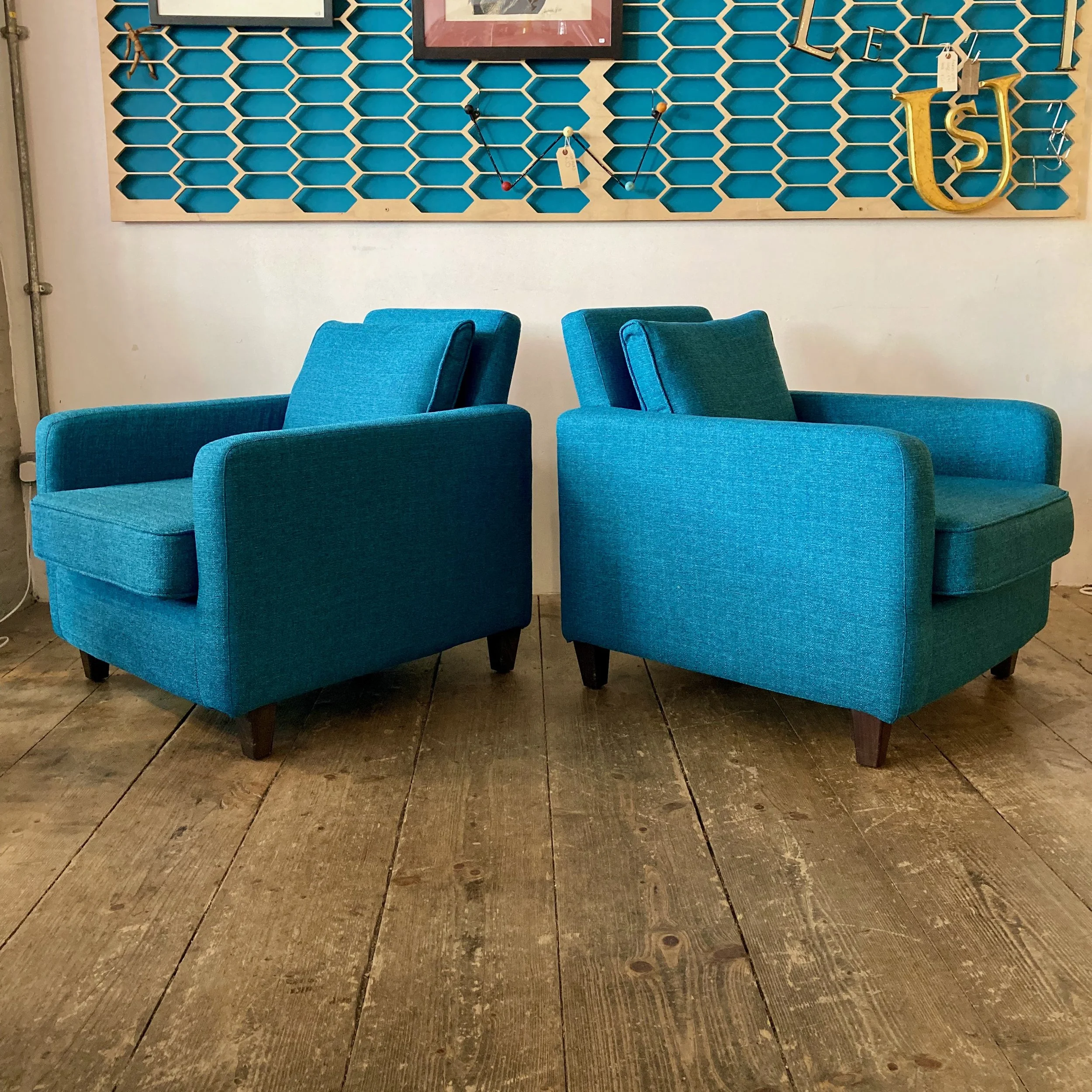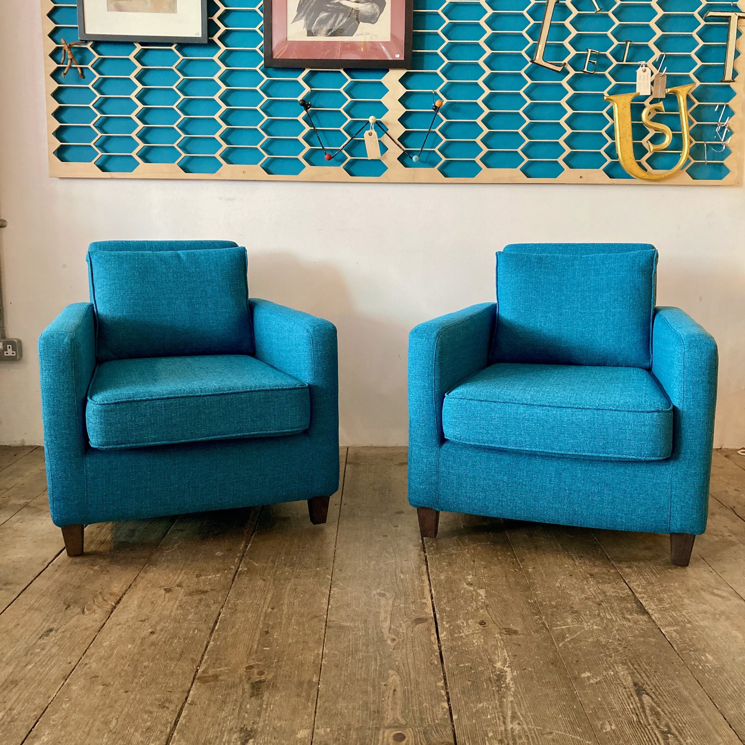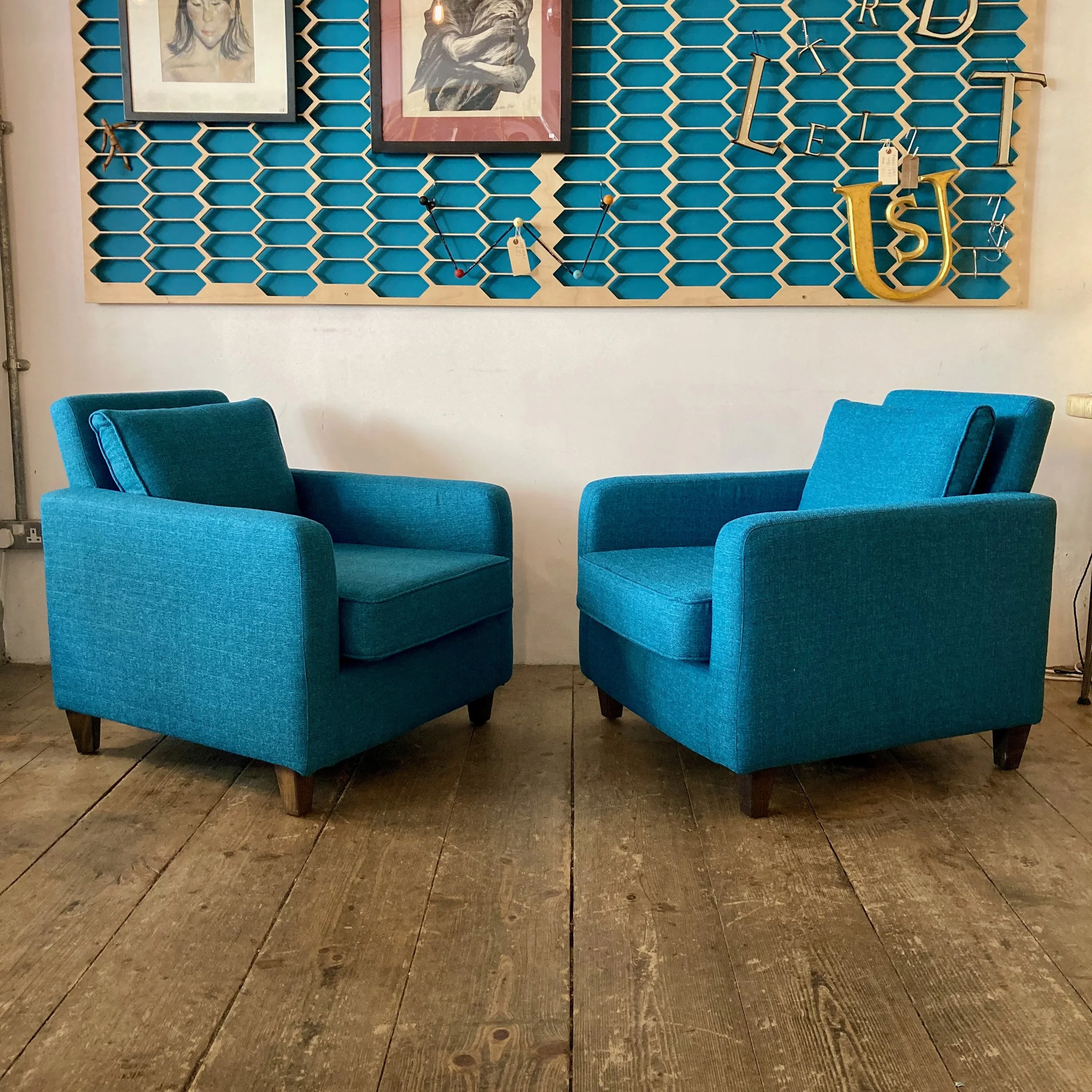 A stylish pair of vintage Habitat home furnishings brand armchairs, thoughtfully refurbished and reupholstered in a soft teal fabric. With their generous proportions and inviting shape, they offer both comfort and understated retro appeal—ideal for a relaxed living space or reading corner.