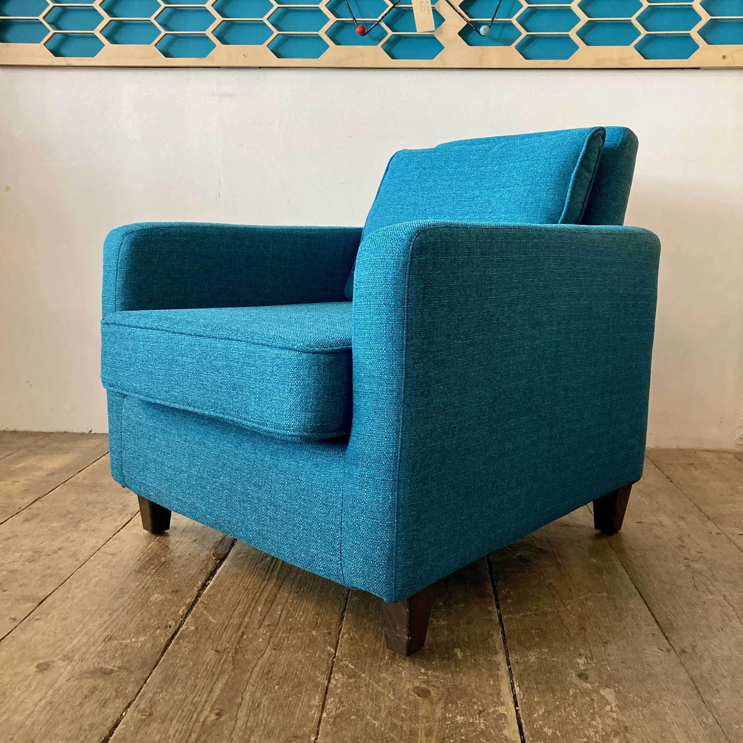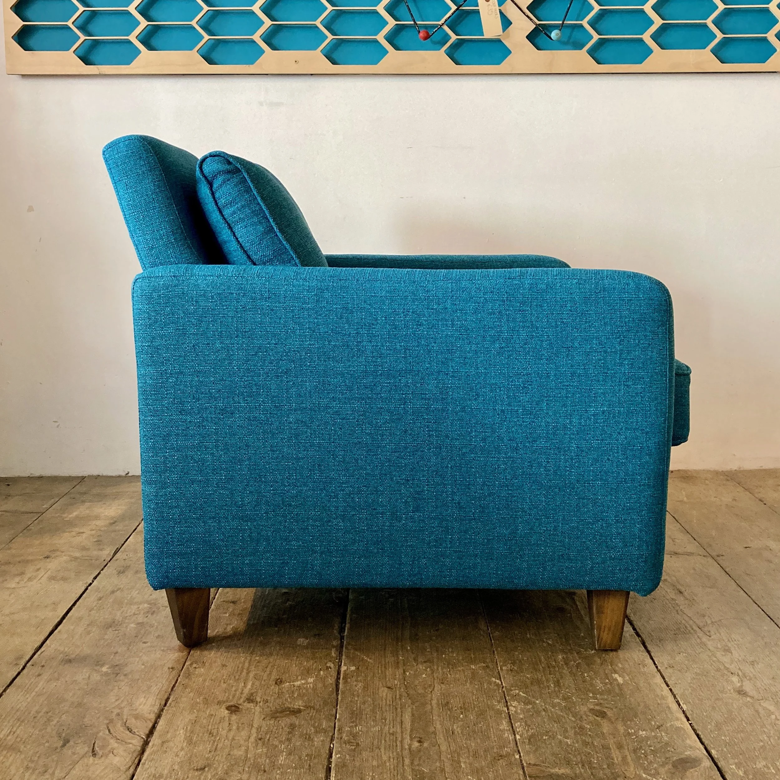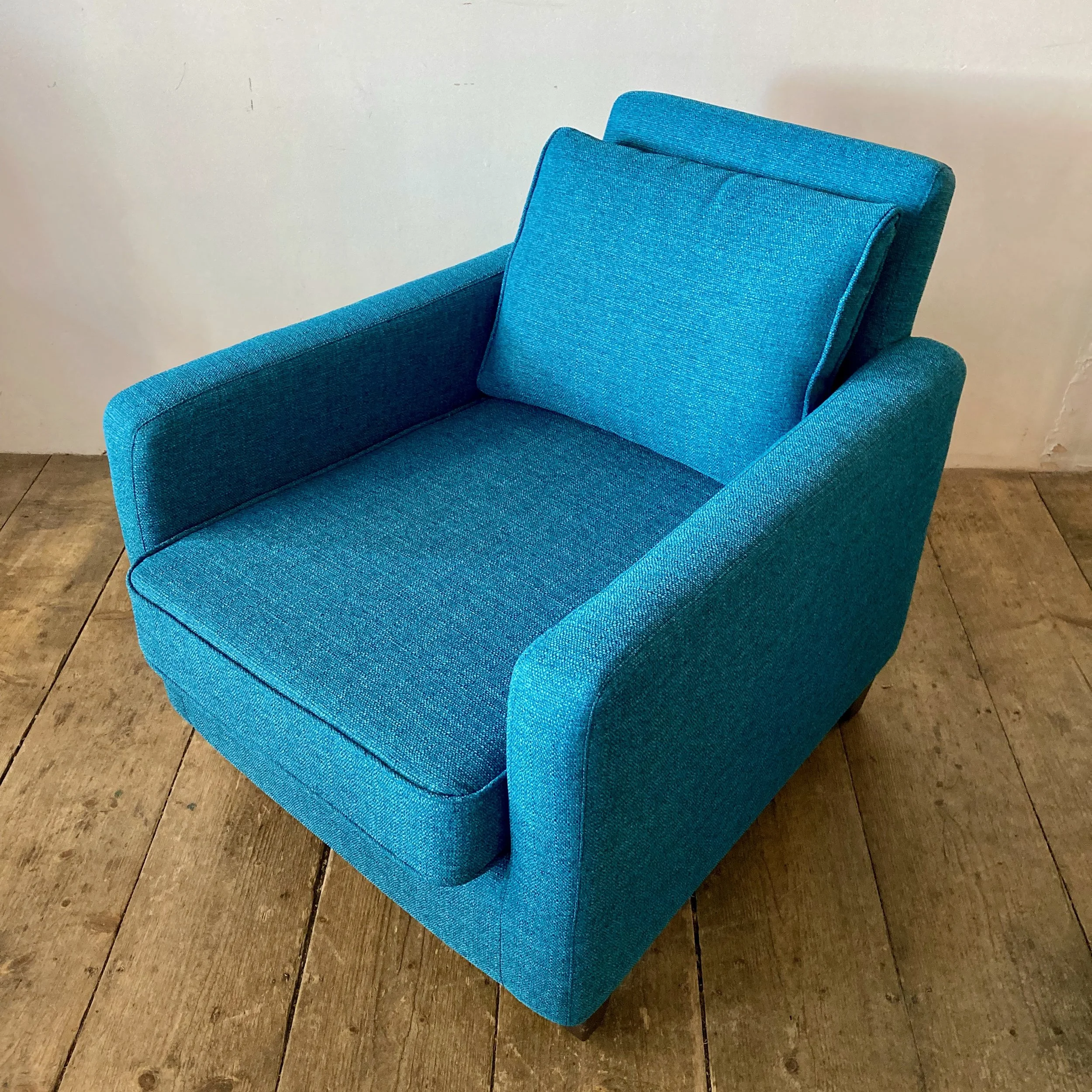 A stylish pair of vintage Habitat home furnishings brand armchairs, thoughtfully refurbished and reupholstered in a soft teal fabric. With their generous proportions and inviting shape, they offer both comfort and understated retro appeal—ideal for a relaxed living space or reading corner.