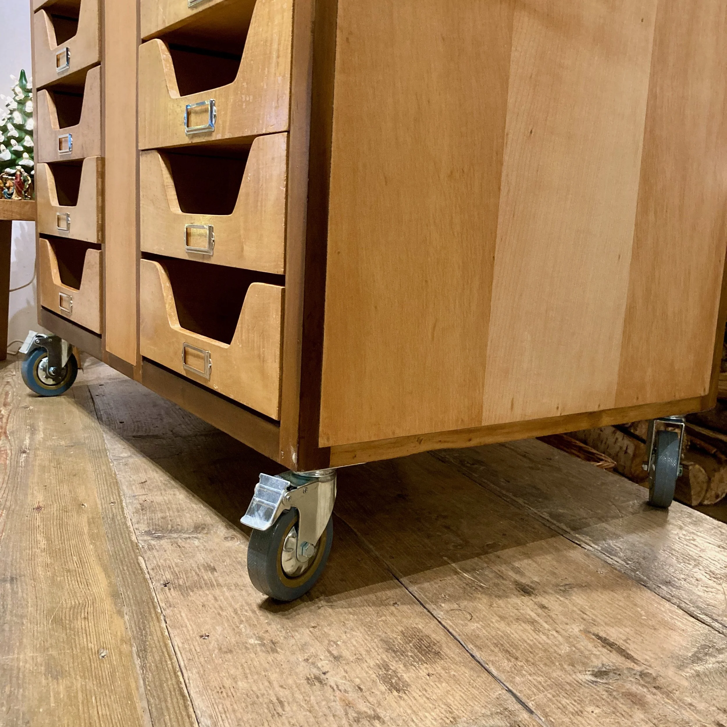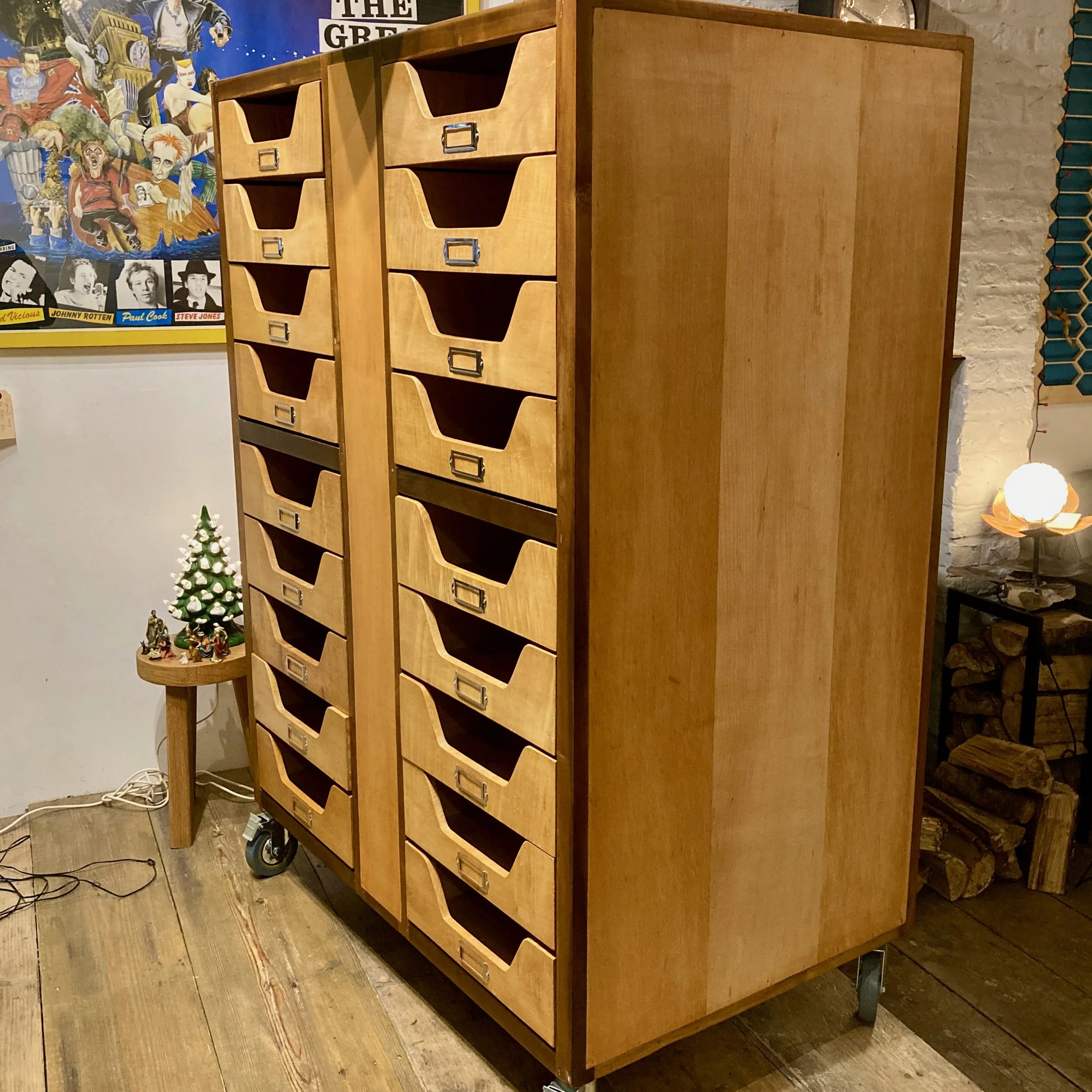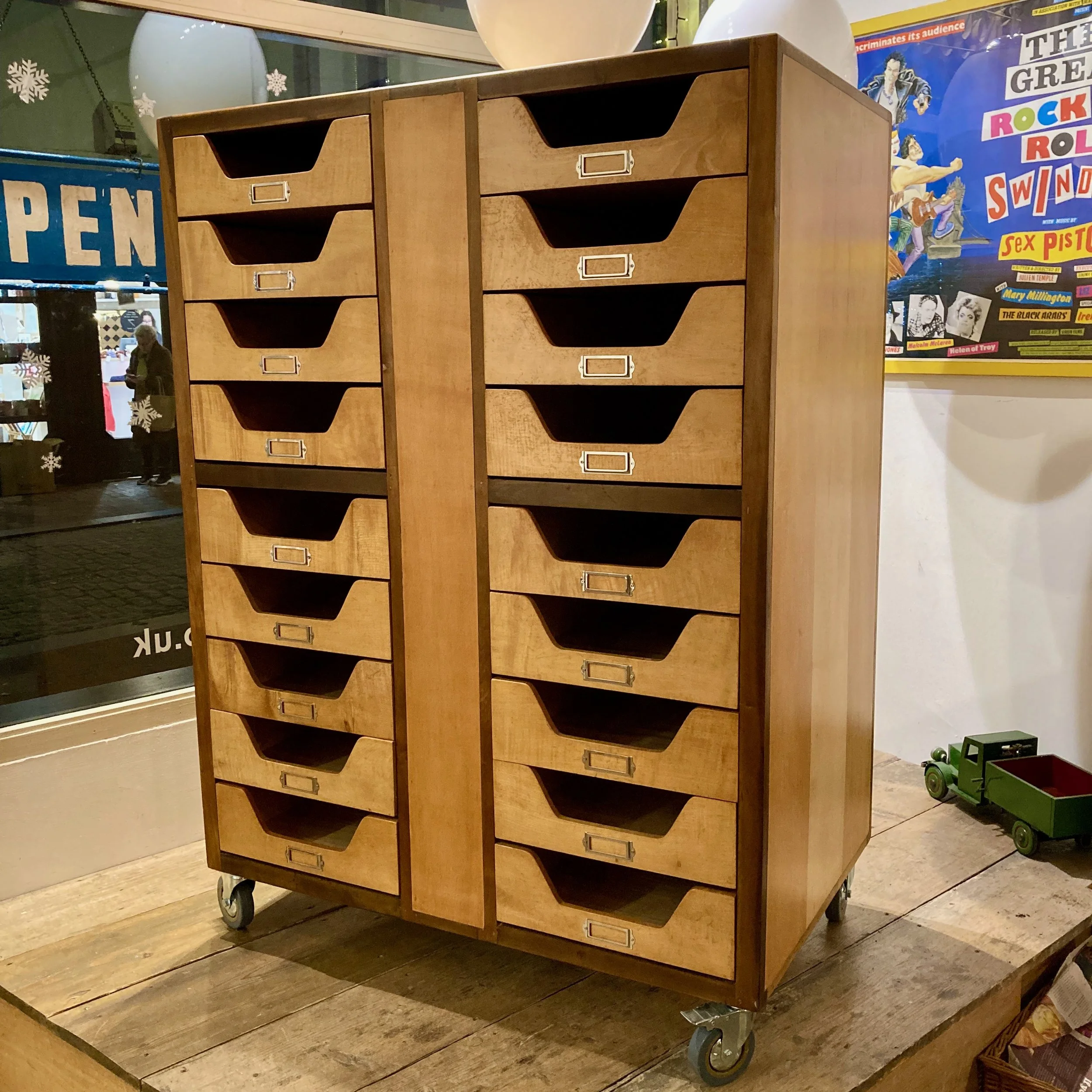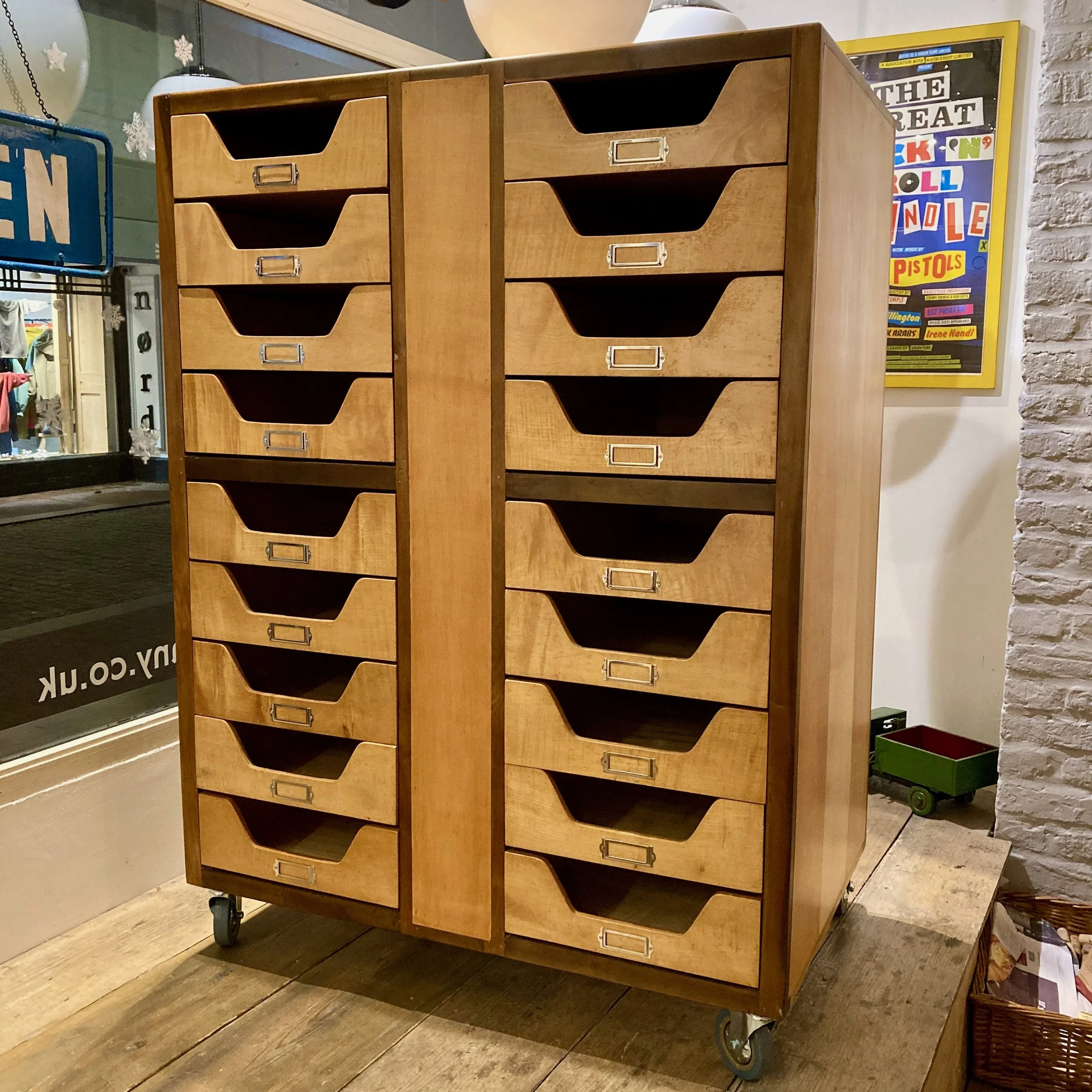 A characterful vintage 18-drawer cabinet, offering fantastic storage and organisation for home offices, studios or living spaces. Recently refurbished, this robust unit combines industrial charm with practical functionality.